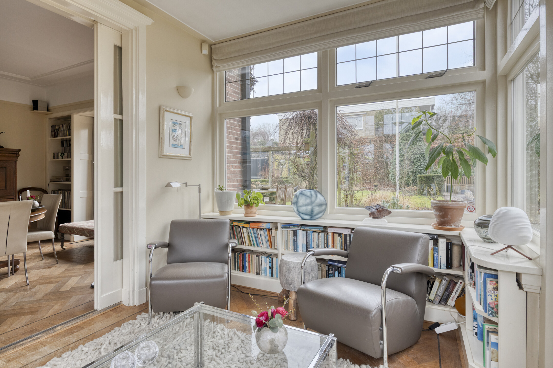 Life along Hoge Haerlaan means enjoying tranquility and space, with daily amenities close by. The ground floor welcomes you via a covered entrance and spacious vestibule, leading to a home office framed by an elegant bay window. The living room’s expansive windows and conservatory invite daylight and open outwards into the serene south east-facing garden, enriched with multiple terraces and layered greenery. A fireplace-warmed kitchen features high-end appliances and opens onto a covered terrace. Practical spaces extend to a larder-height cellar, utility room, and ample garage.