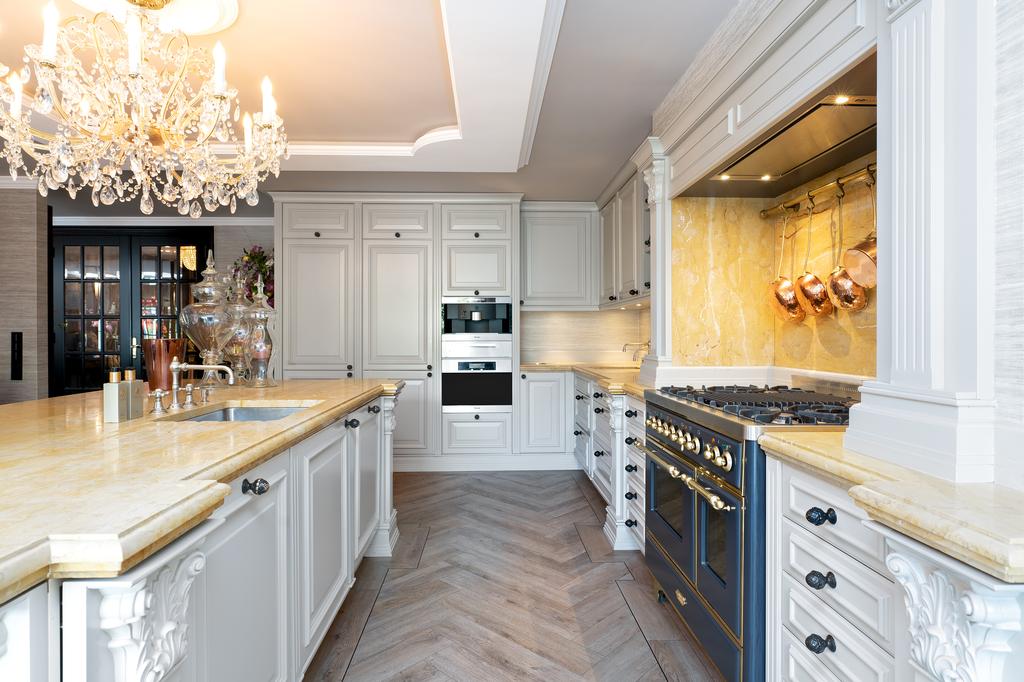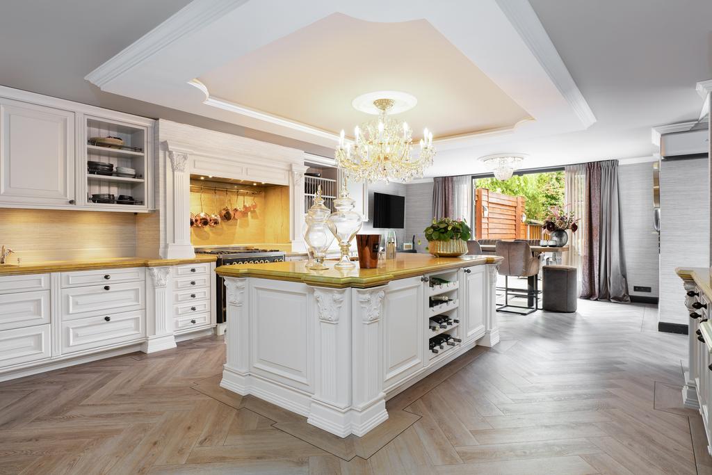 The grand entrance hall, with a built-in wardrobe and guest toilet, leads to the spacious country-style kitchen, equipped with a cooking island, china cabinet, and high-end built-in appliances, including two dishwashers, two refrigerators, two freezers, two combination convection ovens, and a five-burner Boretti stove. Double French doors from the kitchen, living room, and pool area open directly onto the beautifully landscaped backyard.