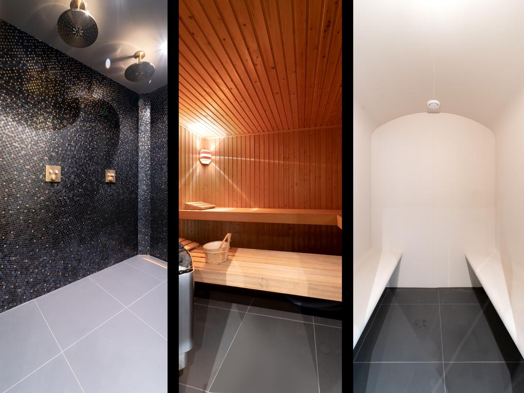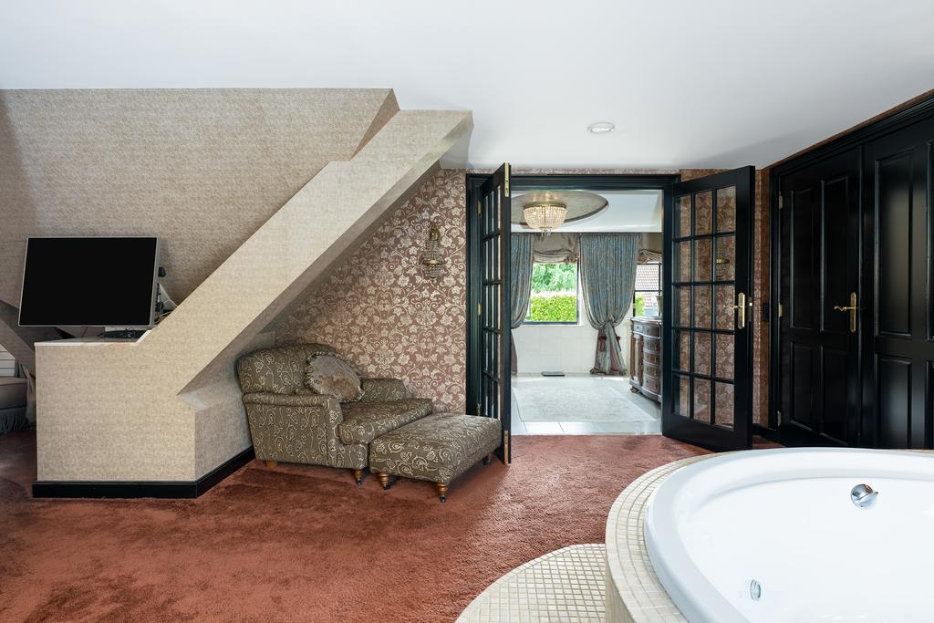 The first floor boasts three spacious bedrooms, each with a private bathroom. The master suite is in a league of its own, featuring a freestanding round bathtub, an en-suite bathroom with a toilet, an exclusive antique vanity (Pander) with double sinks, and a spacious walk-in shower. The suite also has direct access to the wellness area on the ground floor via a private staircase. A true eye-catcher is the impressive 50 m² walk-in closet, complete with a custom wardrobe system, mirrors, atmospheric lighting, and a marble floor. All bedrooms are equipped with air conditioning.