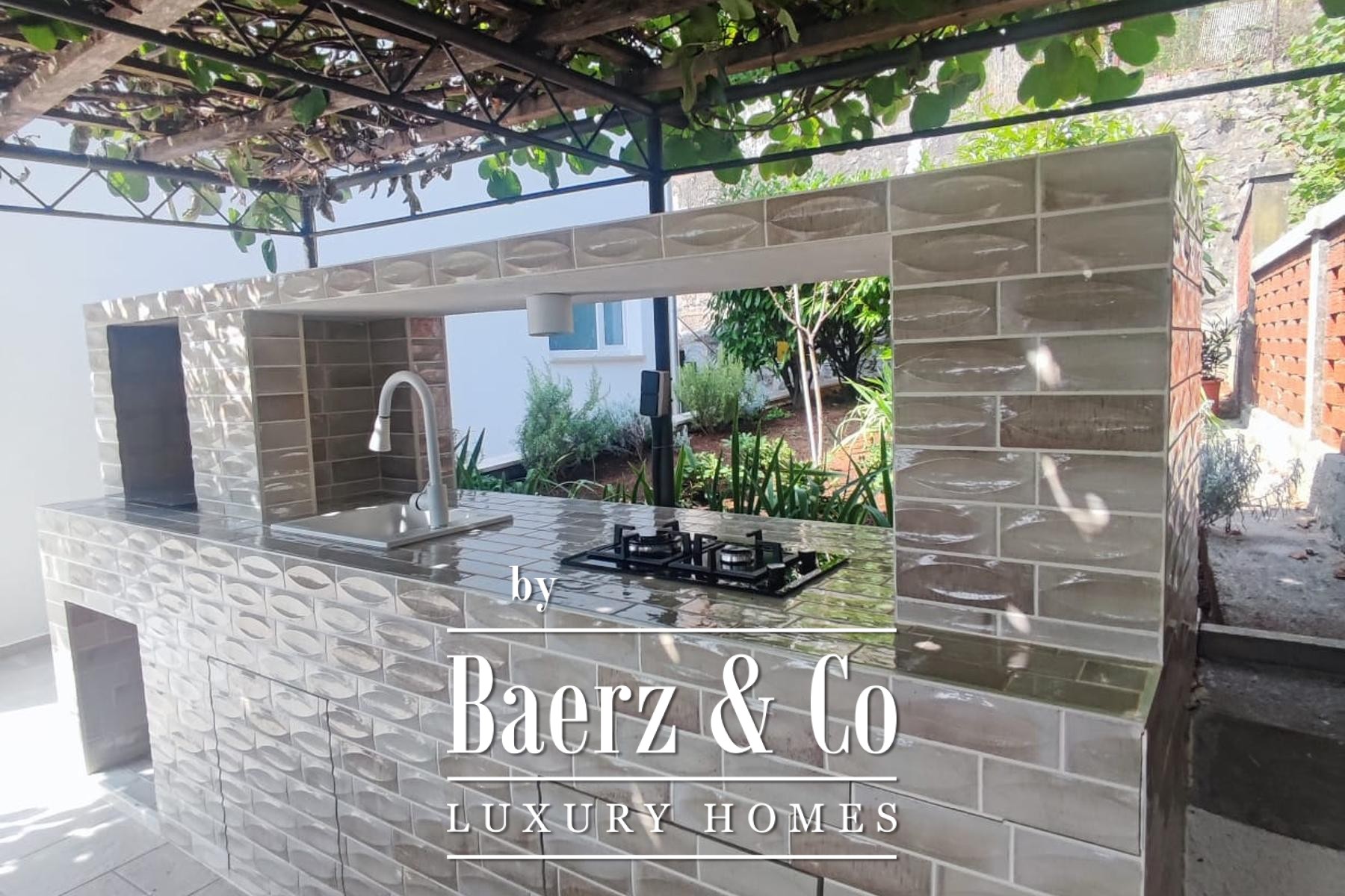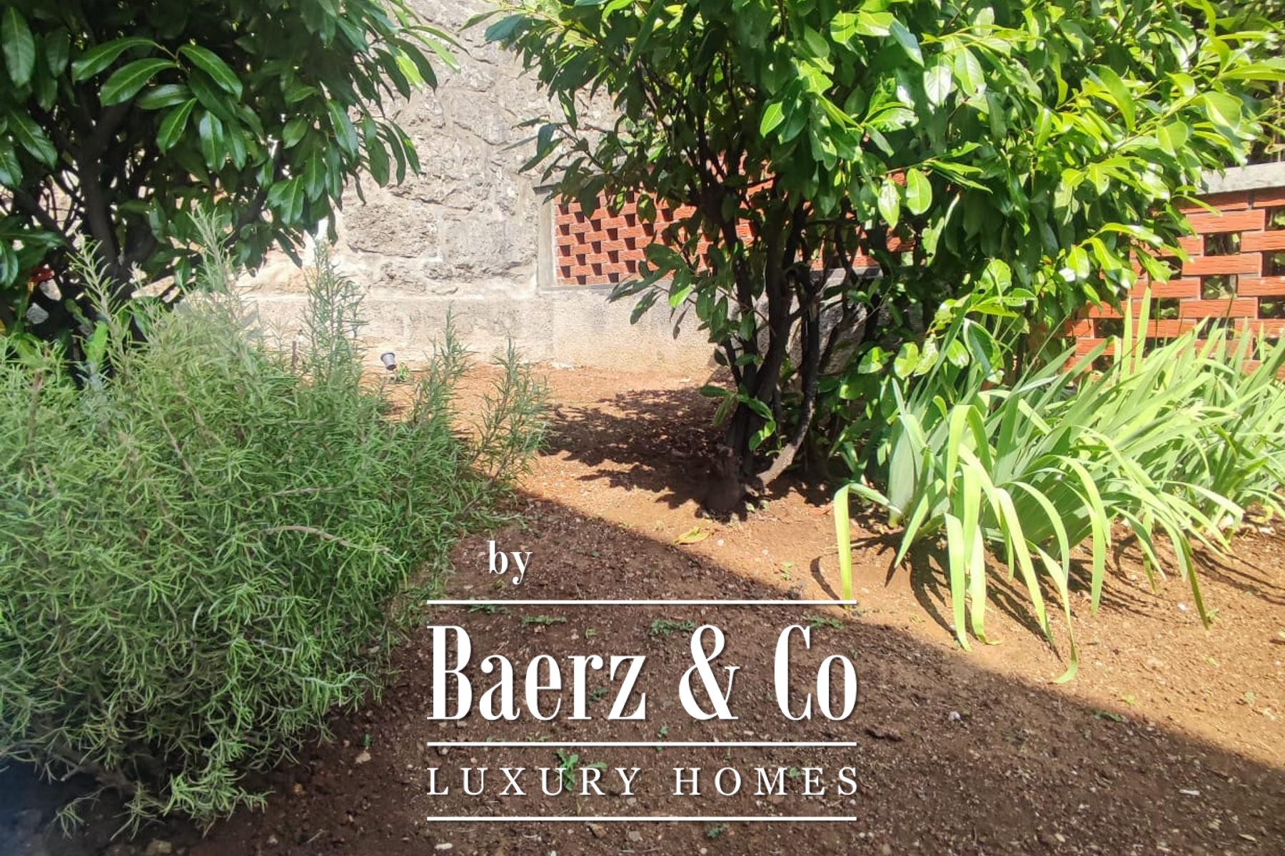 Mediterranean light pours across the generous terraces. One is home to a summer kitchen, shaded by a pergola and draped in greenery, while the garden below unfolds over a 422 m² plot. Lavender, rosemary, fig, and mandarin trees lend the air a subtle fragrance and foster a quiet sense of place. Five bedrooms and five bathrooms allow for flexible accommodation and privacy.