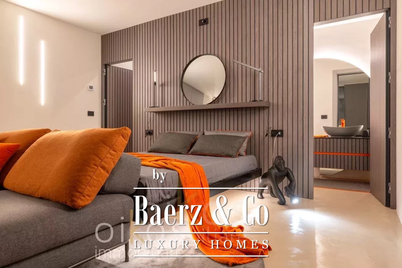 Across 100 square meters of living space arranged over two levels, the interior is realized in sophisticated gray tones, natural finishes, and custom-made furnishings. Suspended beds in the upper level’s two bedrooms, Alpi composite wood paneling, and en-suite bathrooms with high-quality materials lend a calm measure to daily life. A handcrafted kitchen with brushed ash and HPL countertops, punctuated by a warm gray and orange palette, anchors the home’s social spaces. Floor-to-ceiling glass in the living area frames the surrounding gardens and hills, infusing the interiors with southern light.