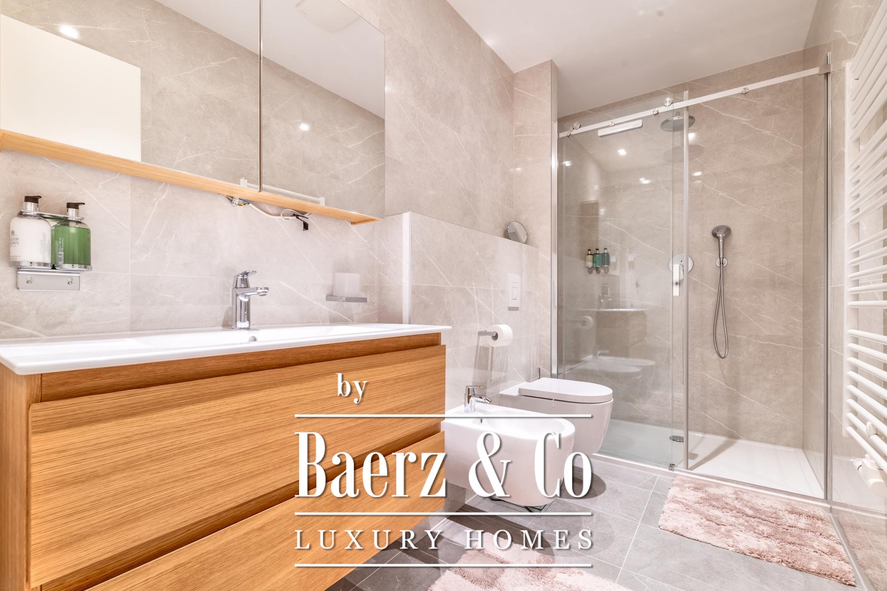 The apartment embodies contemporary design and superior build quality. Its open-plan layout forms a central heart, with a custom-made kitchen, dining area, and living room that flow seamlessly onto the private loggia. The master suite includes an en-suite bathroom, while two further rooms serve flexibly as bedrooms or studies. Additional comforts include a separate guest toilet, laundry room, and precisely integrated built-in wardrobes.