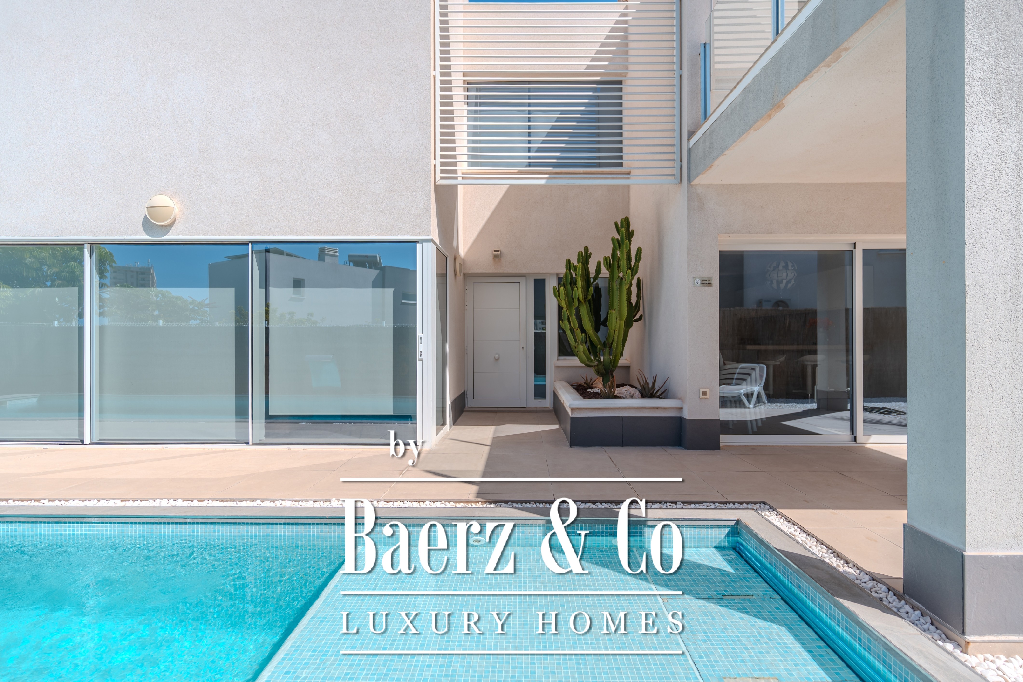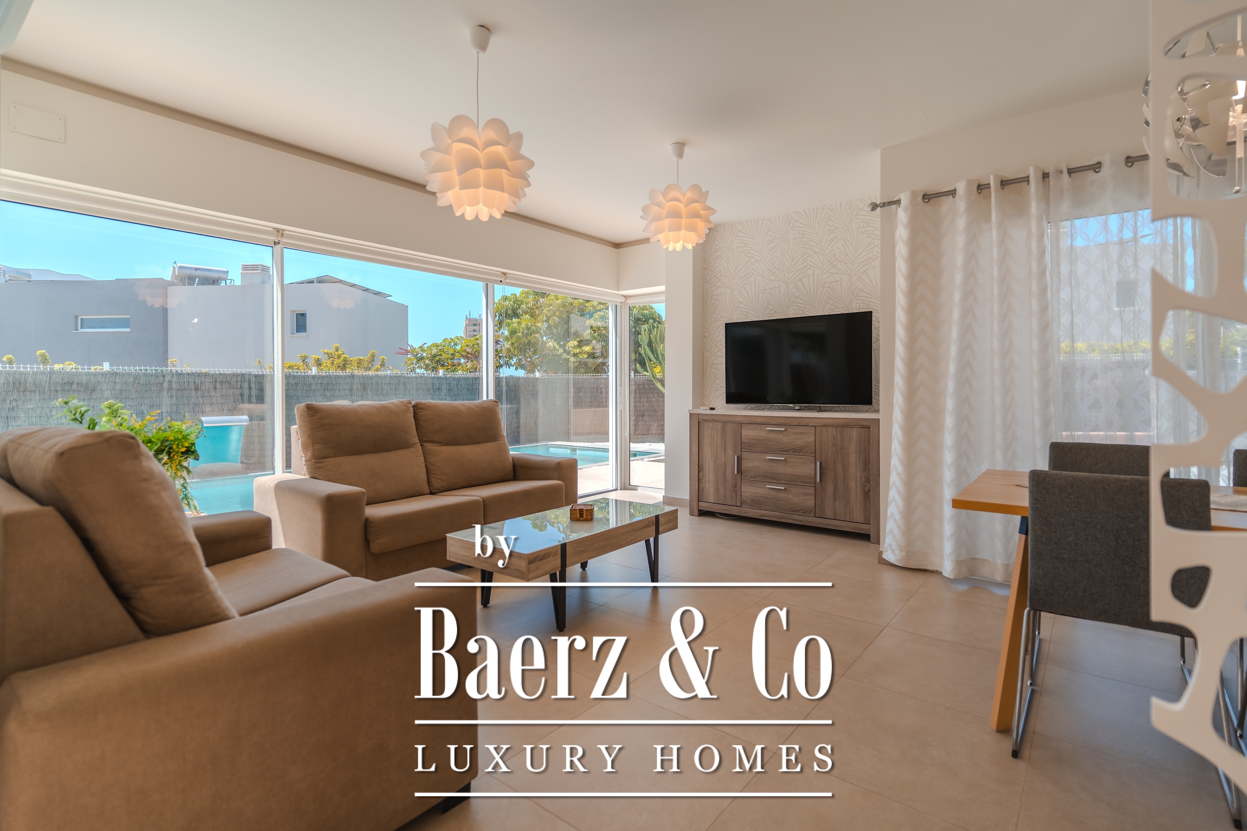 The villa is located in the gated residential complex “Nirvana Paraíso,” opposite the Las Rosas shopping centre with shops, bars, and restaurants. The beach Playa de las Galgas and the Hard Rock Hotel are about a 10-minute walk away.