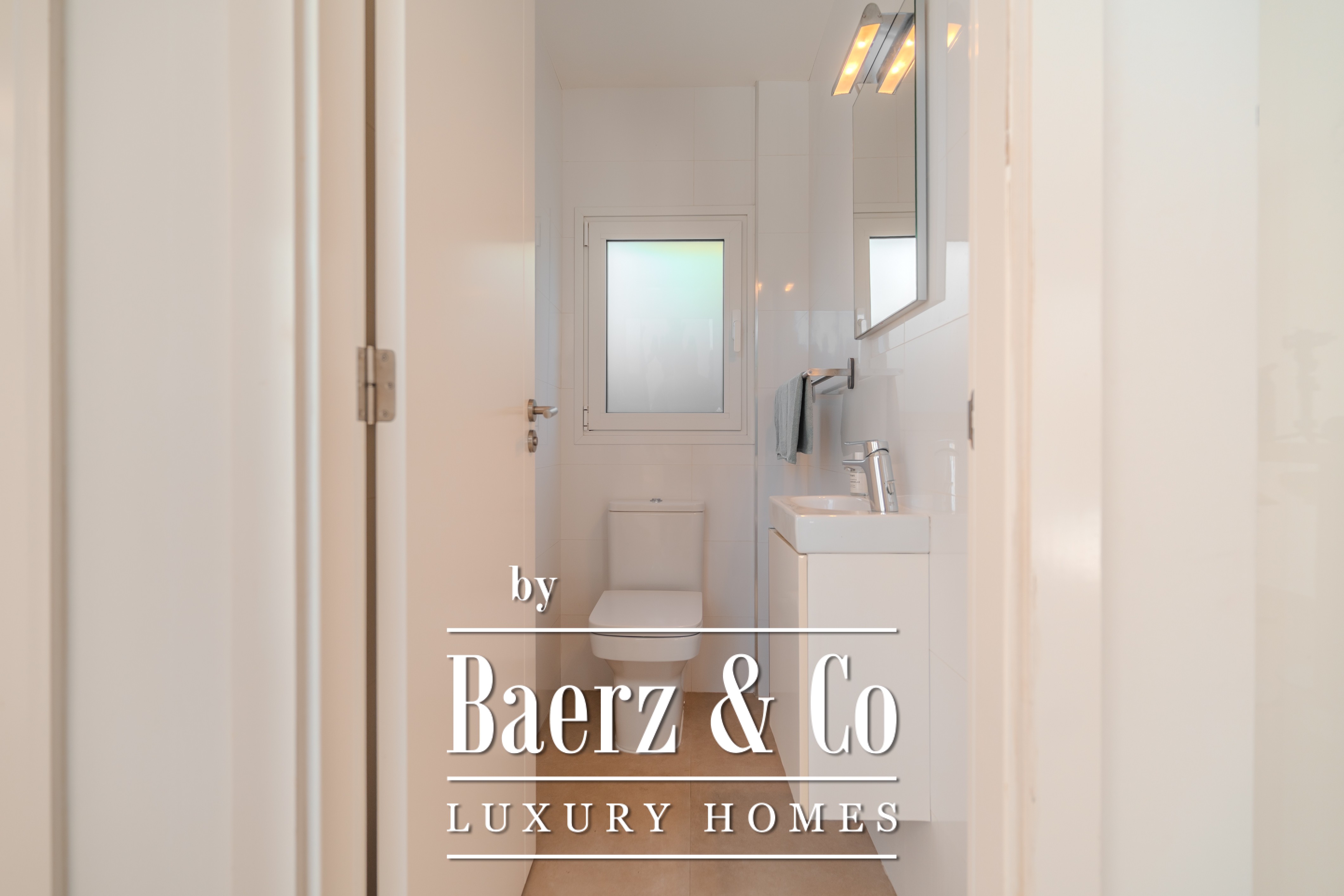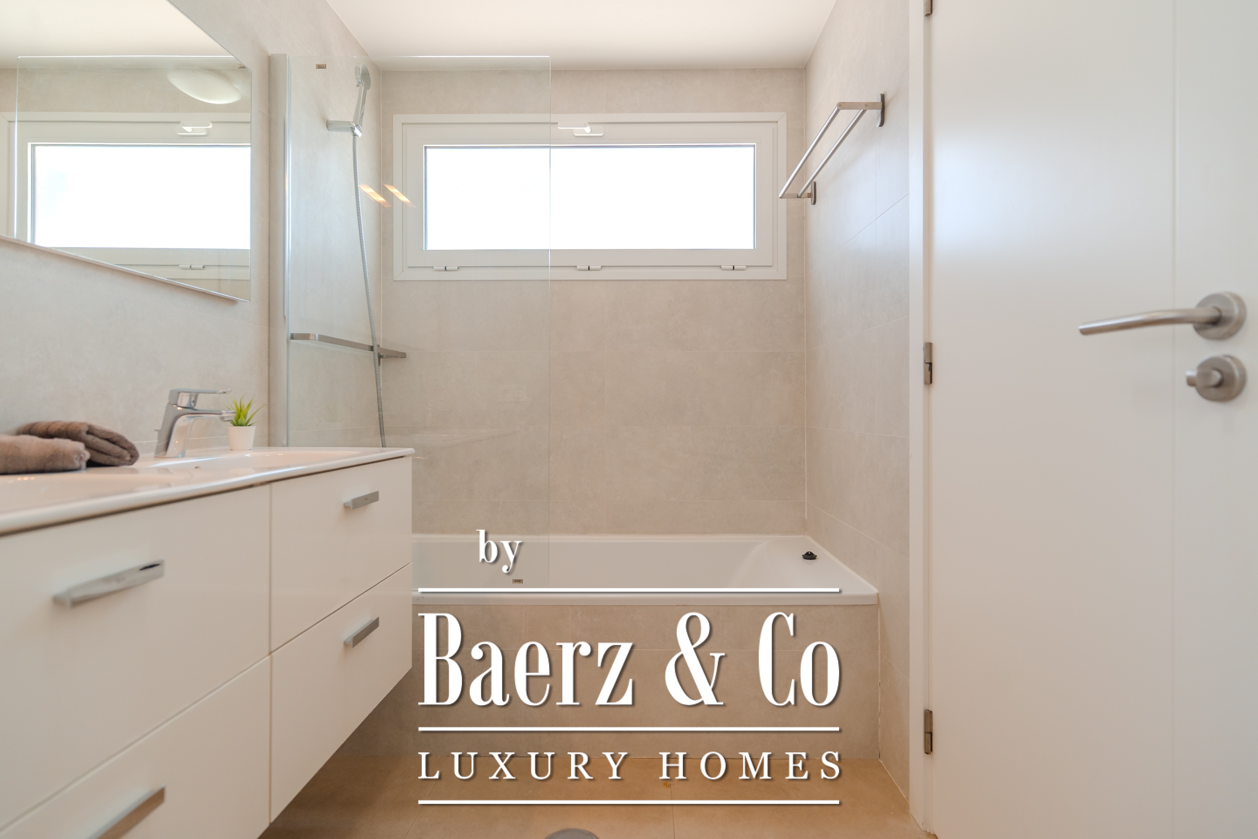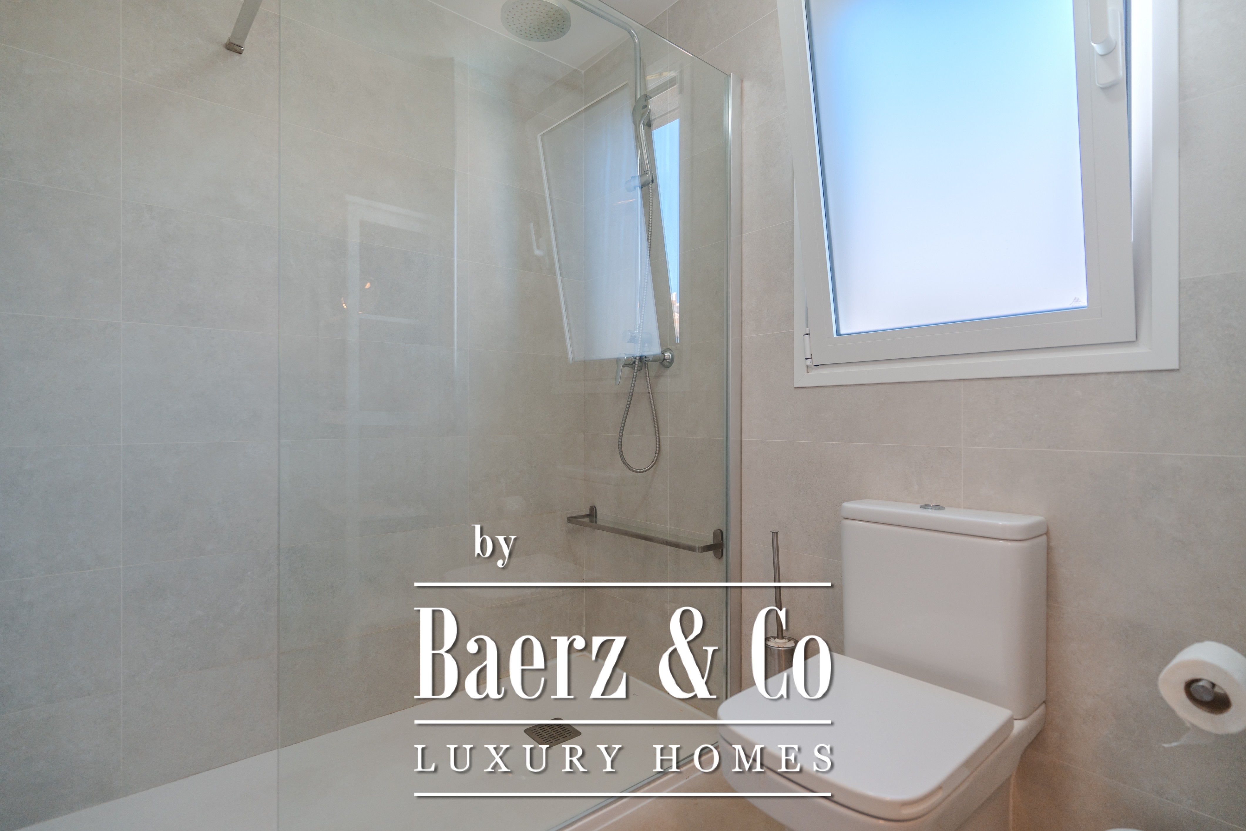 This modern villa offers a bright and comfortable living space on a 386 m² plot and has a total built area of 146 m² (104 m² usable) distributed across two floors. The ground floor (80 m²) includes a living room, dining area, fully equipped kitchen, guest toilet, and storage room. The upper floor (66 m²) has 3 bedrooms with built-in wardrobes, two bathrooms (one en-suite), and an additional storage room. The main bedroom opens onto a terrace with partial sea views. The house is equipped with air-conditioning and solar panels for hot water.