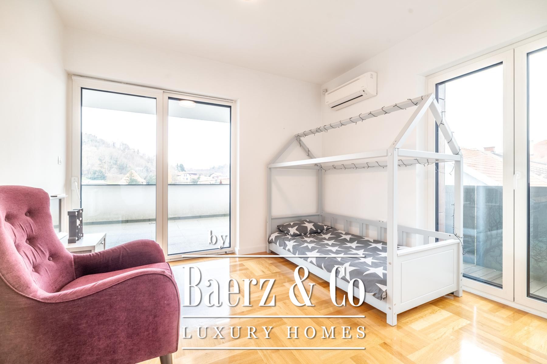First-class materials, including travertine stone and stone-clad bathrooms, are paired with aluminum triple-glazed windows, air conditioning, and integrated security systems. The atmosphere is refined yet welcoming, with thoughtful attention to privacy and natural light. Local amenities such as boutiques, cafes, and renowned dining at Okrugljak are within easy reach. The villa’s position combines tranquil, green surroundings with proximity to urban life, encapsulating the rhythm of contemporary living in Podsljeme.