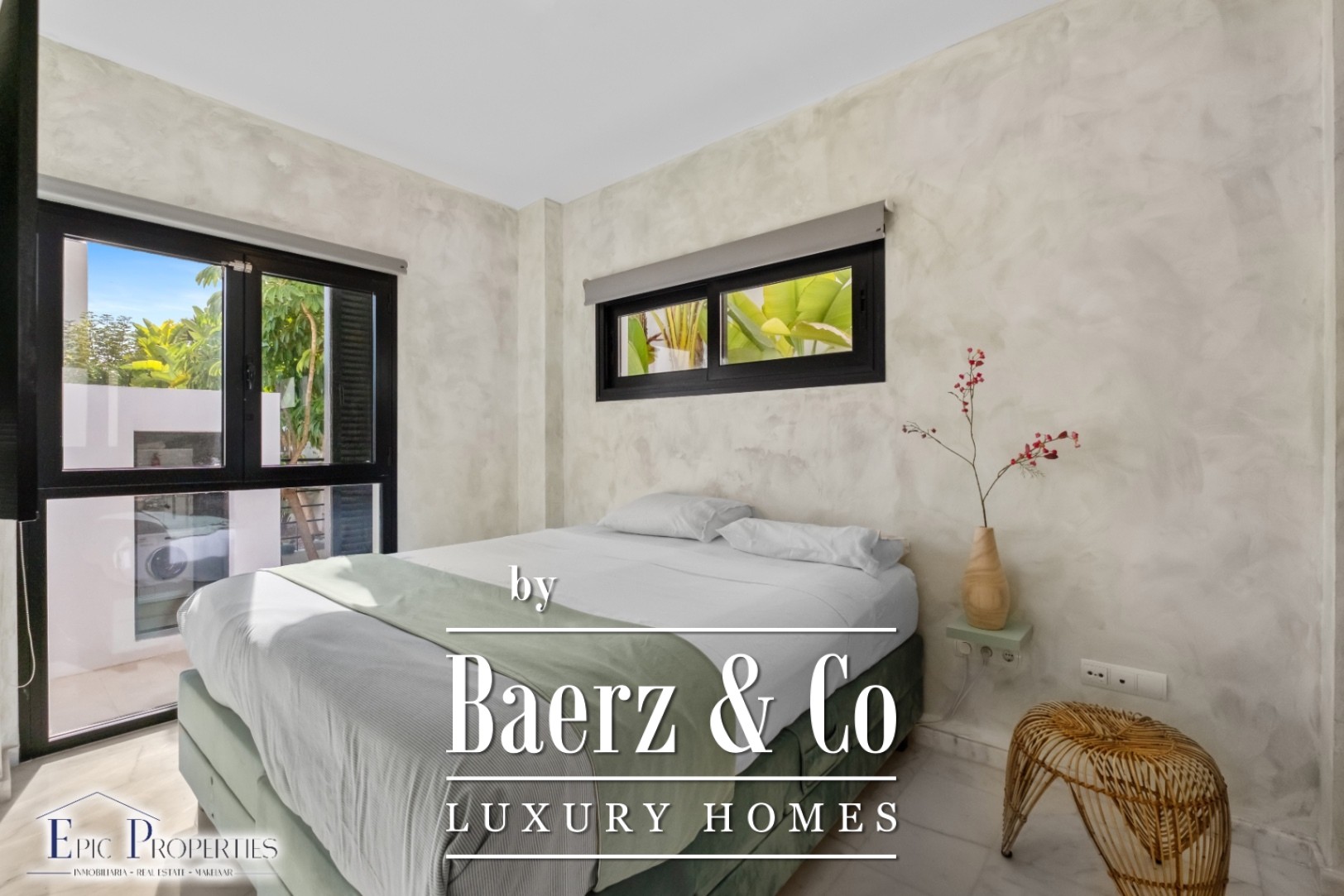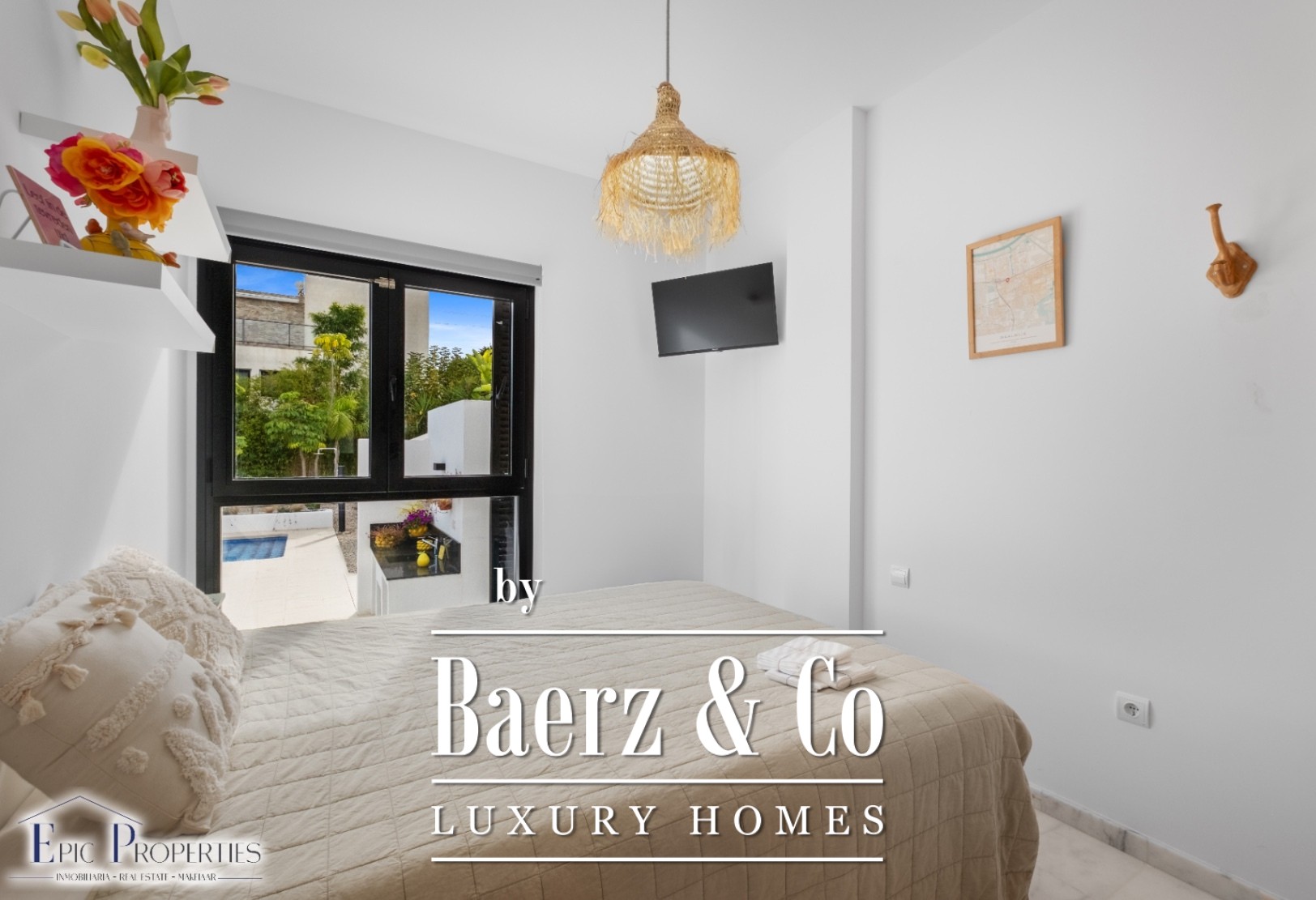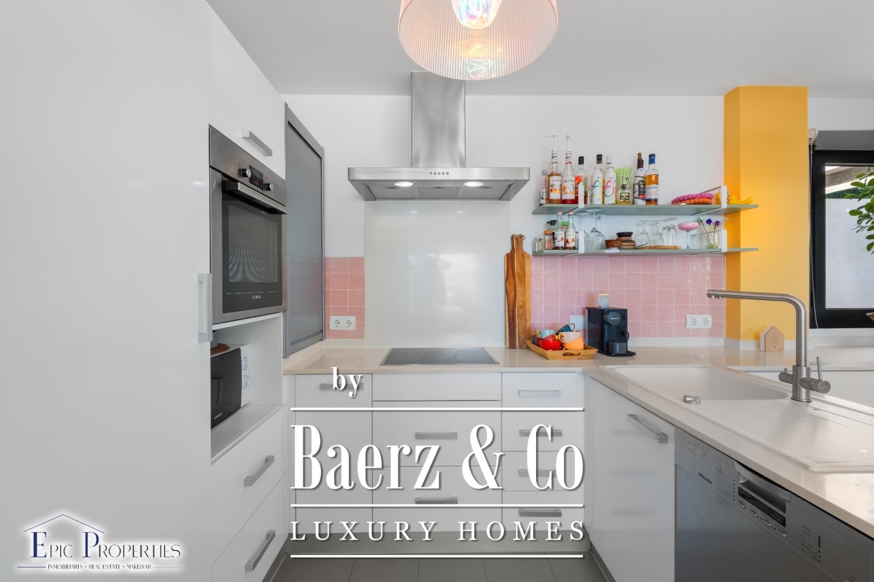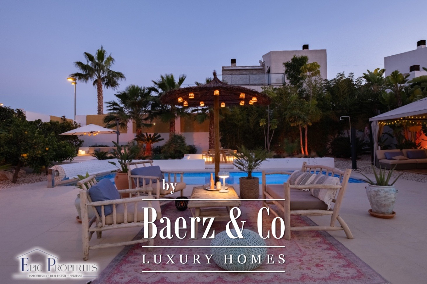This villa Polop stands in a tranquil residential setting, offering a seamless interplay of natural light, volume, and privacy. The 114 m² home is thoughtfully arranged across a single floor, set on an 820 m² plot that encourages both seclusion and openness. High ceilings and marble flooring set a dignified atmosphere throughout the spacious interior.