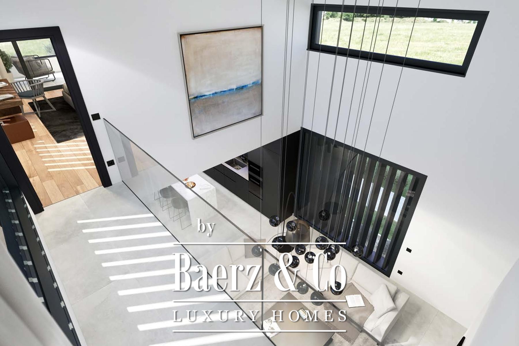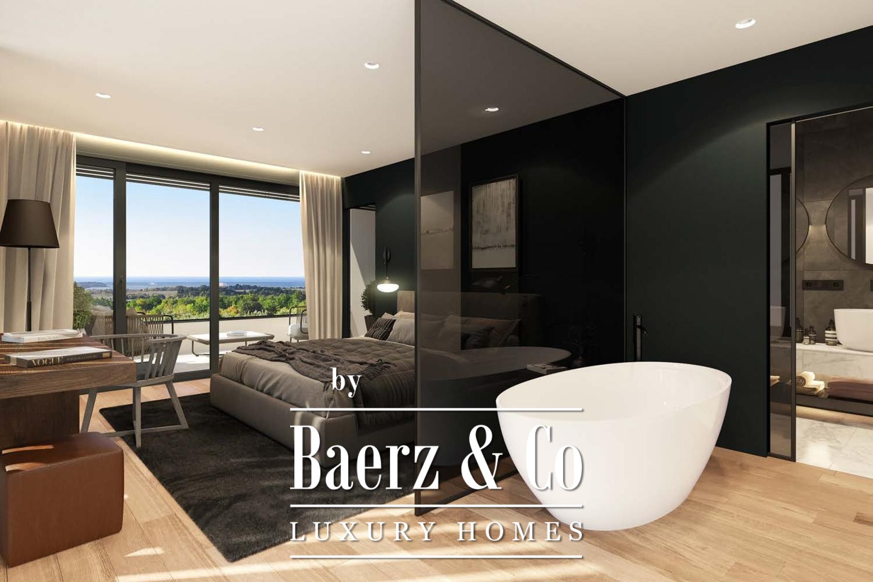 Spanning 213 m², this property is thoughtfully arranged over two levels. The ground floor centers around a spacious, open-plan living area with a kitchen island and dining space, where expansive glass walls invite natural light and connect the interiors to a covered terrace and landscaped garden. The layout includes a bedroom with ensuite bath and walk-in wardrobe, a guest toilet, laundry, and technical room. Upstairs, three luxurious bedrooms each feature a private bathroom, walk-in wardrobe, and access to wide sea-facing terraces.