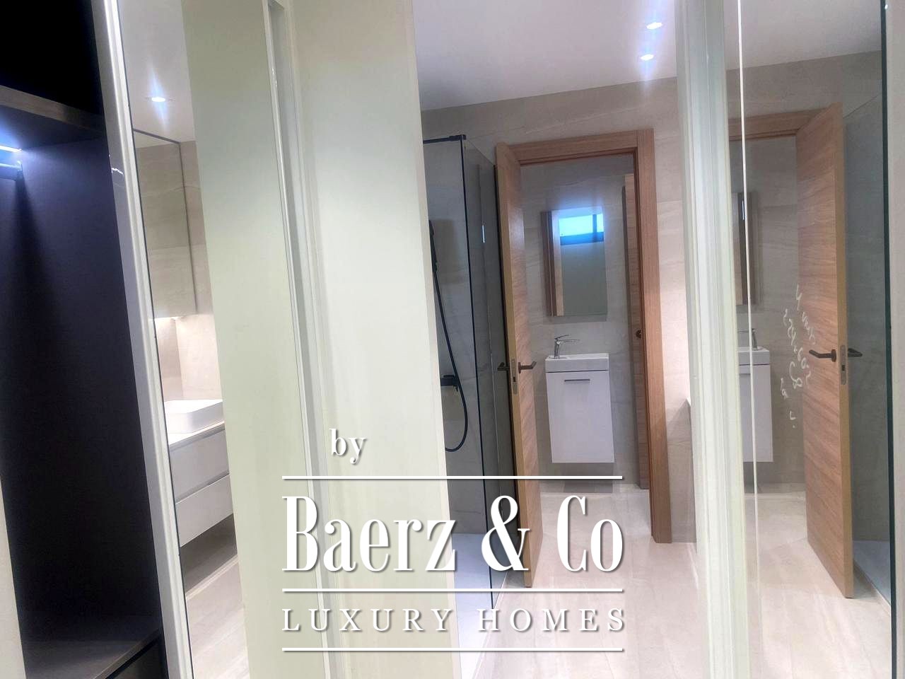 Inside, an open-plan living and dining area integrates the fully equipped kitchen, fitted with top-quality appliances and large windows that flood the space with natural light. There are two double bedrooms, each with its own walk-in wardrobe and en-suite bathroom. The second bathroom has a separate toilet, which can also be accessed from the living room, allowing it to be used as a guest WC.