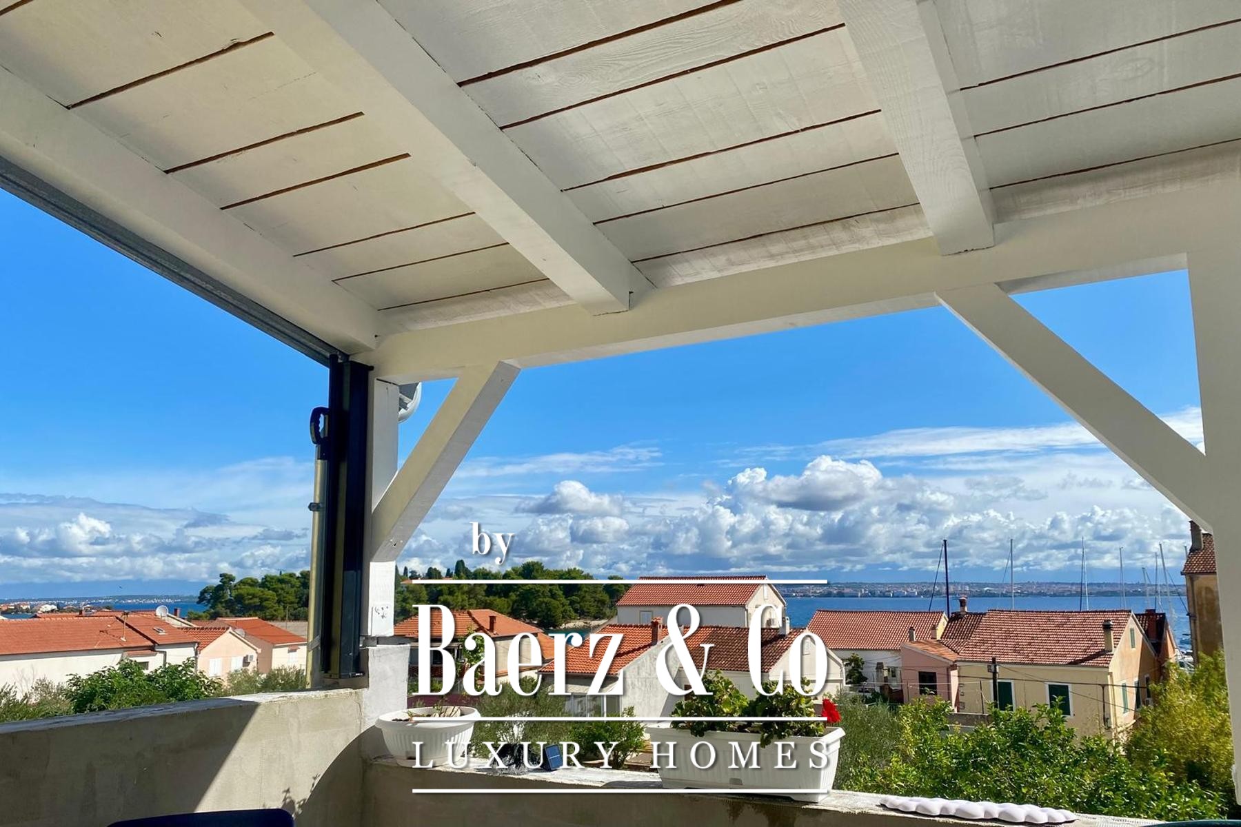 The ground floor features an open-concept living, dining, and kitchen area, complemented by three bedrooms, a bathroom, guest toilet, and a generous terrace ideal for outdoor dining. The apartment on the second floor measures 50 m² and includes two bedrooms, a bathroom, and a modern kitchen with access to a covered terrace overlooking the sea and Ošljak. The third unit, a two-story dwelling of 118 m², is high unfinished, with a main floor opening to a balcony with sea views and a roof terrace that offers panoramic outlooks over the water, Ošljak, and the city of Zadar.