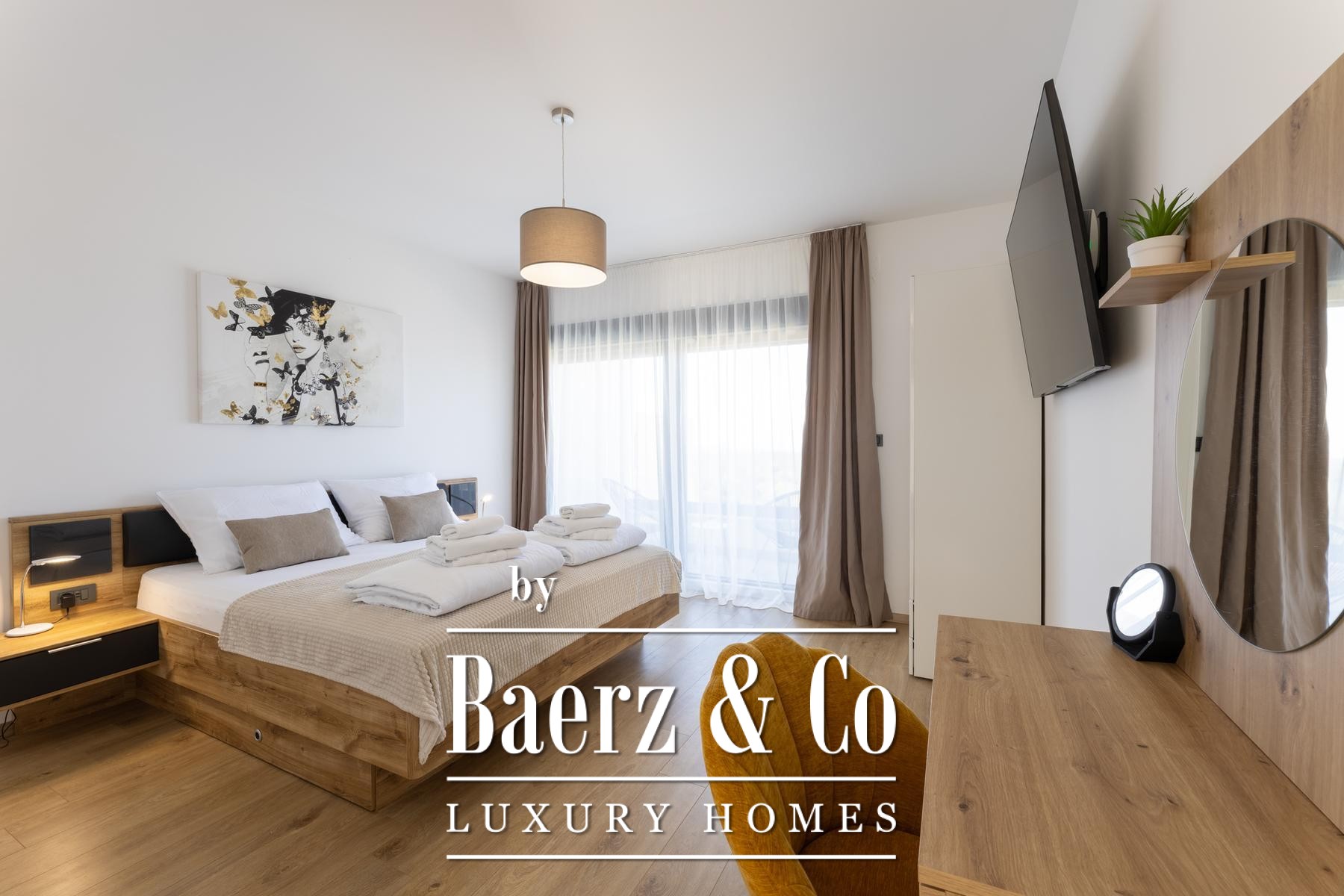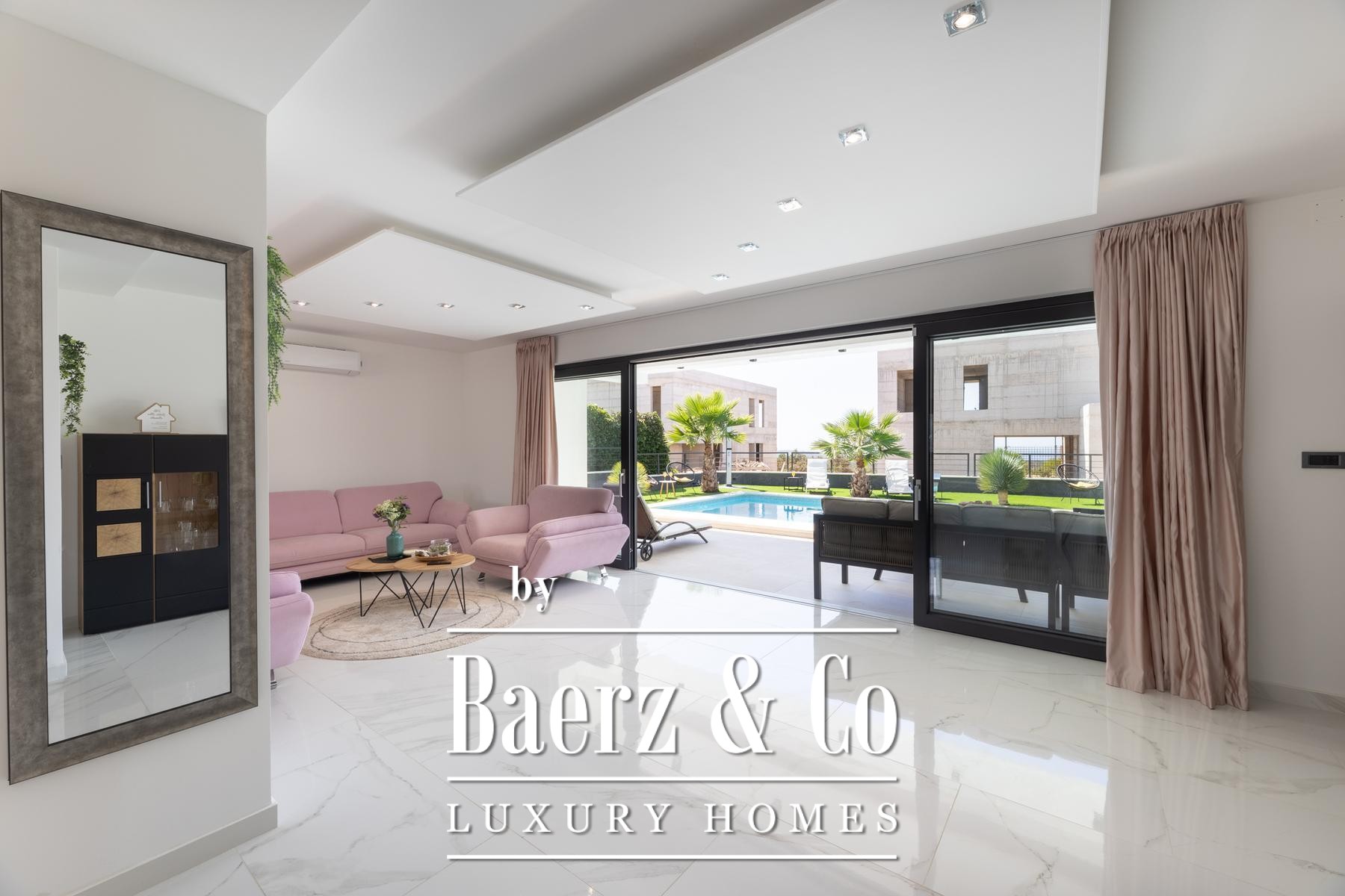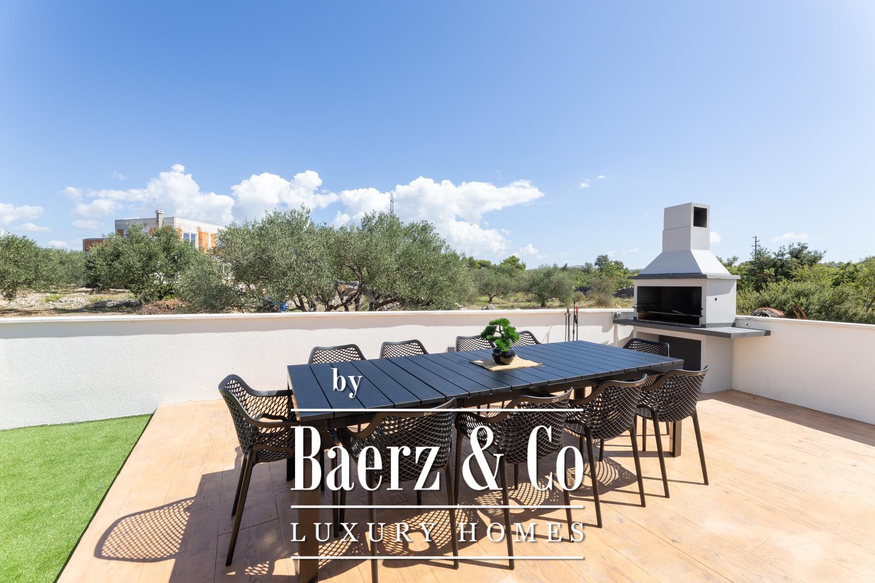 Villa Primošten with sea view presents a modern Croatian retreat defined by its 311.56 m² of refined living space and compelling Adriatic outlook. Completed in 2024 on a 515 m² plot, this residence articulates contemporary architecture across three thoughtfully arranged floors. The main level flows from a light-filled living room into a kitchen and dining area, accompanied by a bedroom suite and a separate wellness room with a sauna. Expansive glass doors open onto a sheltered terrace beside the pool, where a counter-current swimming system invites leisure and fitness alike.