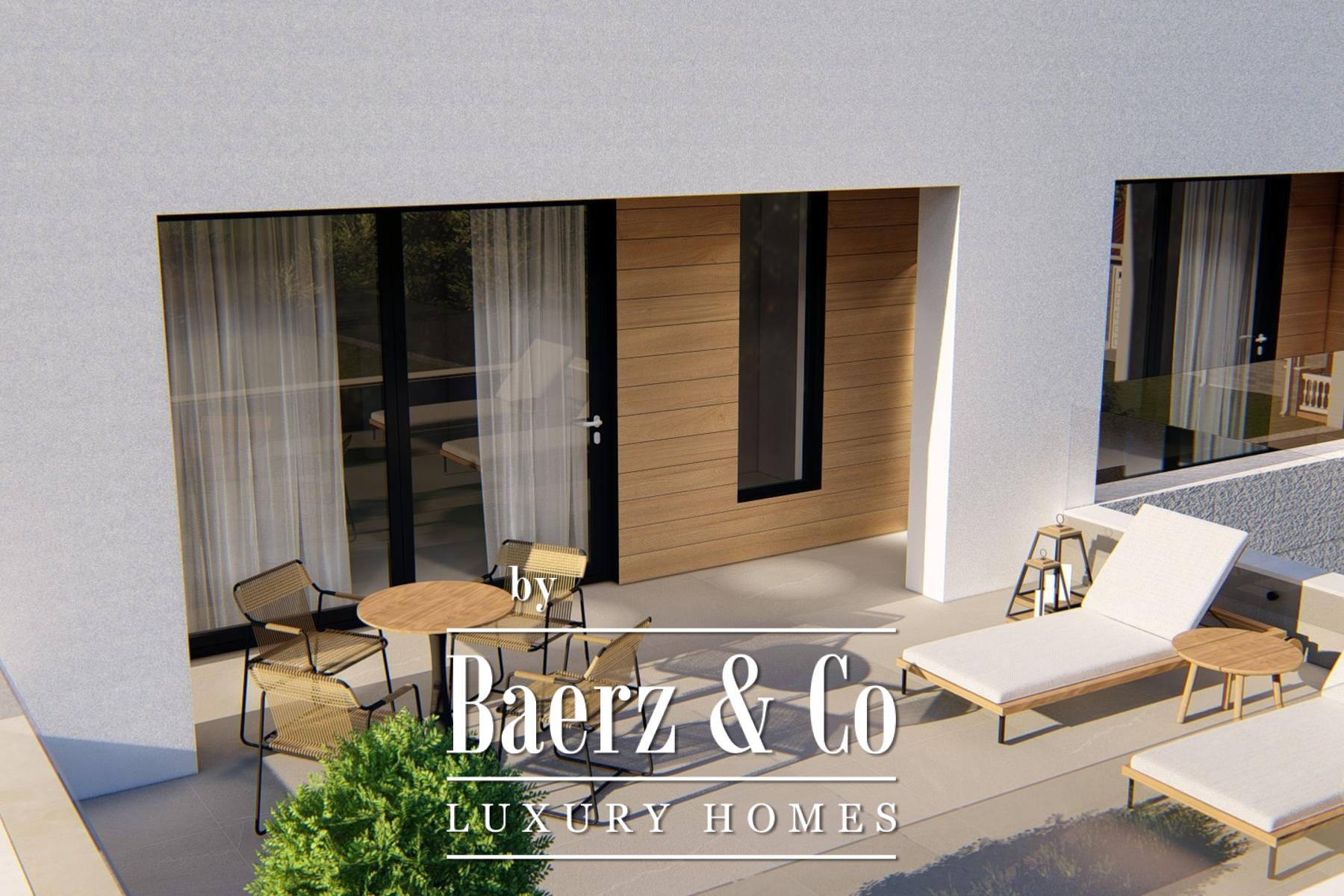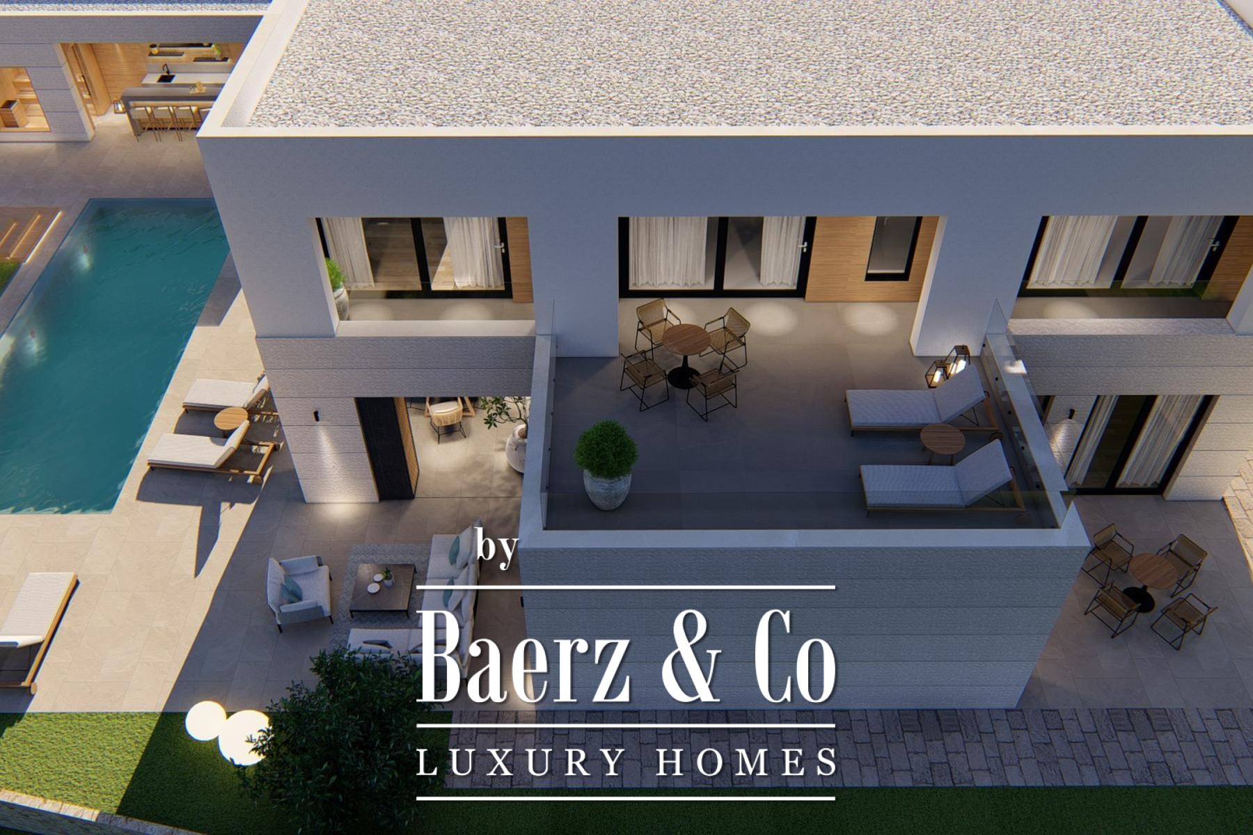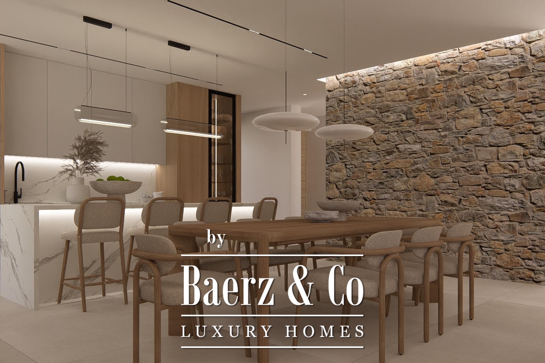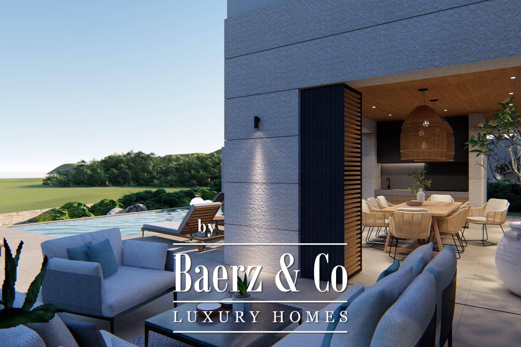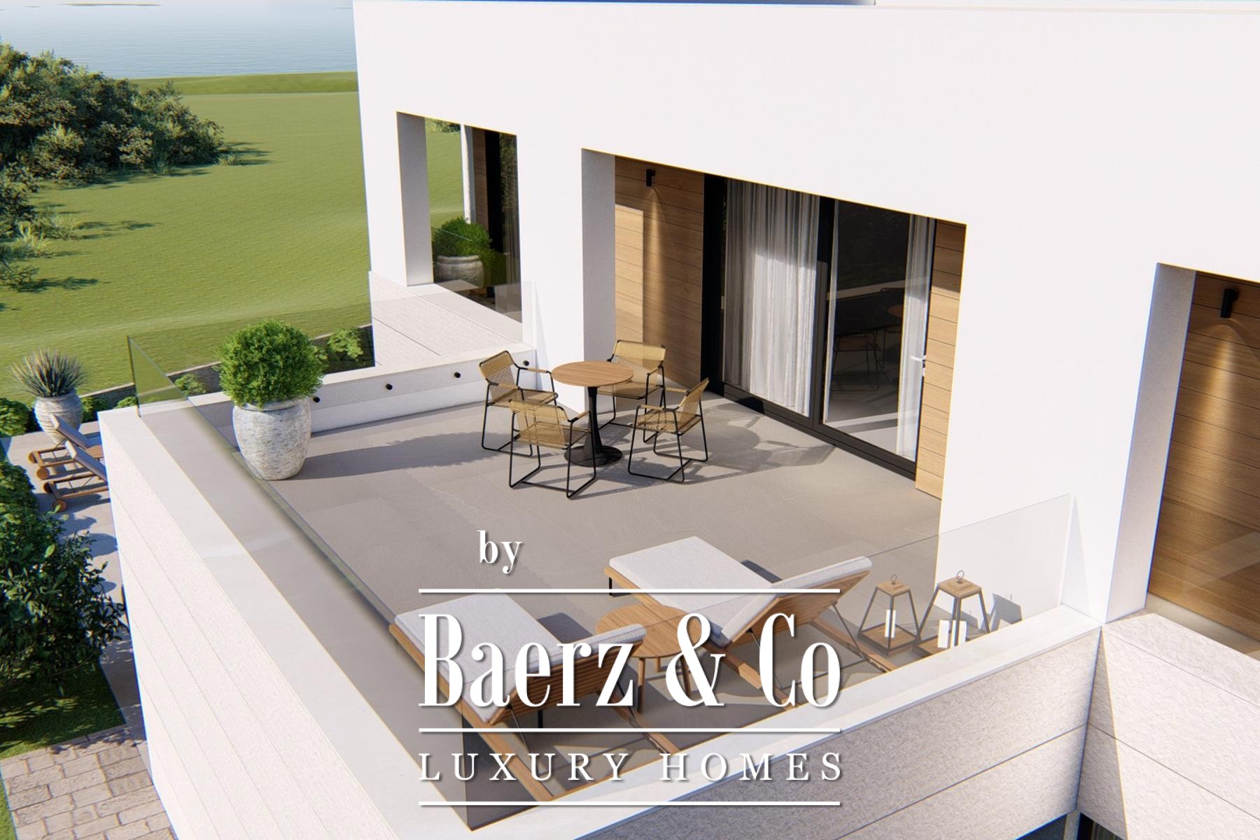 The main level welcomes you with an open living room, kitchen, and dining area, flowing onto a covered terrace with a barbecue. Here, expansive glass doors frame sea views and bring in natural light. The ground floor features one bedroom with its own private bathroom, while the first floor holds three further bedrooms, each with en-suite bathrooms and loggia access. The upper floor opens to a generous terrace, enhancing the flow between indoors and out.