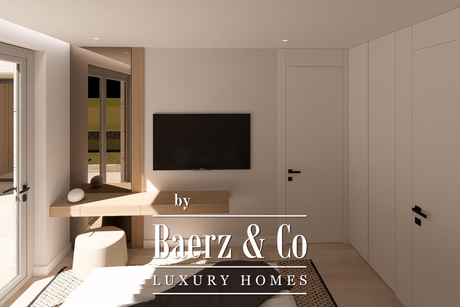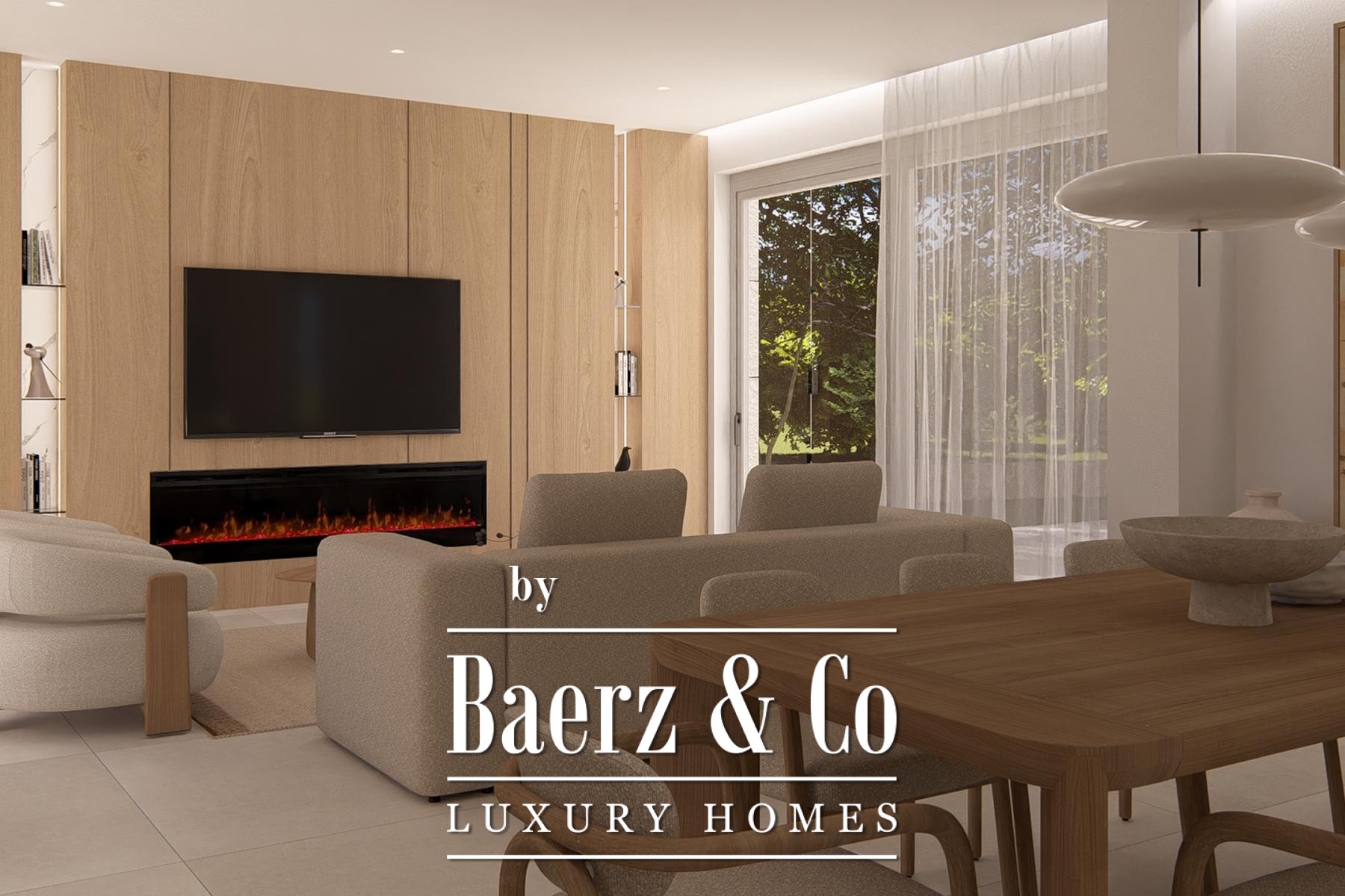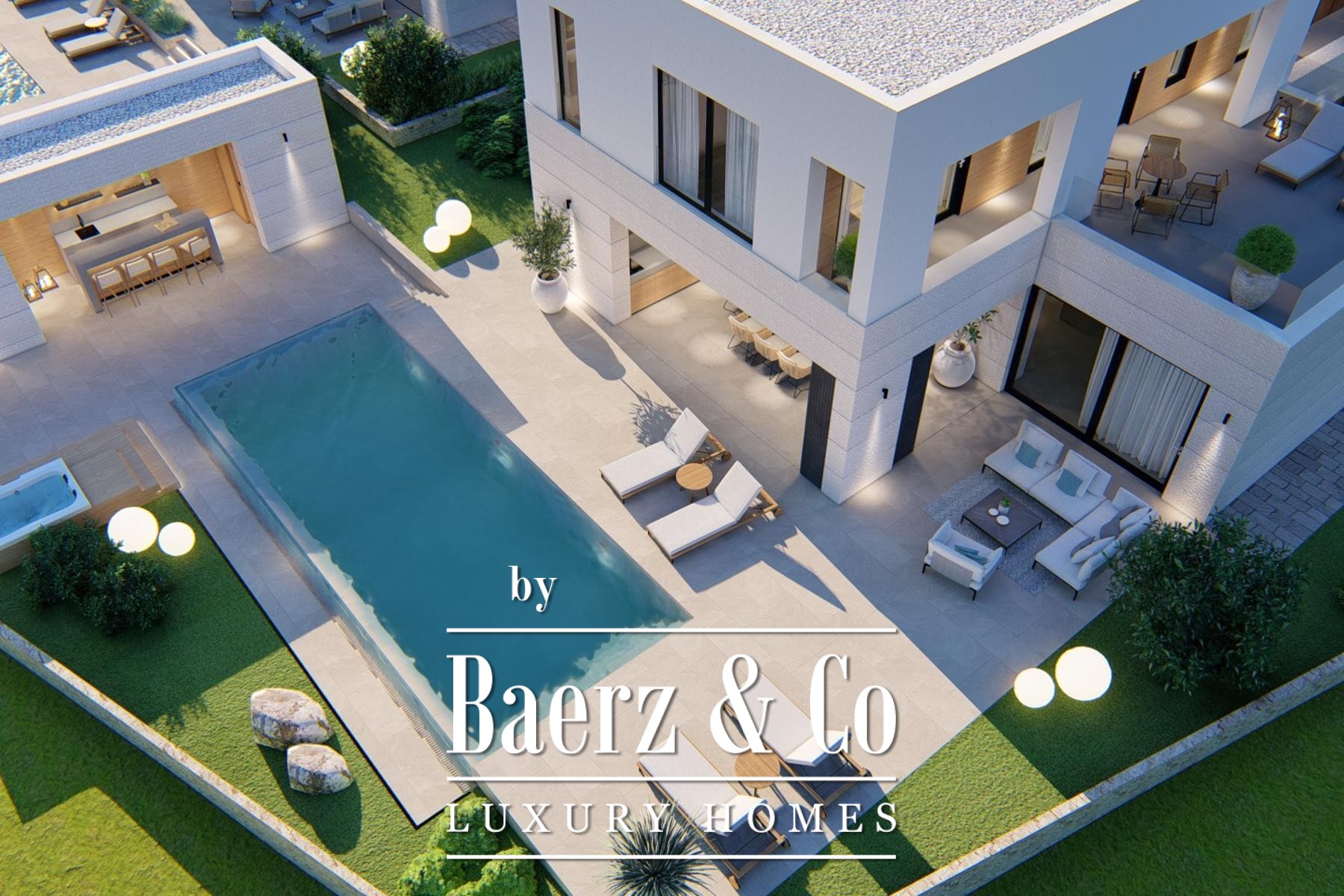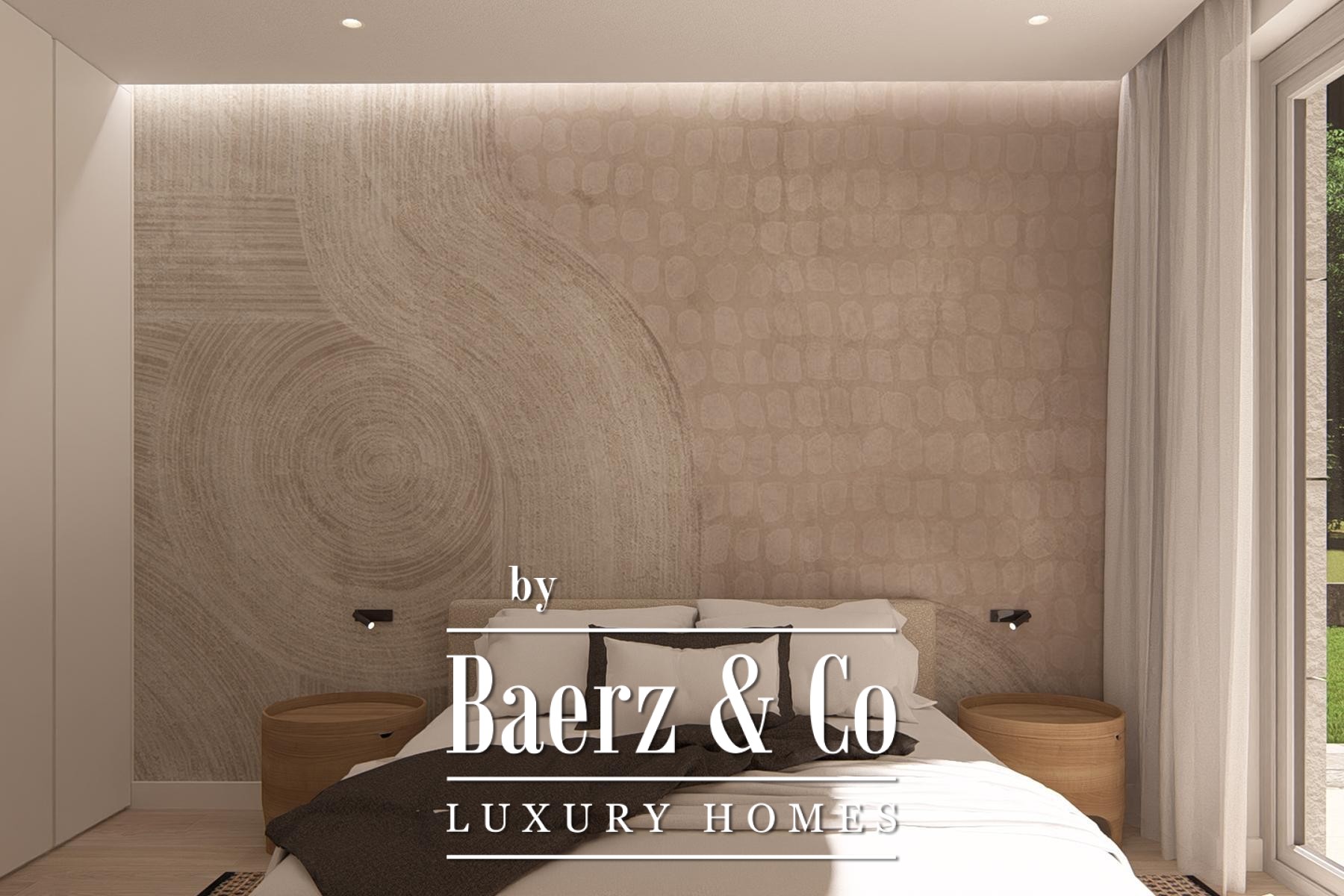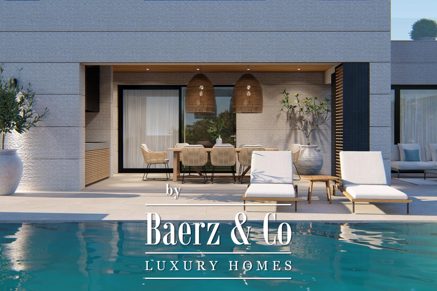 The main level welcomes you with an open living room, kitchen, and dining area, flowing onto a covered terrace with a barbecue. Here, expansive glass doors frame sea views and bring in natural light. The ground floor features one bedroom with its own private bathroom, while the first floor holds three further bedrooms, each with en-suite bathrooms and loggia access. The upper floor opens to a generous terrace, enhancing the flow between indoors and out.