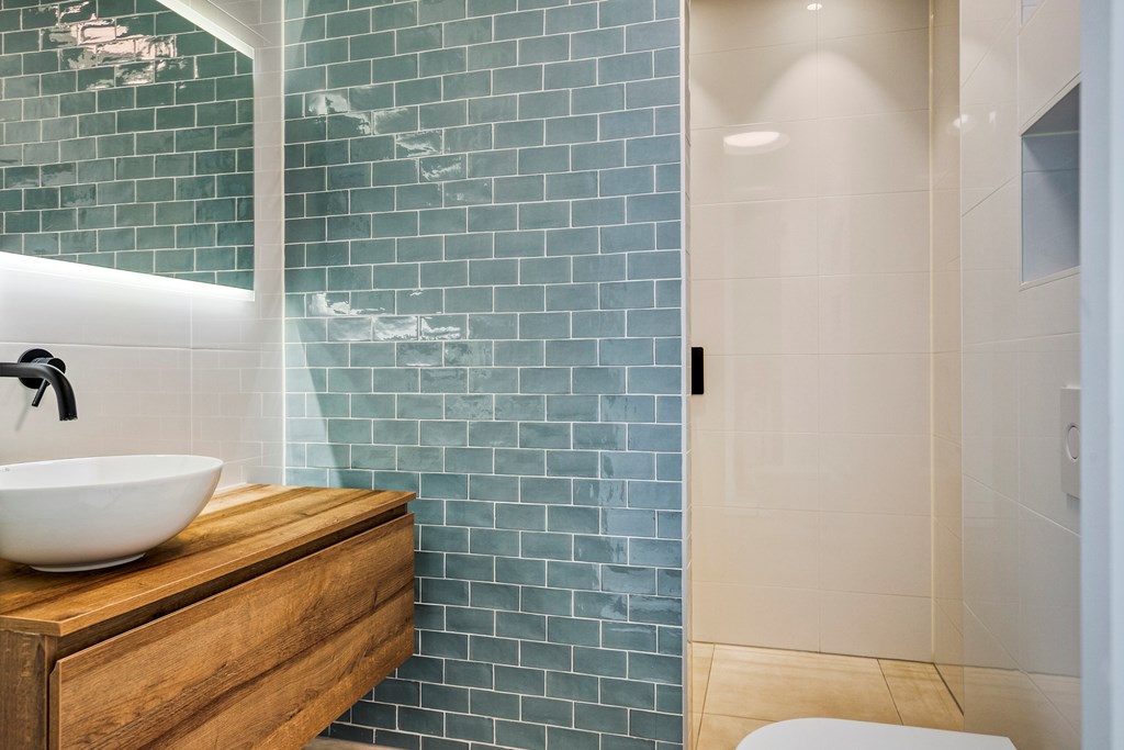 Aan de overloop grenst de modern afgewerkte badkamer. Deze is volledig betegeld en voorzien van een ligbad een ruime inloopdouche met glazen deur, een zwevend toilet en een stijlvol wastafelmeubel. De strakke afwerking draagt bij aan een luxe en verzorgde uitstraling.