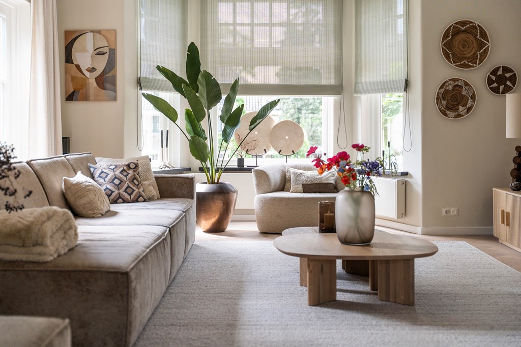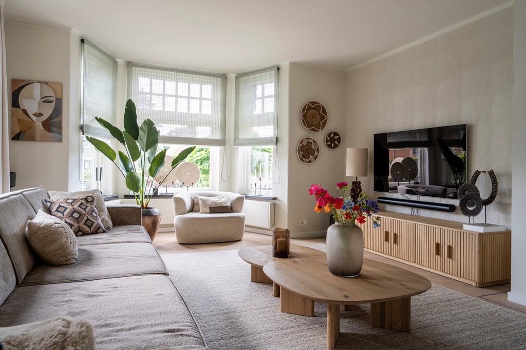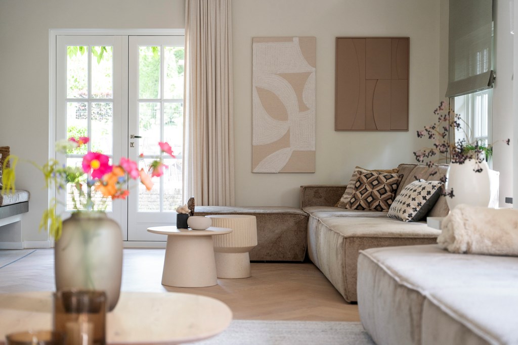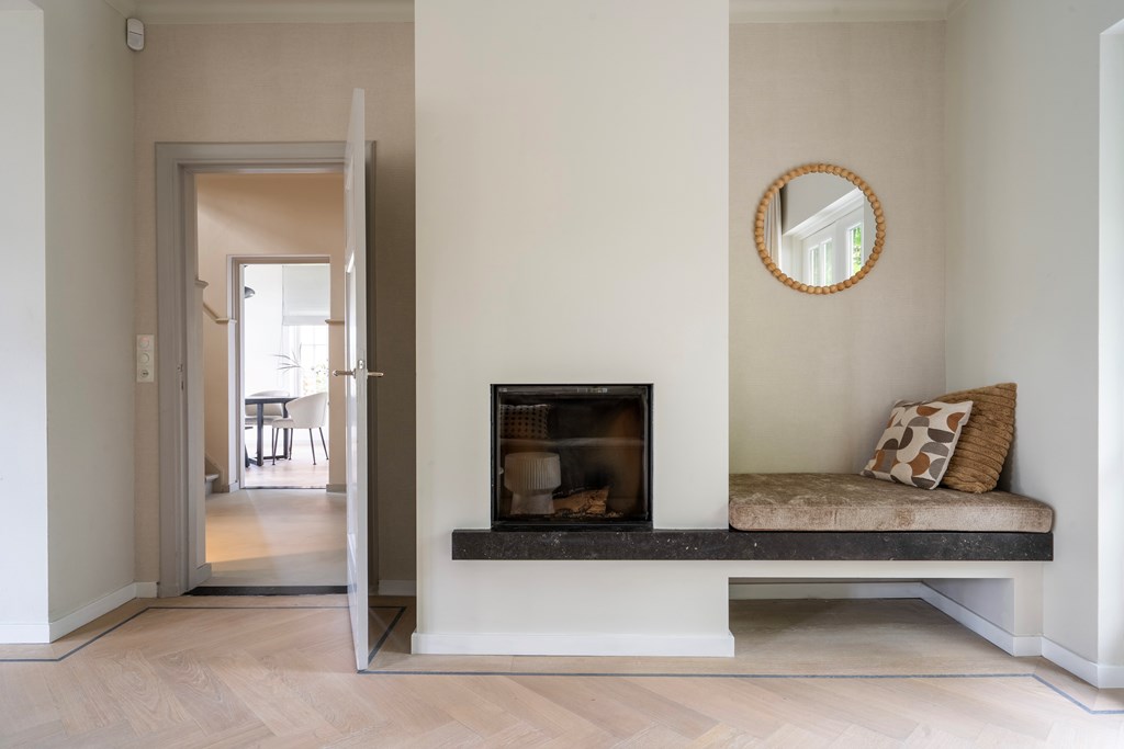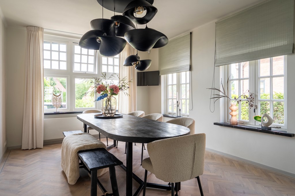 De woonkamer is een ware blikvanger met zijn visgraatvloer en elegante inrichting. Deze riante ruimte is slim ingedeeld en biedt meerdere gezellige zitplekken, waardoor u kunt genieten van de verschillende hoeken en uitzichten in de kamer. De overvloed aan ramen zorgt voor een prachtige lichtinval gedurende de dag, wat bijdraagt aan een lichte en open sfeer. Hier kunt u ontspannen met een goed boek of gasten ontvangen in een stijlvolle setting.
