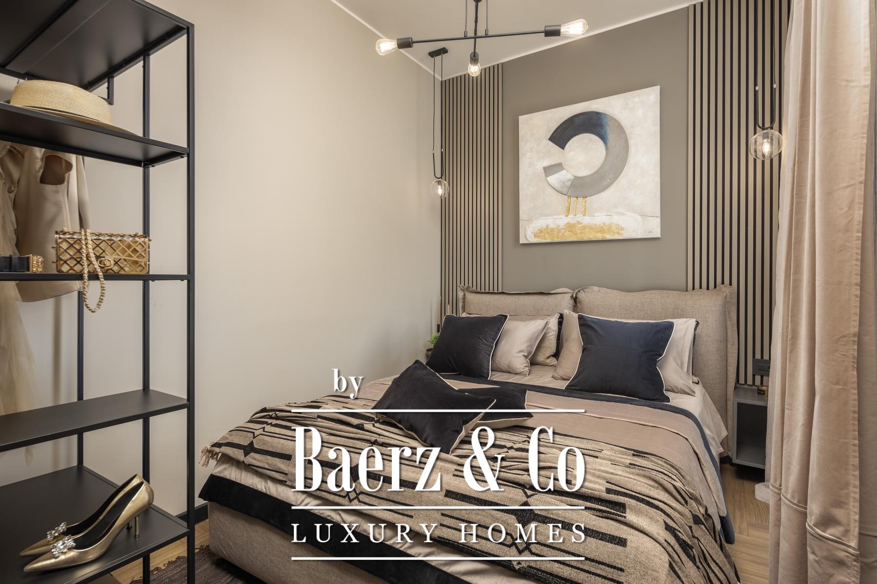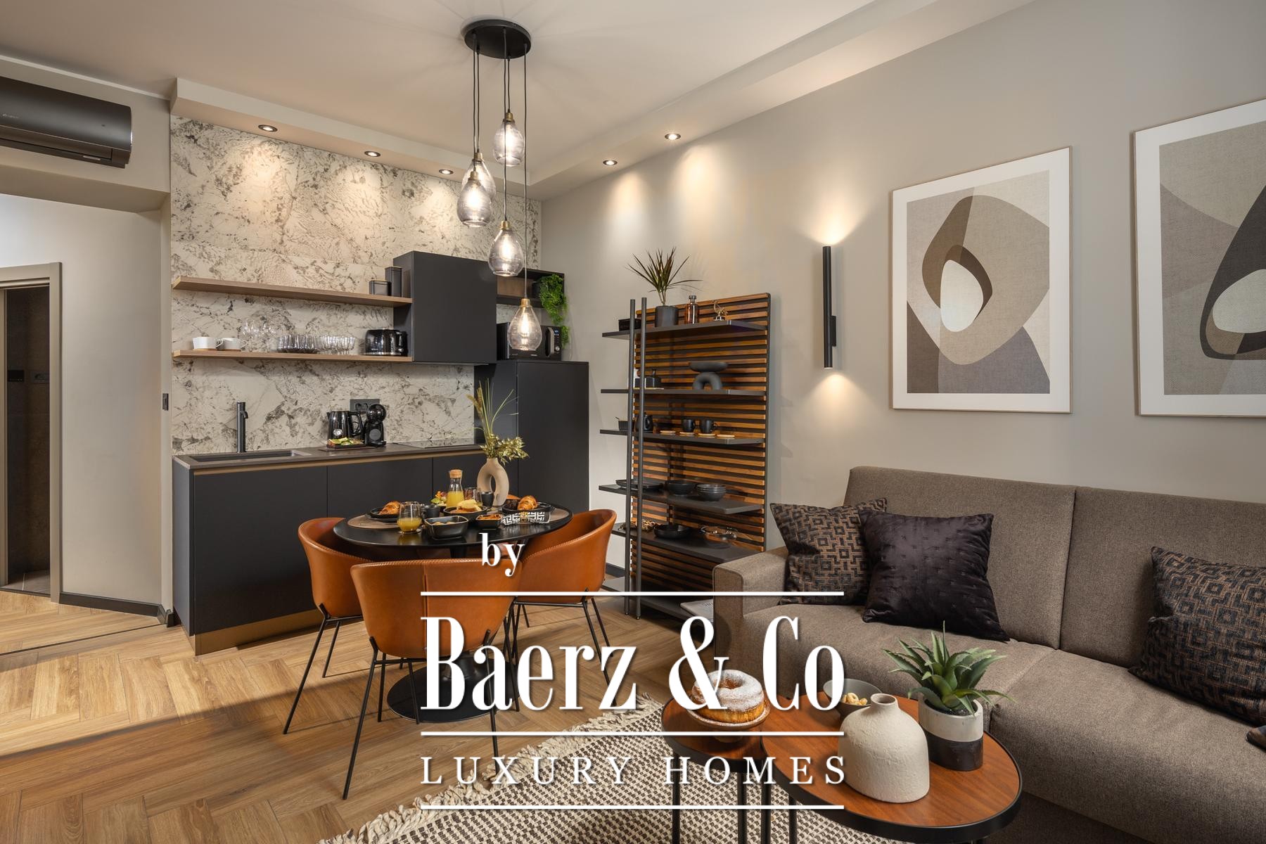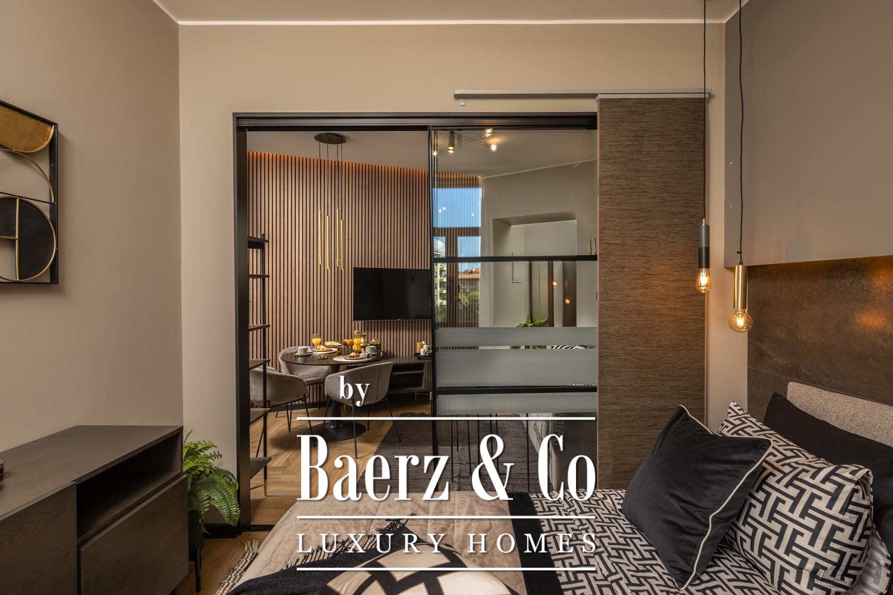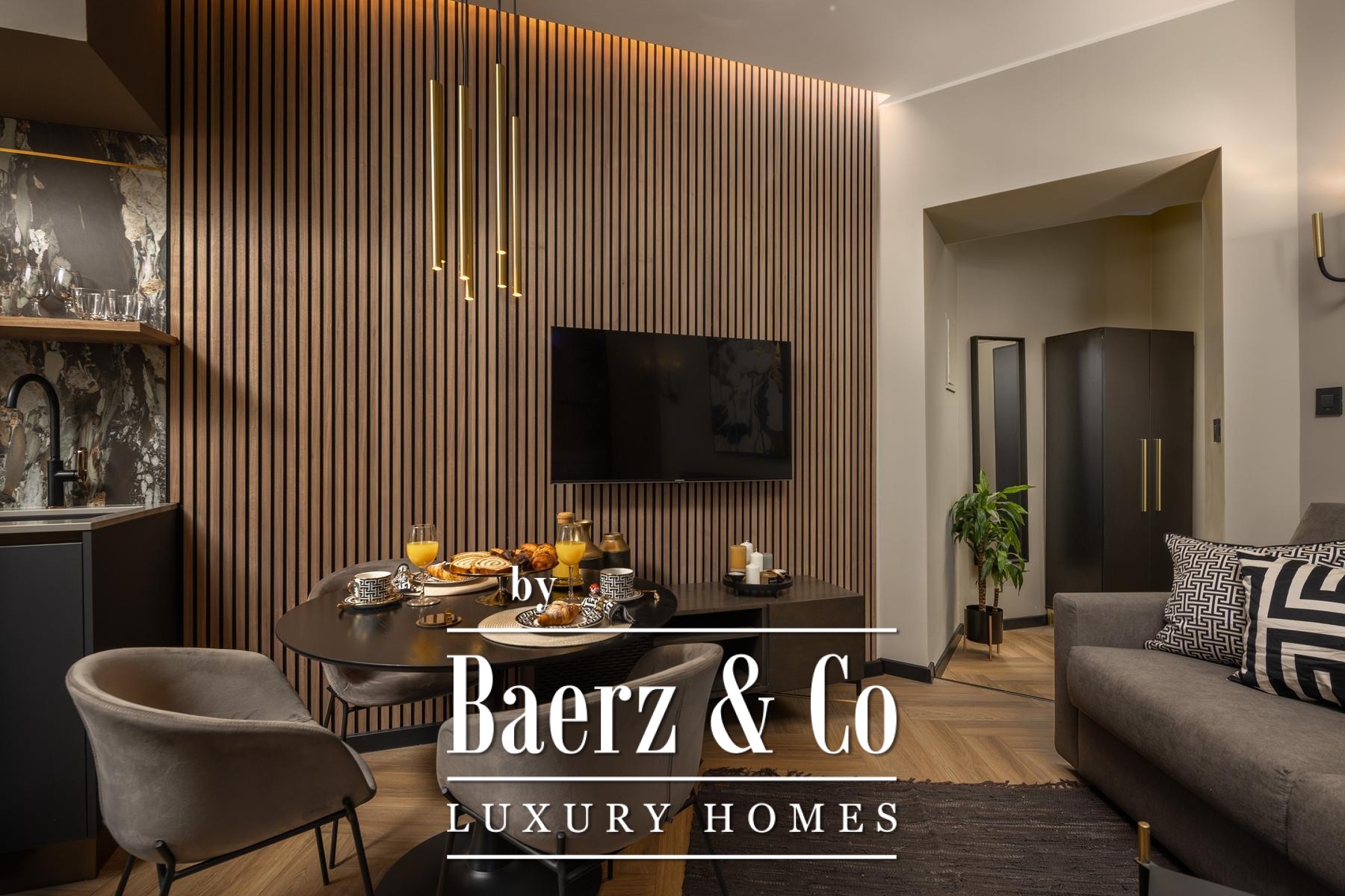 The interiors are shaped by a refined use of warm beige and anthracite, highlighted by gold details and custom lighting. Italian furnishings, large-format porcelain tiles, and matte black Veneta Cucine kitchens with sophisticated stone-marble backsplashes set an elevated tone. Frosted glass partitions, wooden wall slats with LED accents, and designer brass lighting complete the ambience.