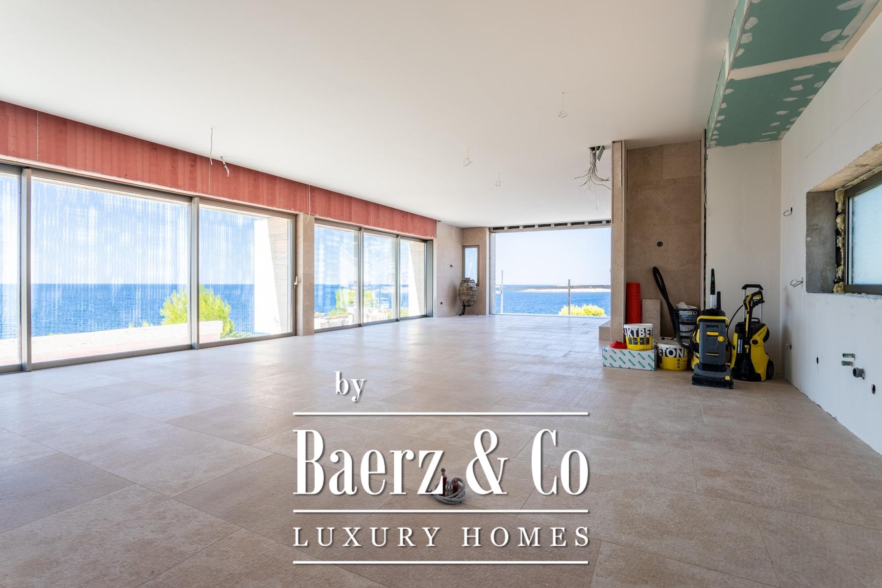 The ground floor welcomes with an expansive entrance, flowing through a bar, kitchen, dining and living spaces, with terraces opening directly to the sea. Upstairs, four bedrooms each feature a private bathroom and wardrobe, the principal suite extending to a terrace with open sea views. A walk-in wardrobe and laundry room add daily simplicity. The lower floor houses a tavern with kitchen, fitness and gym area with bathroom, and direct access to the outdoor domain—the 250 m² swimming pool with an integrated 75 m² pool forms a fluid horizon between residence and coastline.