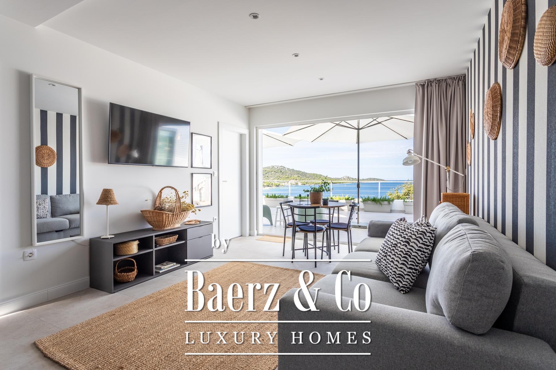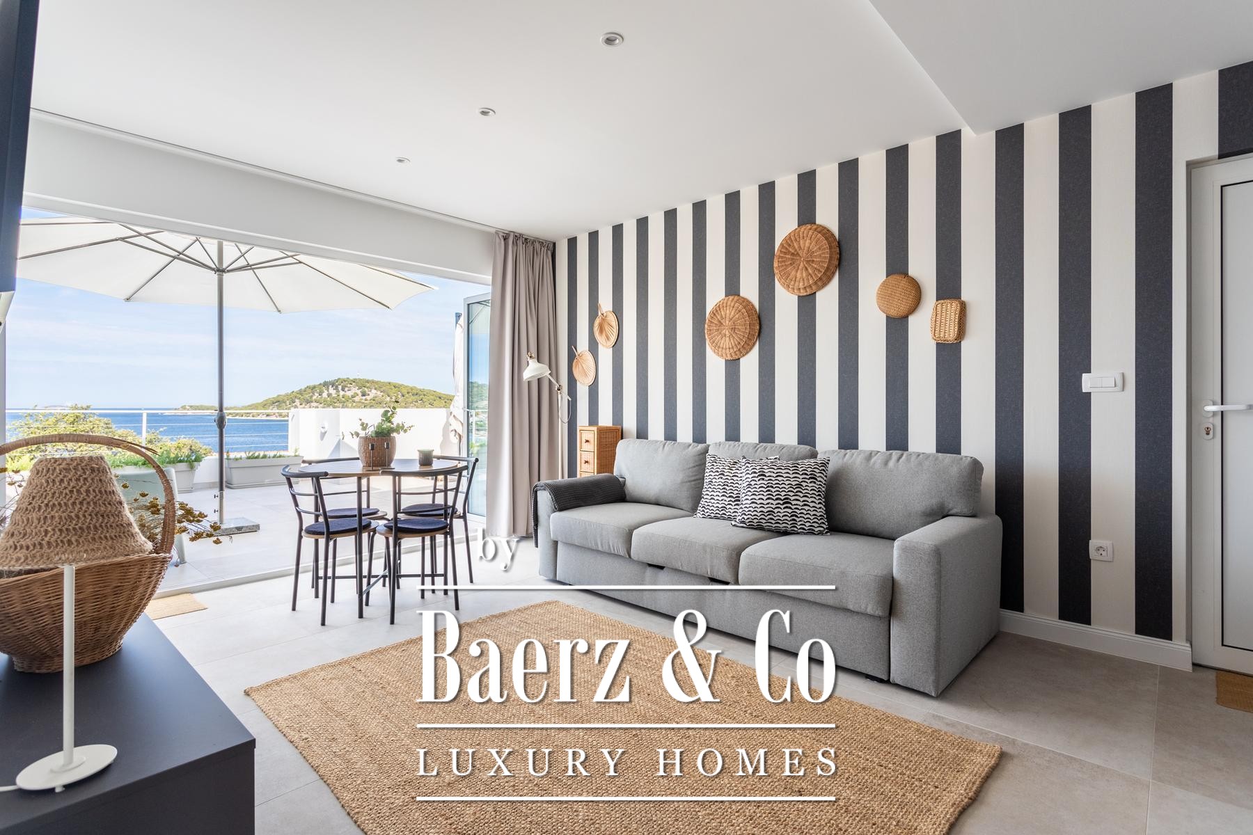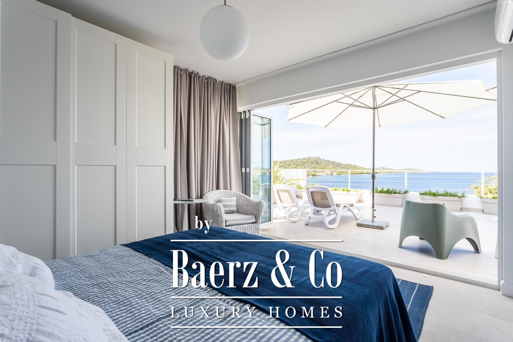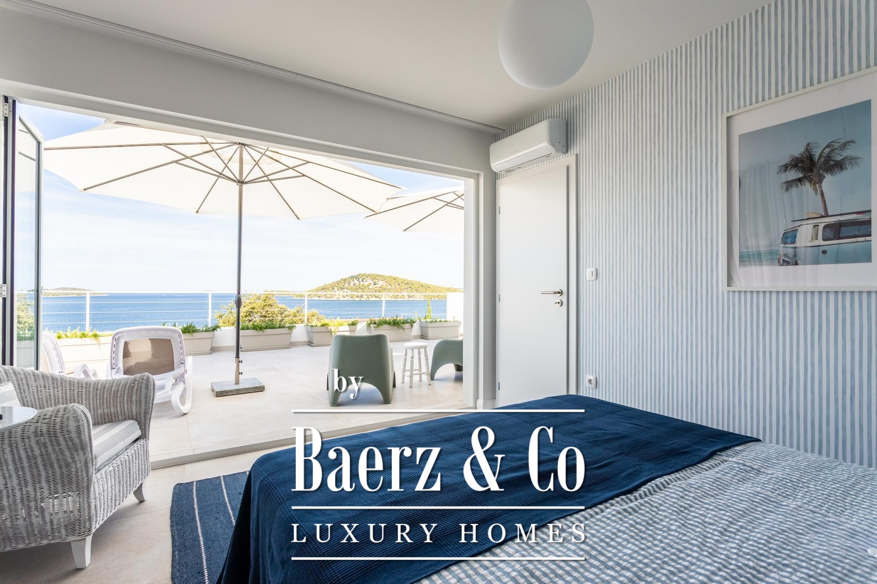 surfaces of the apartment open completely and the apartment becomes one with the terrace with a jacuzzi, a sundeck and outdoor shower. Stairs from the ground floor lead down to the two-car garage.The house was built to top standards and is decorated with designer furniture. Each room has air conditioning, and underfloor heating is installed. The house is equipped with 6Kw solar panels, video surveillance, preparation for an electric car charging station, remote-controlled garage doors and top-quality kitchen appliances. The house is in a great location, less than 50 meters from the sea. In the sea in front of the house, the owner also has a corpo morto, so the buyer can have a boat right in front of the house.All other information on request.