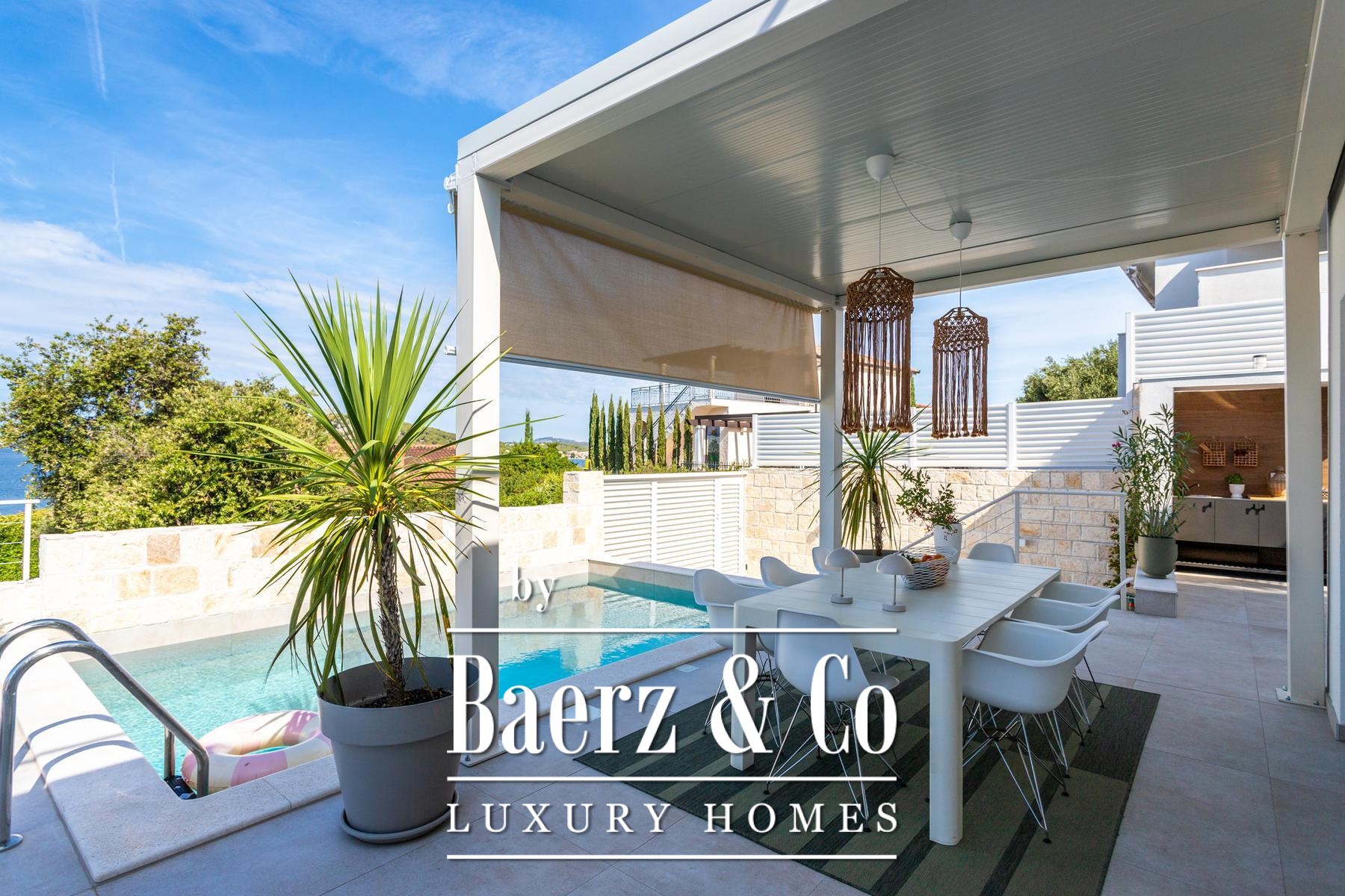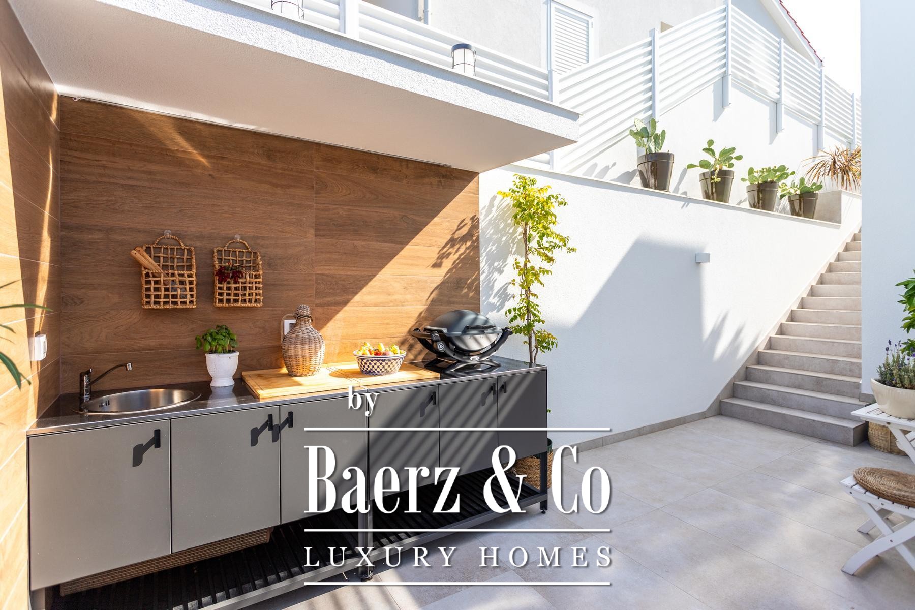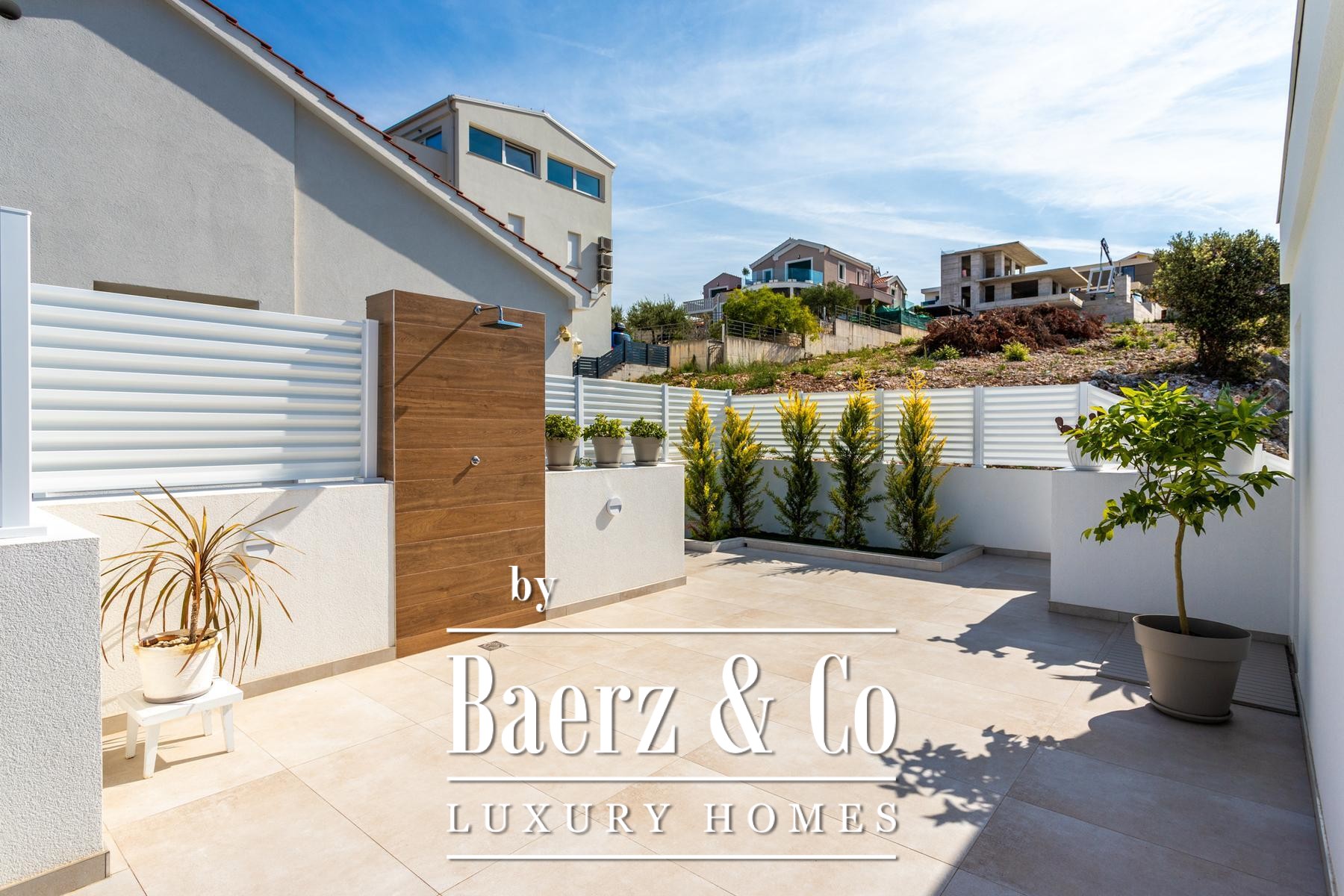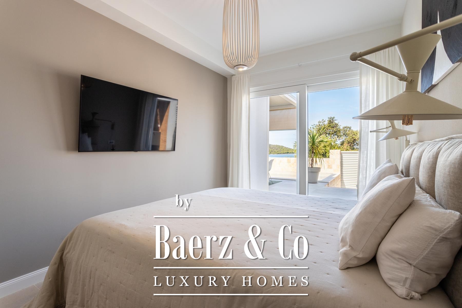 surfaces of the apartment open completely and the apartment becomes one with the terrace with a jacuzzi, a sundeck and outdoor shower. Stairs from the ground floor lead down to the two-car garage.The house was built to top standards and is decorated with designer furniture. Each room has air conditioning, and underfloor heating is installed. The house is equipped with 6Kw solar panels, video surveillance, preparation for an electric car charging station, remote-controlled garage doors and top-quality kitchen appliances. The house is in a great location, less than 50 meters from the sea. In the sea in front of the house, the owner also has a corpo morto, so the buyer can have a boat right in front of the house.All other information on request.