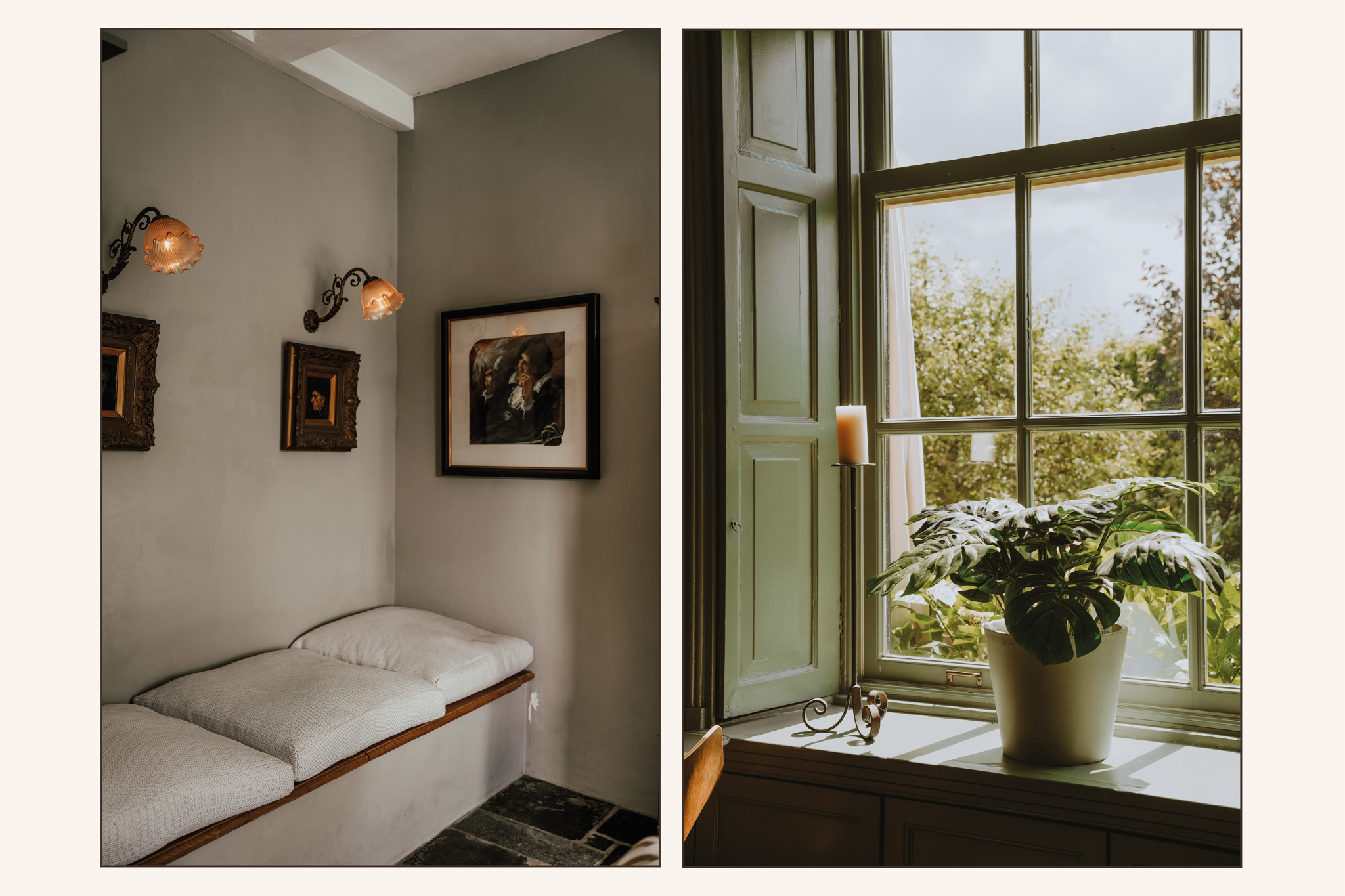 The landing leads to three spacious bedrooms and a balcony. The master bedroom features an open fireplace, built-in wardrobes, and air conditioning. Tall sash windows provide beautiful views of the front garden and the Waaldijk.