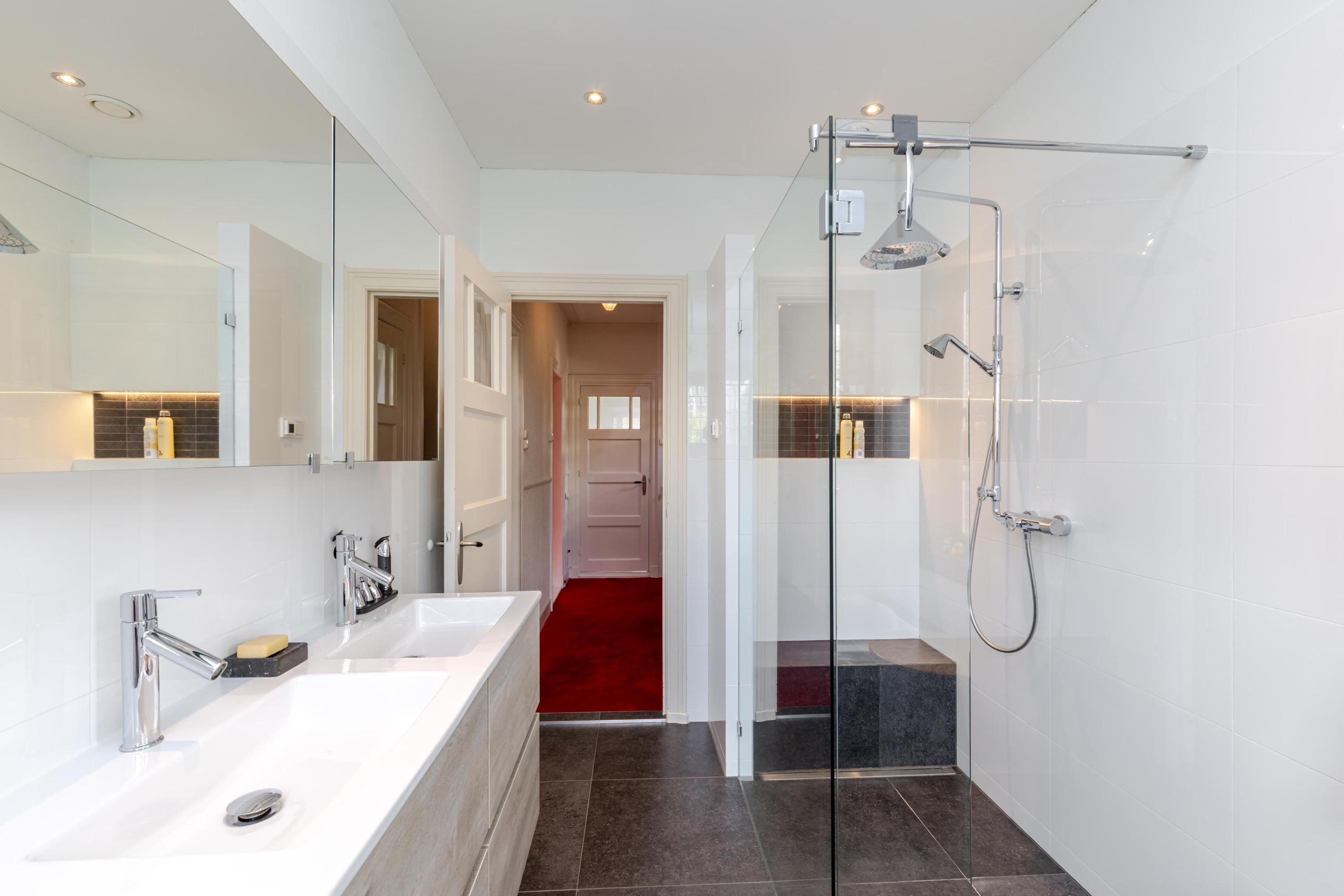 Landing with toilet, spacious master bedroom at the rear featuring French doors to the balcony; this room offers excellent potential for installing a built-in wardrobe, spacious bedroom at the front also featuring French doors to the balcony. This balcony offers beautiful views over the leafy Berglustlaan. At the front, there is another smaller bedroom currently used as a dressing room. At the rear is the bathroom equipped with a bathtub, walk-in shower, and vanity unit with double sink. Second floor: