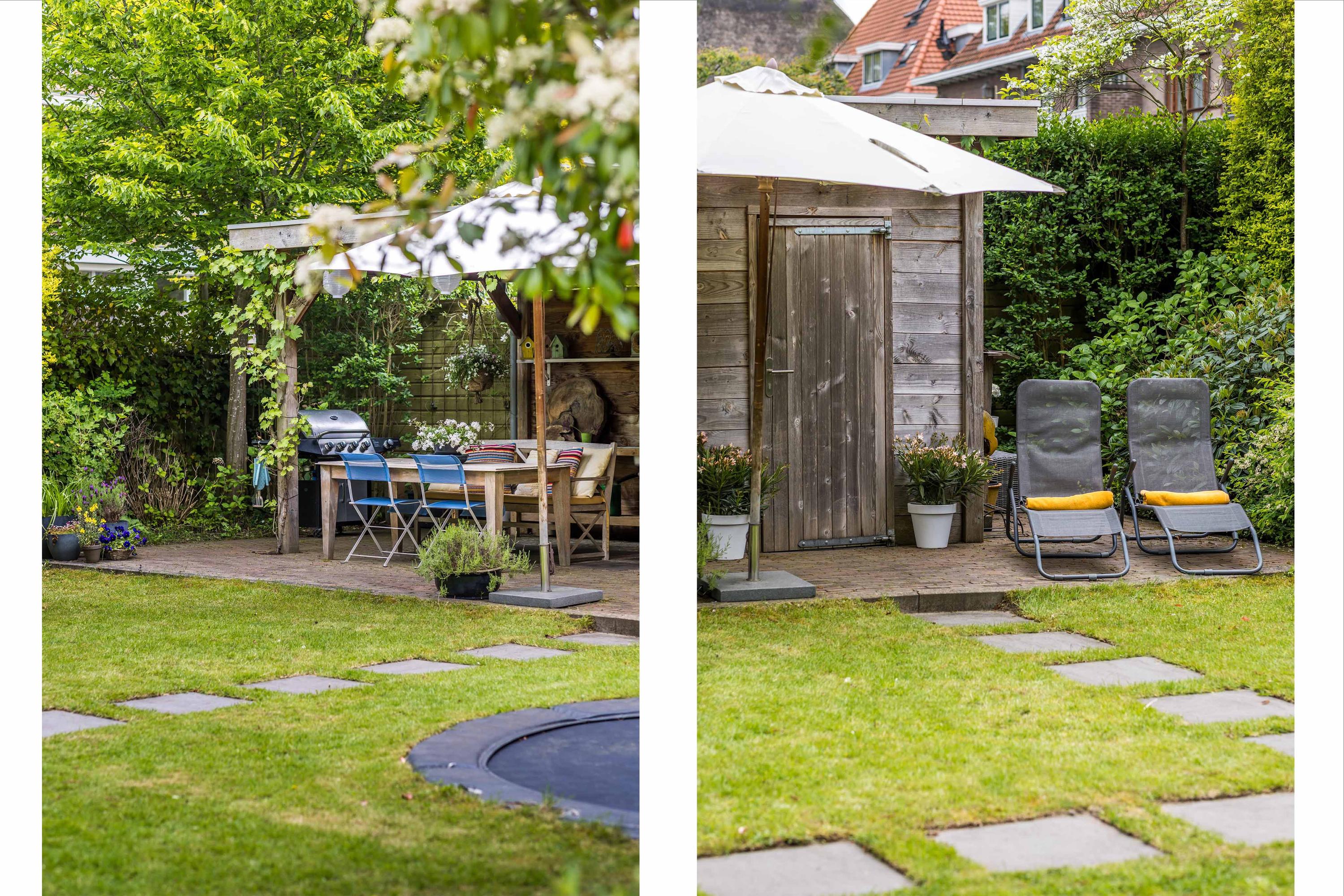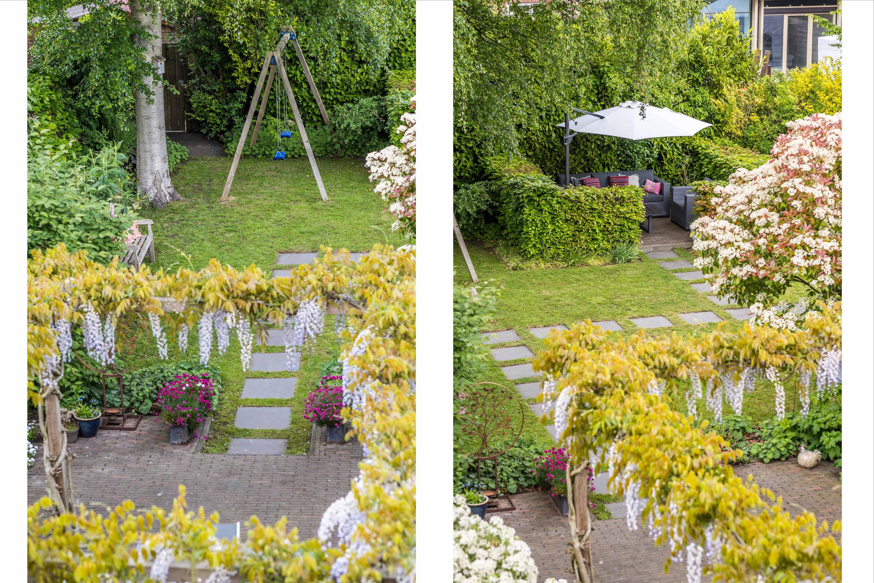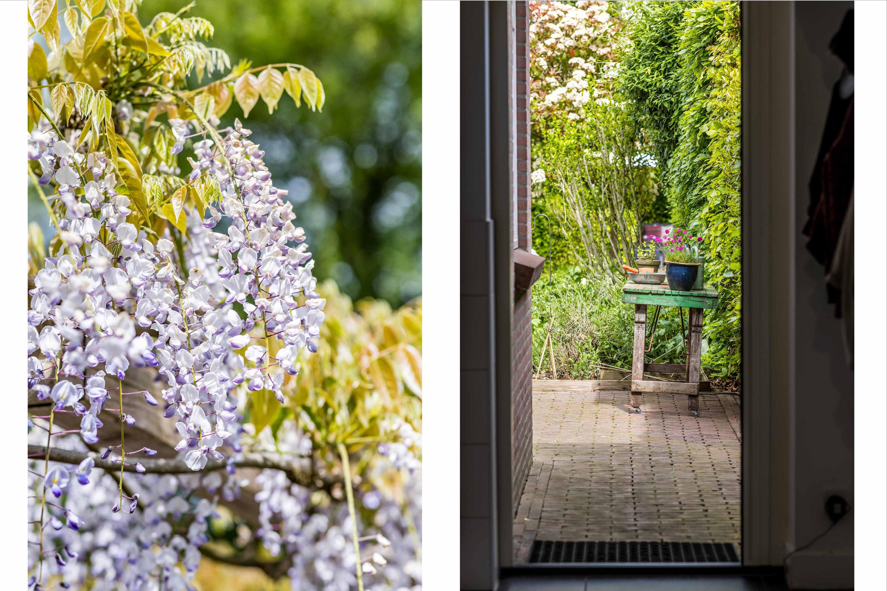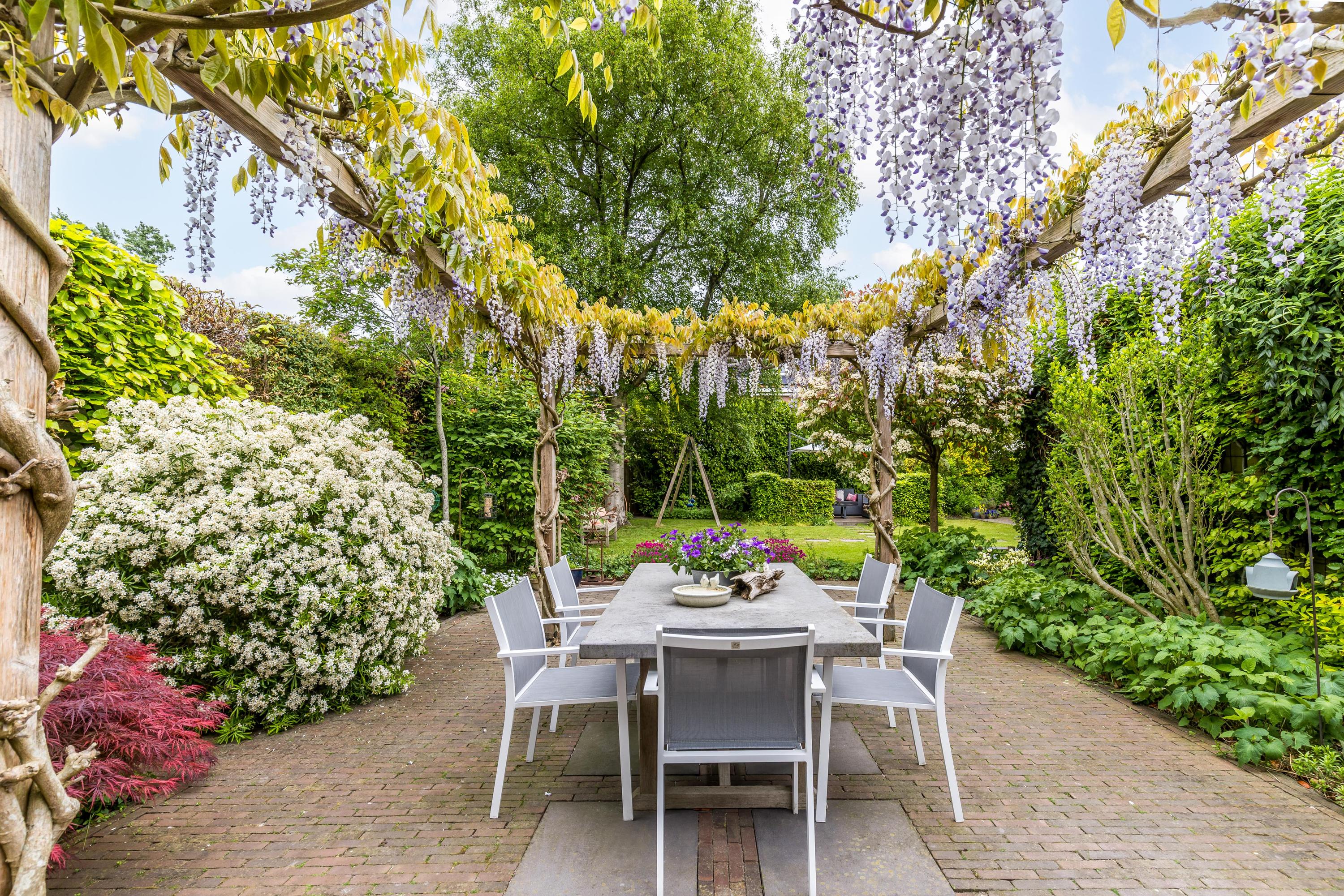 Back garden: Approx. 23 meters deep by over 17 meters wide from halfway the depth and approx. 8.5 meters wide at the front part. The garden has a drip system, has been created with much love and respect for nature, offers a lot of privacy due to the planting, faces northeast, and because of the depth and size there is a spot in the sun to be found all day long, on one of the three lovely terraces. So you have a spot in the sun or shade at any time of the day. The garden has a wooden garden house with a canopy and there is a gate to the back path.