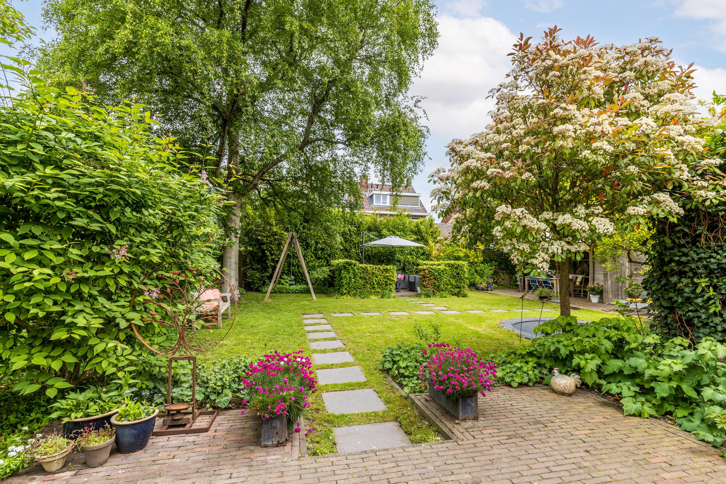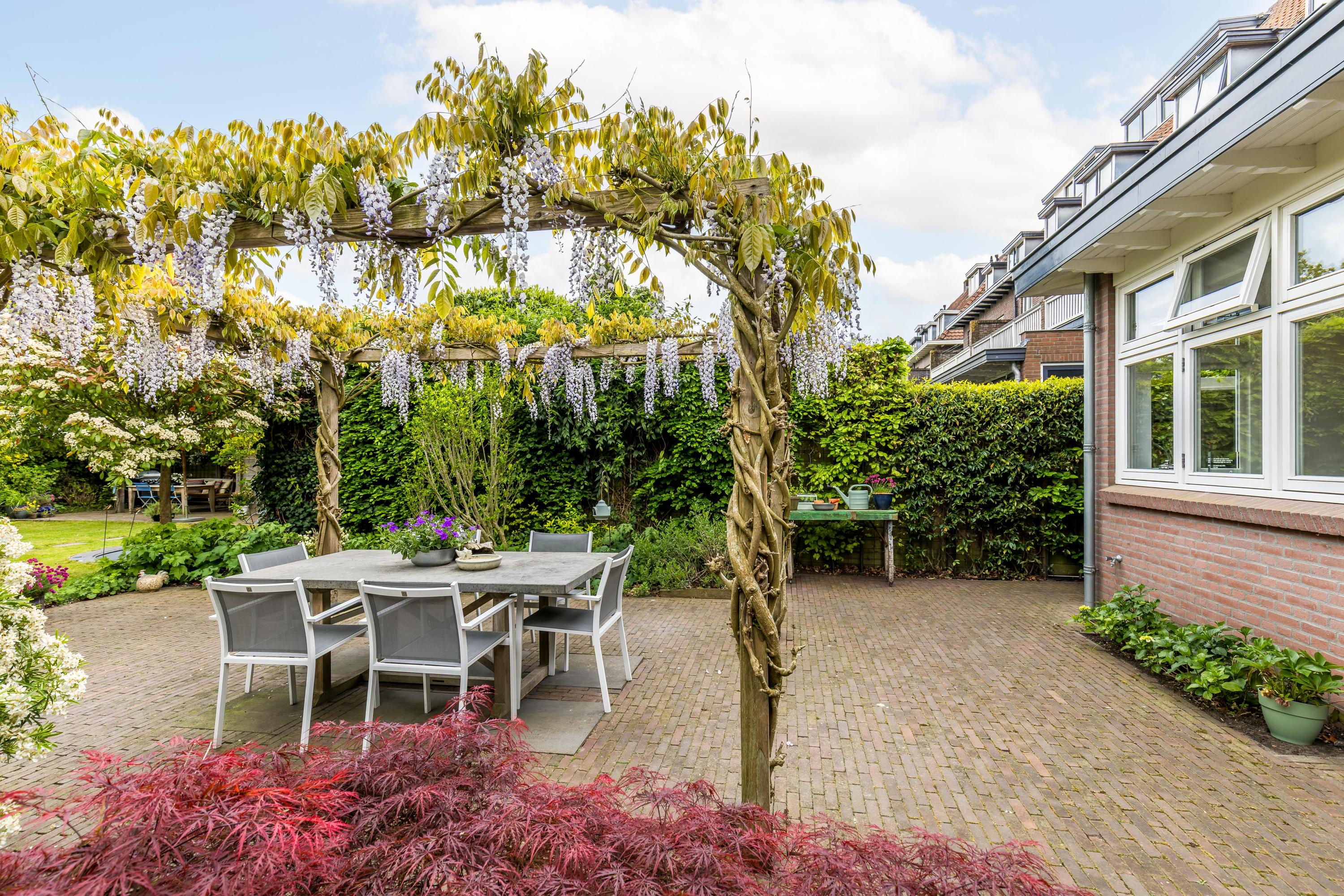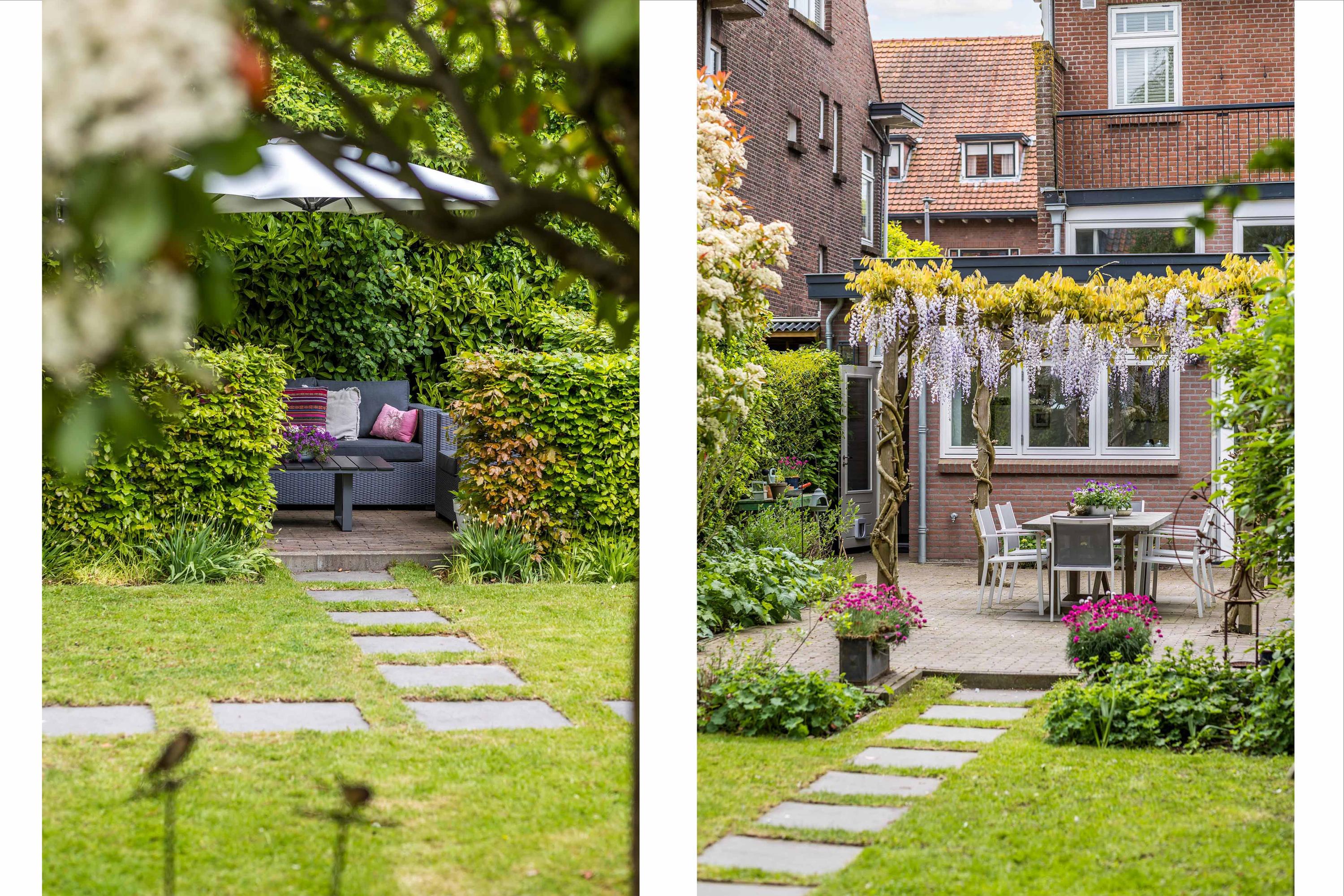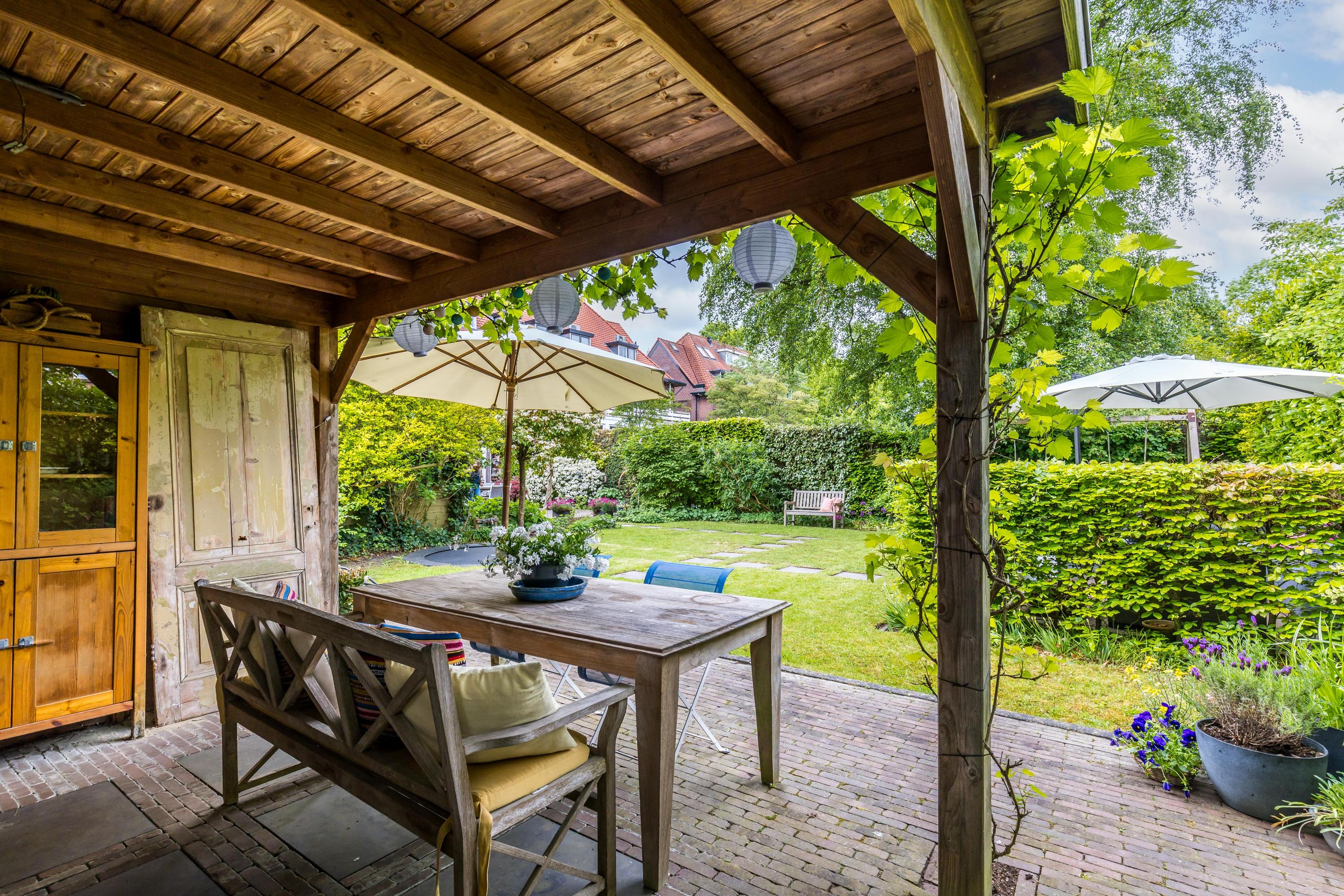 Back garden: Approx. 23 meters deep by over 17 meters wide from halfway the depth and approx. 8.5 meters wide at the front part. The garden has a drip system, has been created with much love and respect for nature, offers a lot of privacy due to the planting, faces northeast, and because of the depth and size there is a spot in the sun to be found all day long, on one of the three lovely terraces. So you have a spot in the sun or shade at any time of the day. The garden has a wooden garden house with a canopy and there is a gate to the back path.