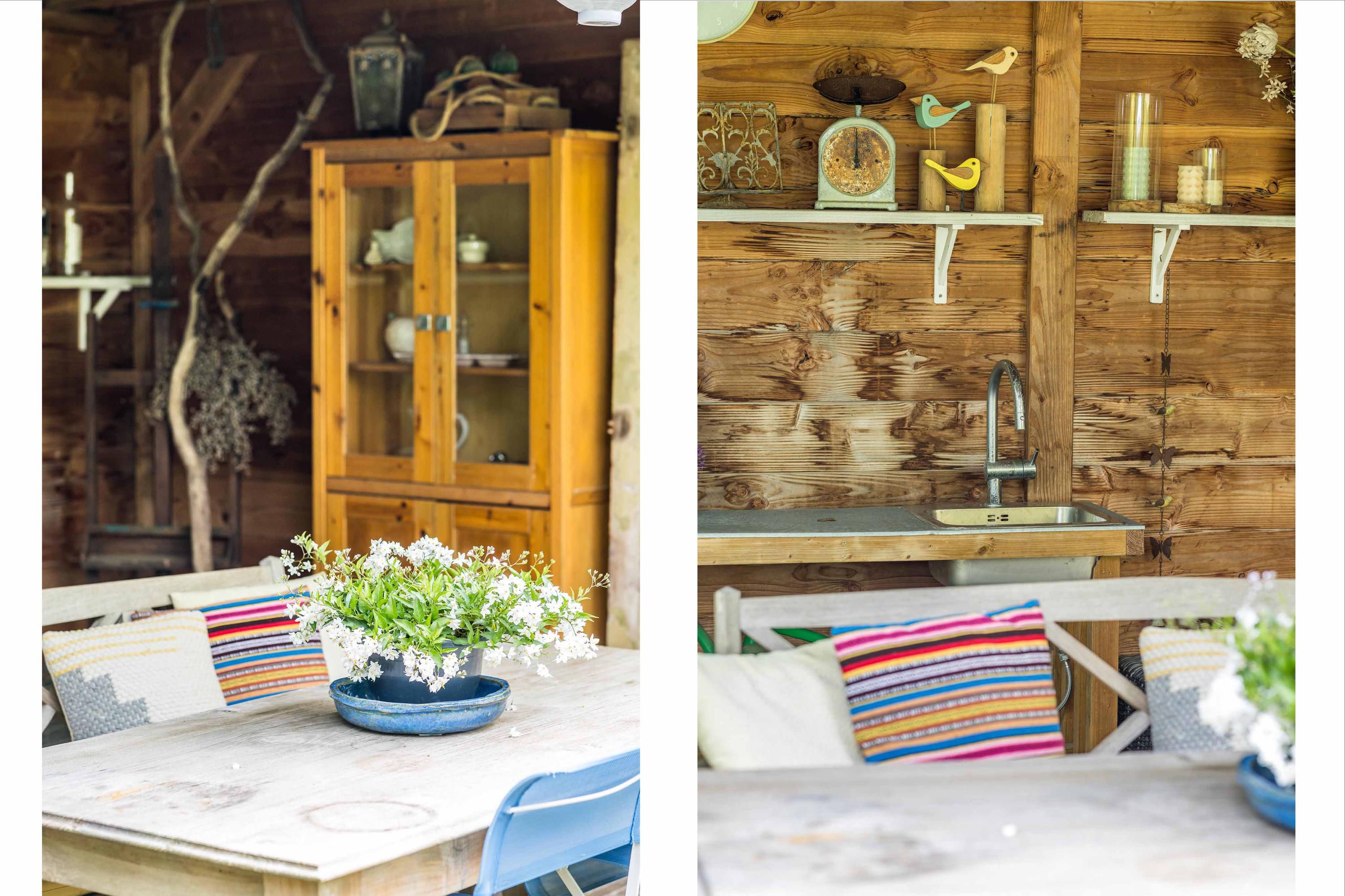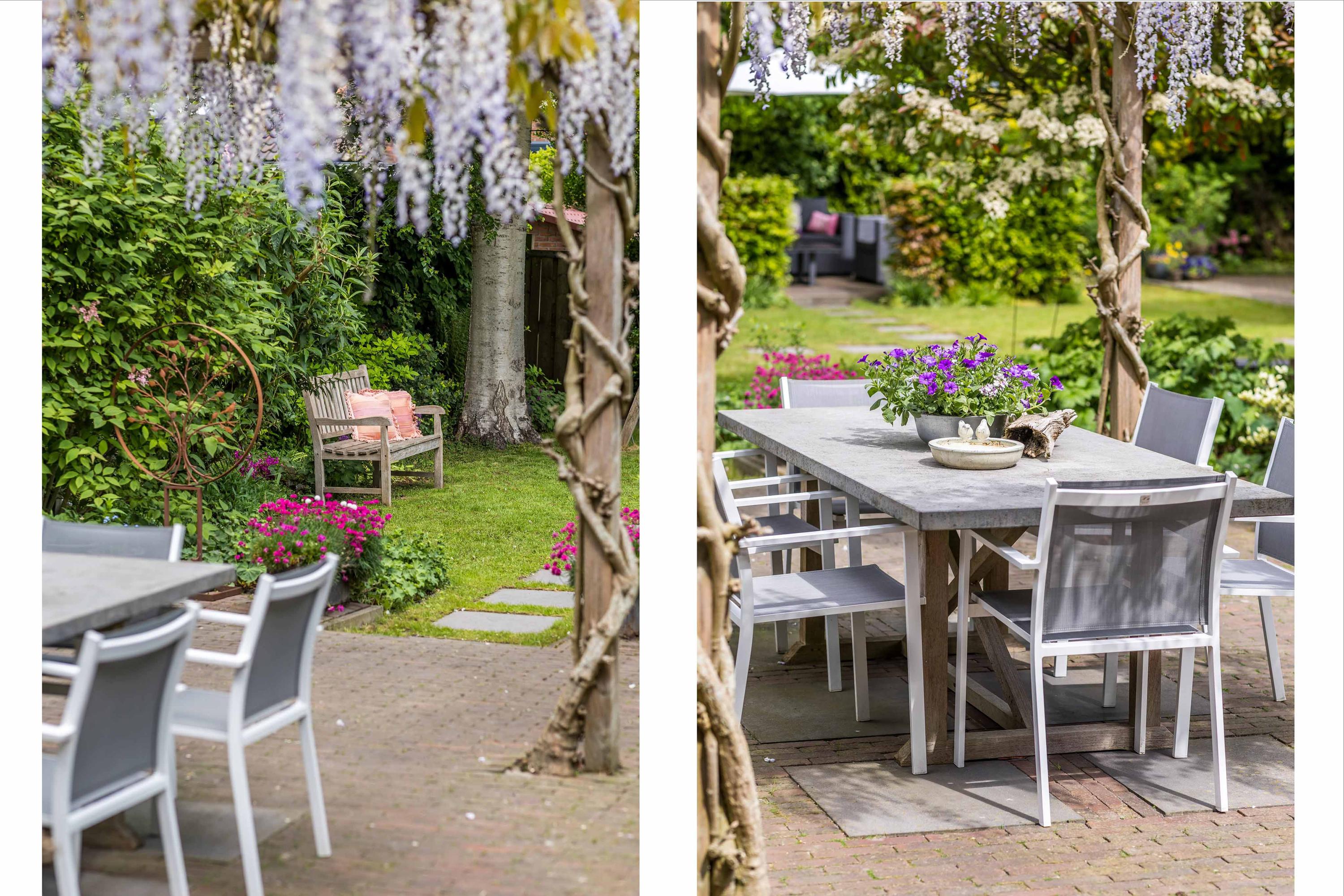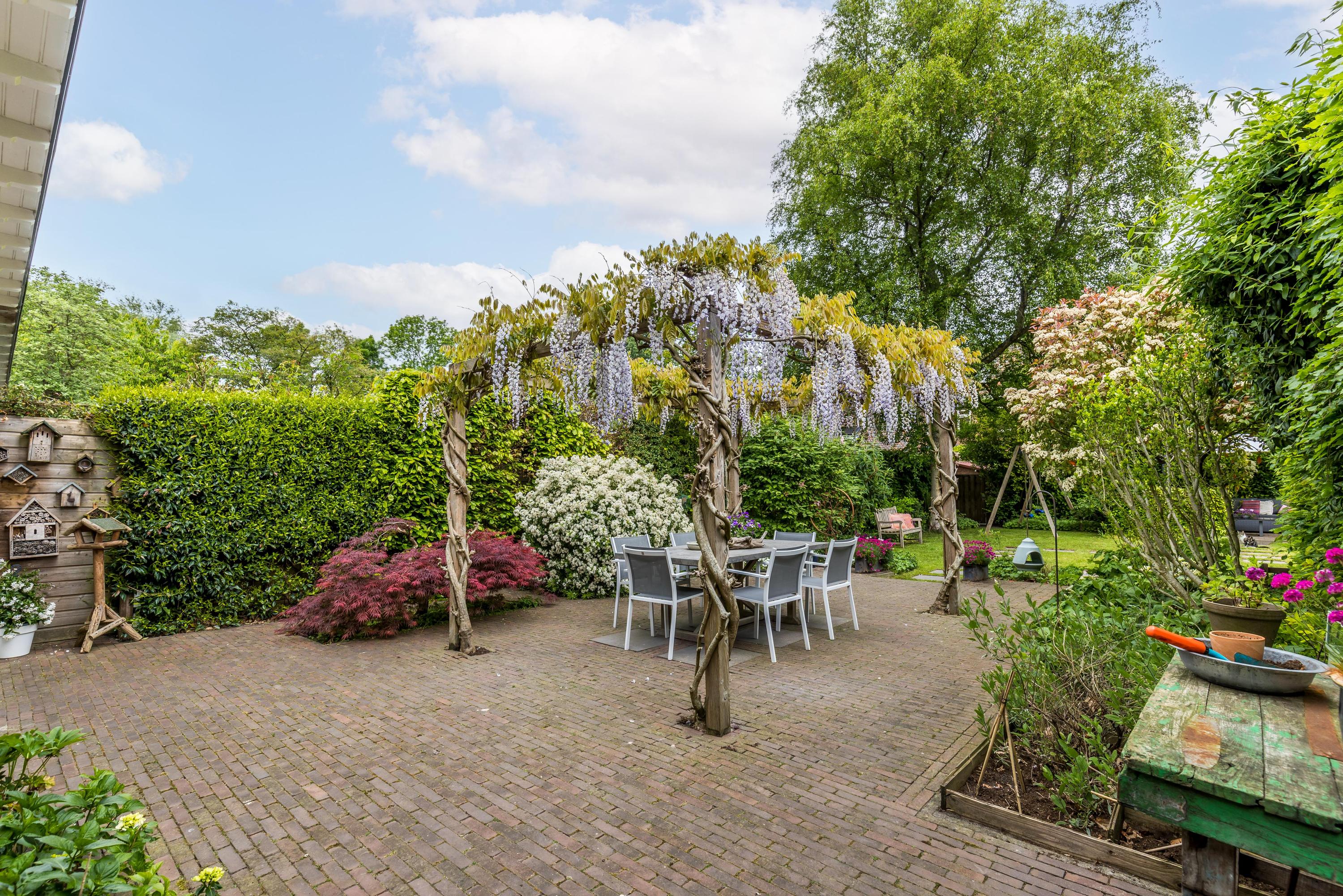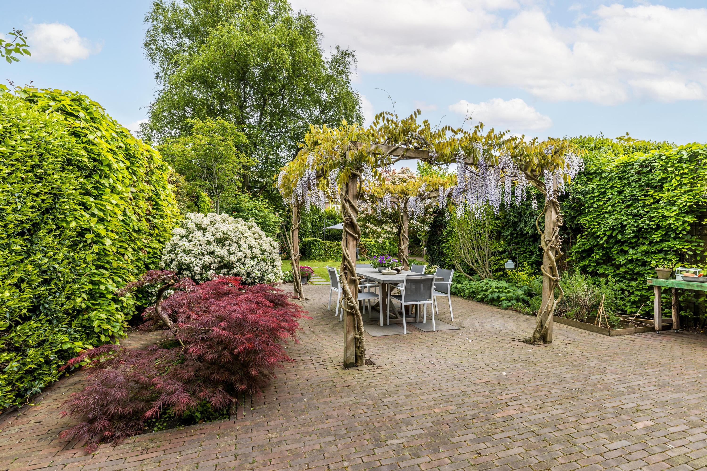 Back garden: Approx. 23 meters deep by over 17 meters wide from halfway the depth and approx. 8.5 meters wide at the front part. The garden has a drip system, has been created with much love and respect for nature, offers a lot of privacy due to the planting, faces northeast, and because of the depth and size there is a spot in the sun to be found all day long, on one of the three lovely terraces. So you have a spot in the sun or shade at any time of the day. The garden has a wooden garden house with a canopy and there is a gate to the back path.
