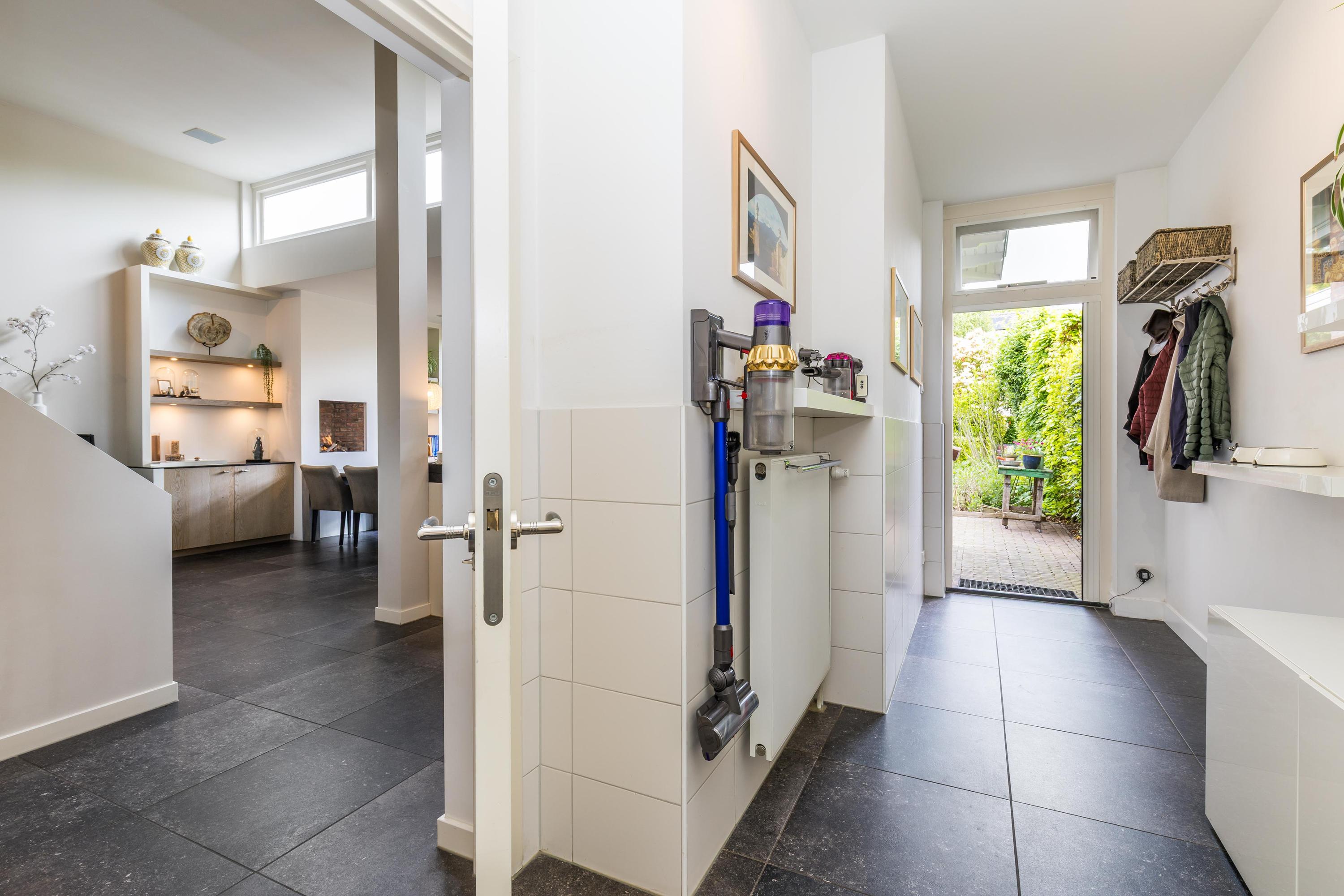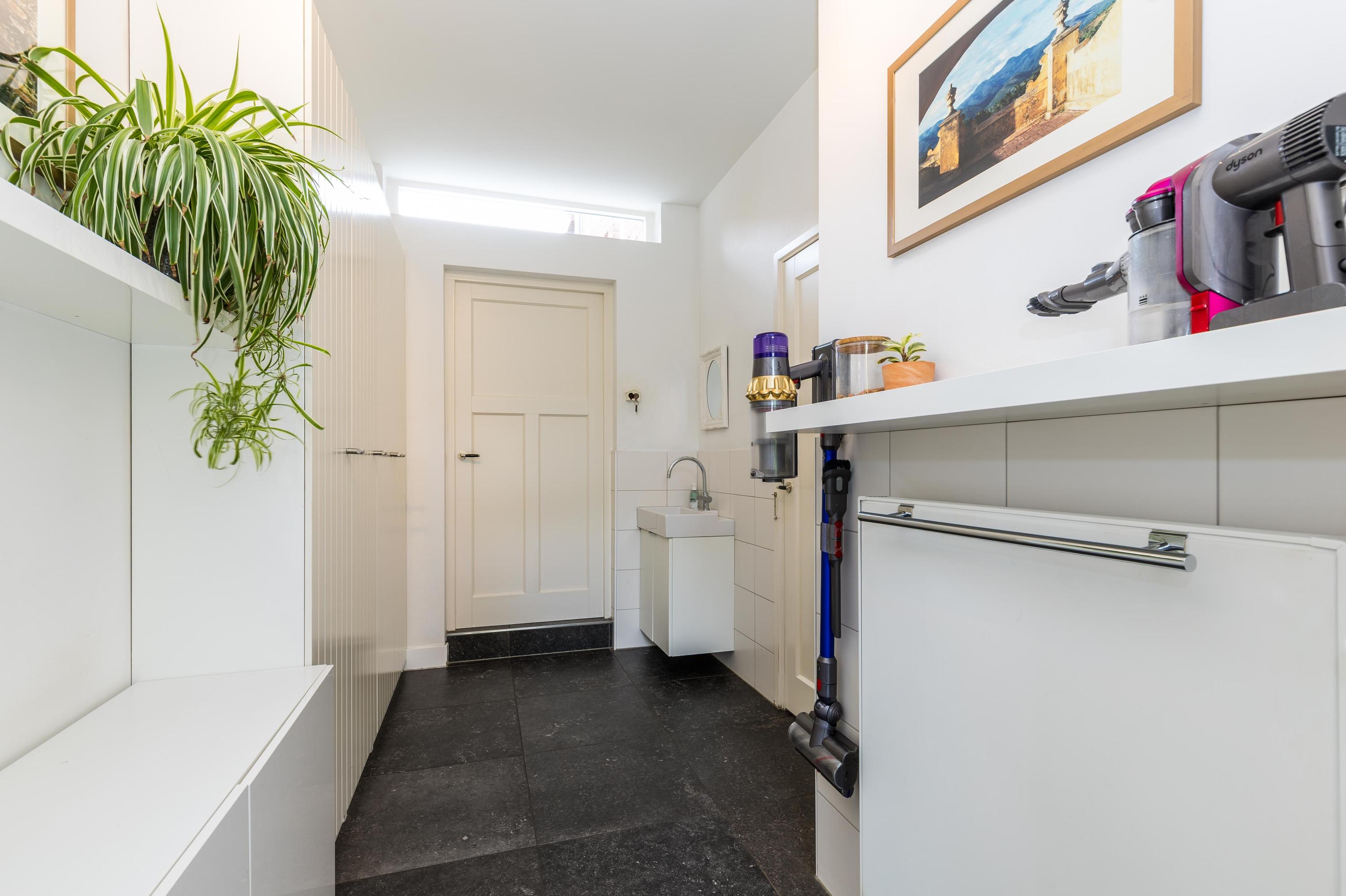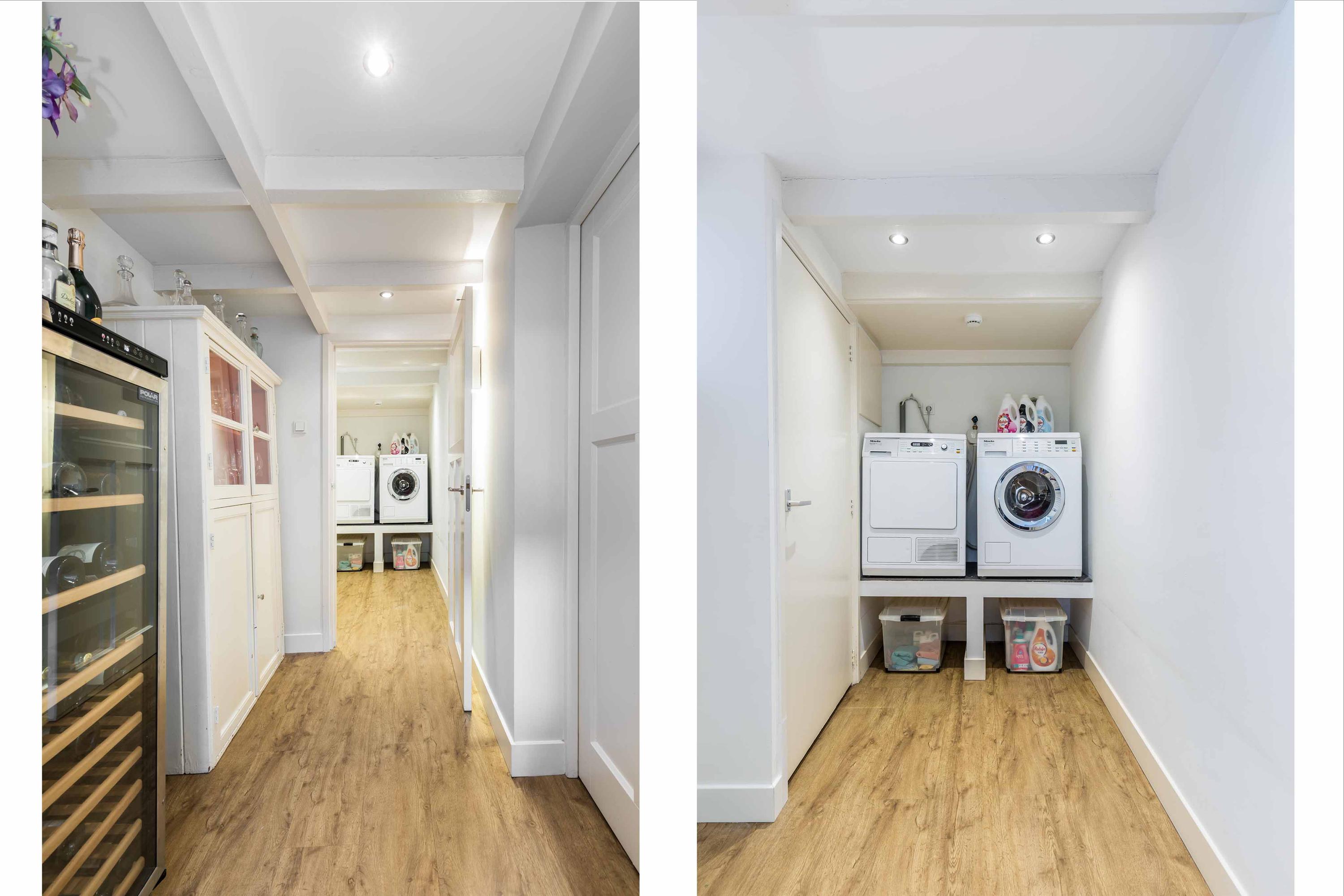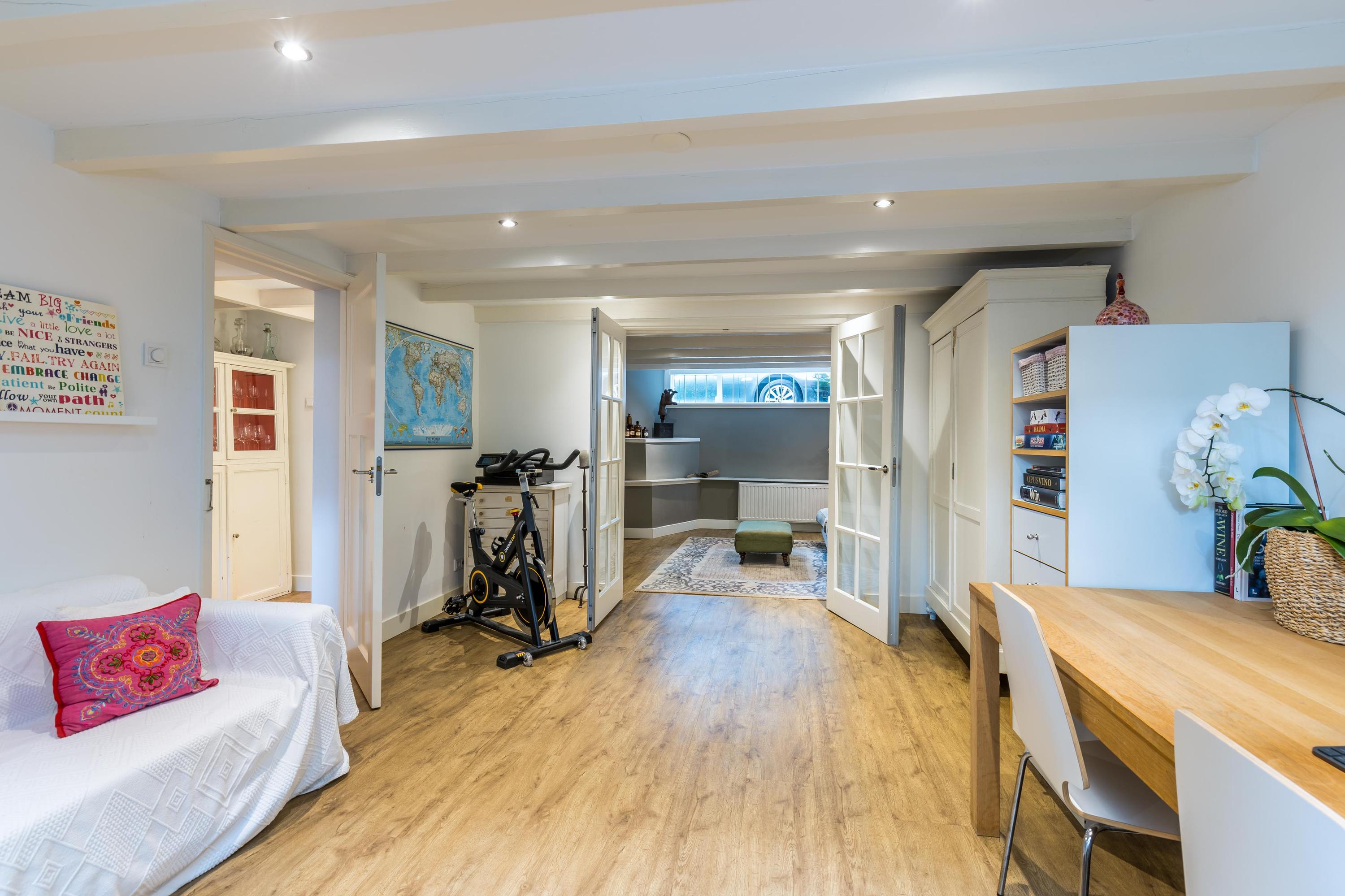 Ground floor: Entrance, light and spacious hall with extra spacious toilet with washbasin, 2 staircase cupboards for coats and shoes, beautiful wide and light living room with an oak parquet floor, the high-efficiency wood-burning fireplace that radiates a wonderful, comfortable warmth. The kitchen-diner is situated in the attractive extension at the rear. This extension has been executed to perfection, so that it feels as if it has always been like this. The gas-fired fireplace at the head of the dining table is the mood maker for many cozy dinners and drinks at home. From the kitchen-diner there is access to the basement with laundry room and to the utility room that is situated in the side extension. At the front is the storage function/shed with access to the street, ideal for putting a nice (cargo) bike or scooter inside and at the rear the utility room function with high storage cupboards, a washbasin unit, which is handy for sports shoes, coats or if you have pets. The utility room also has a door to the back garden, so you can easily go to the back garden with a green bin, for example. In addition, the back garden has a back entrance at the rear, connecting to the back path.