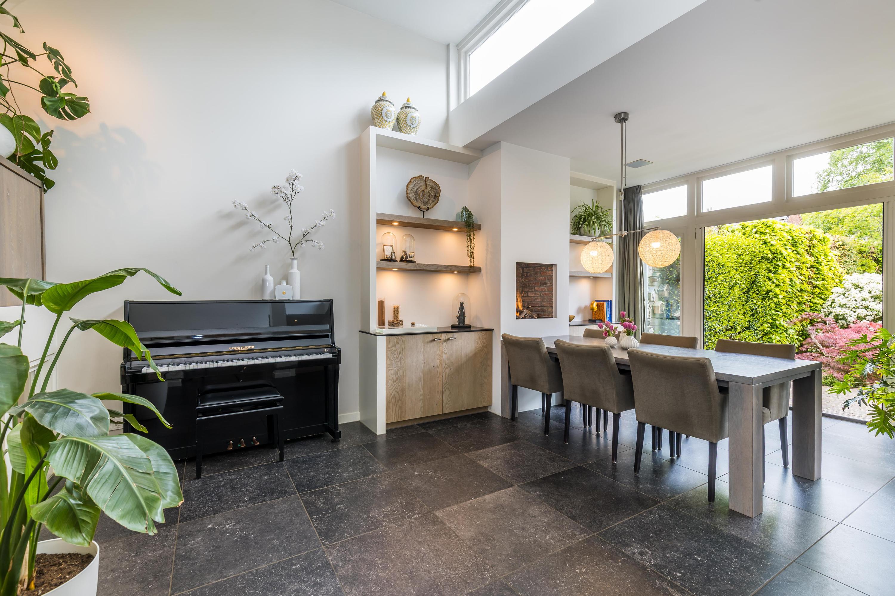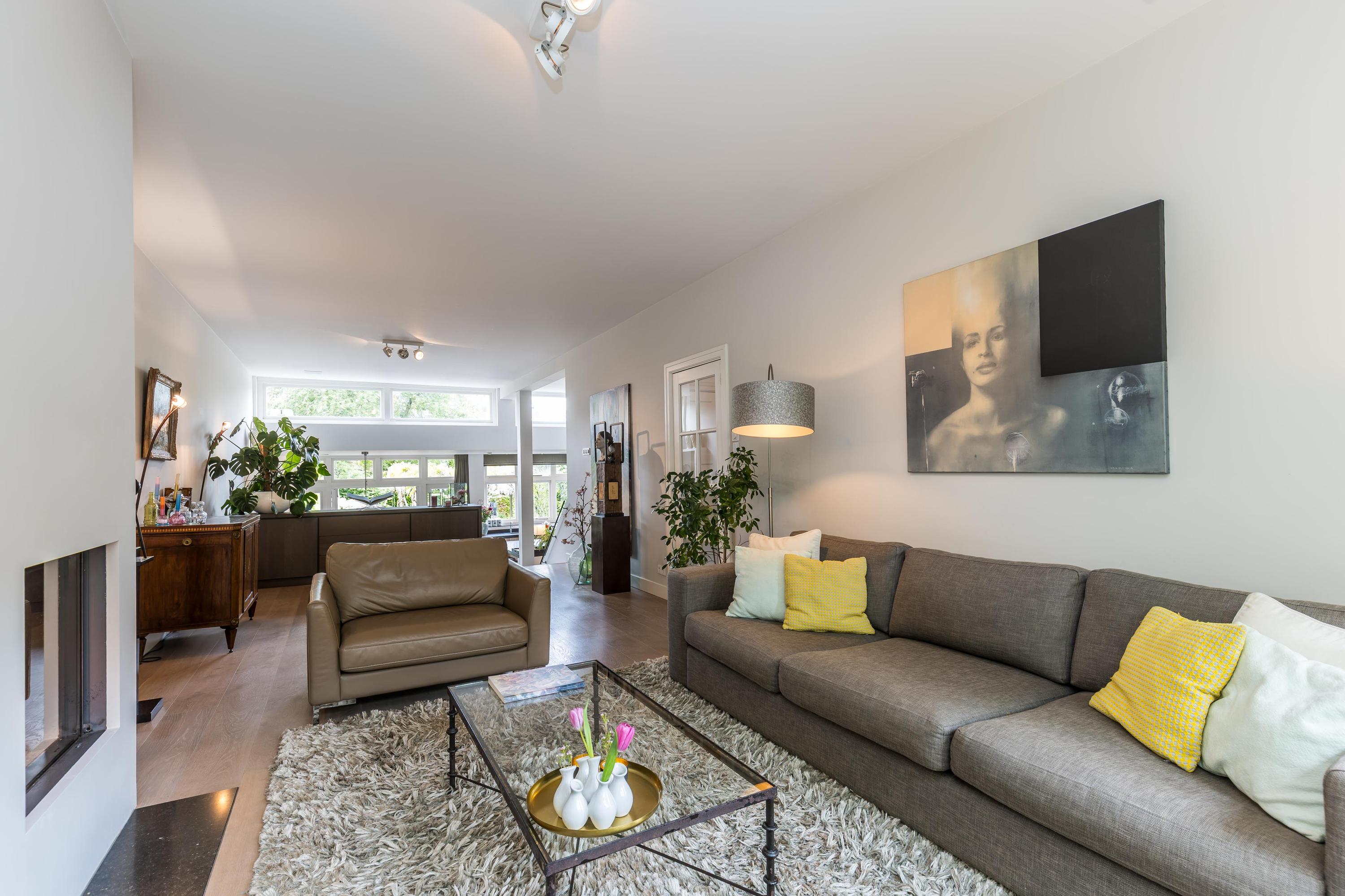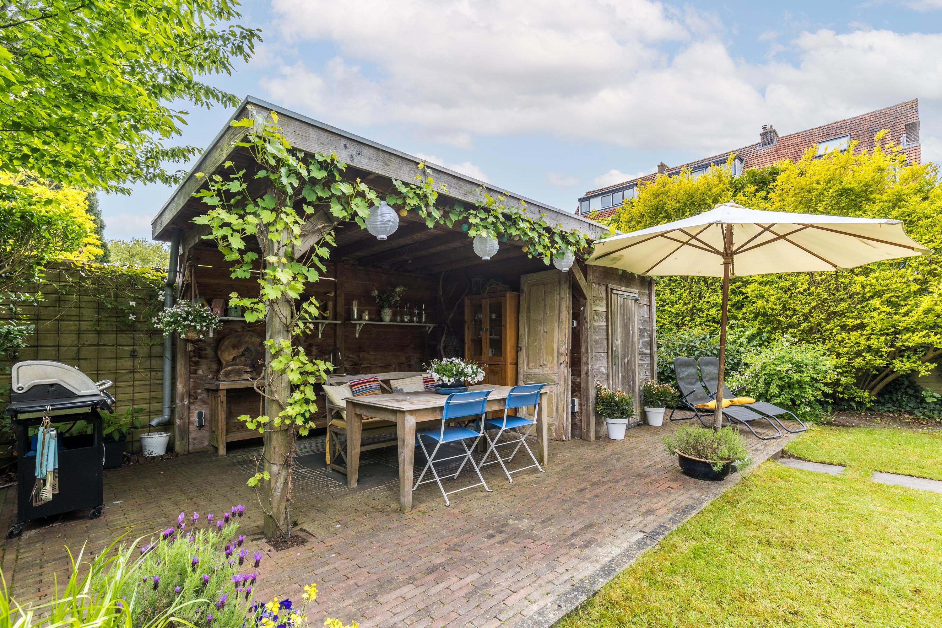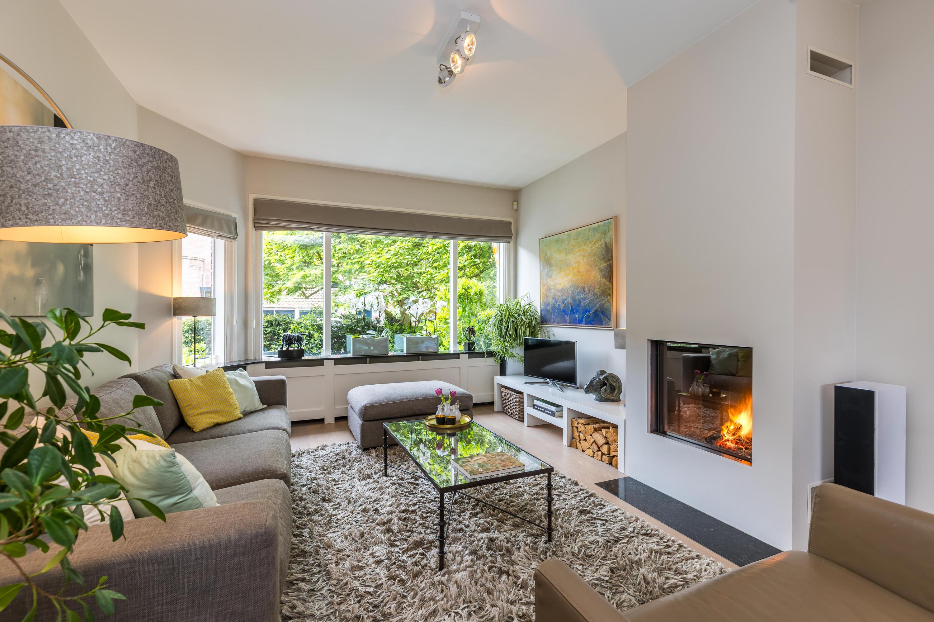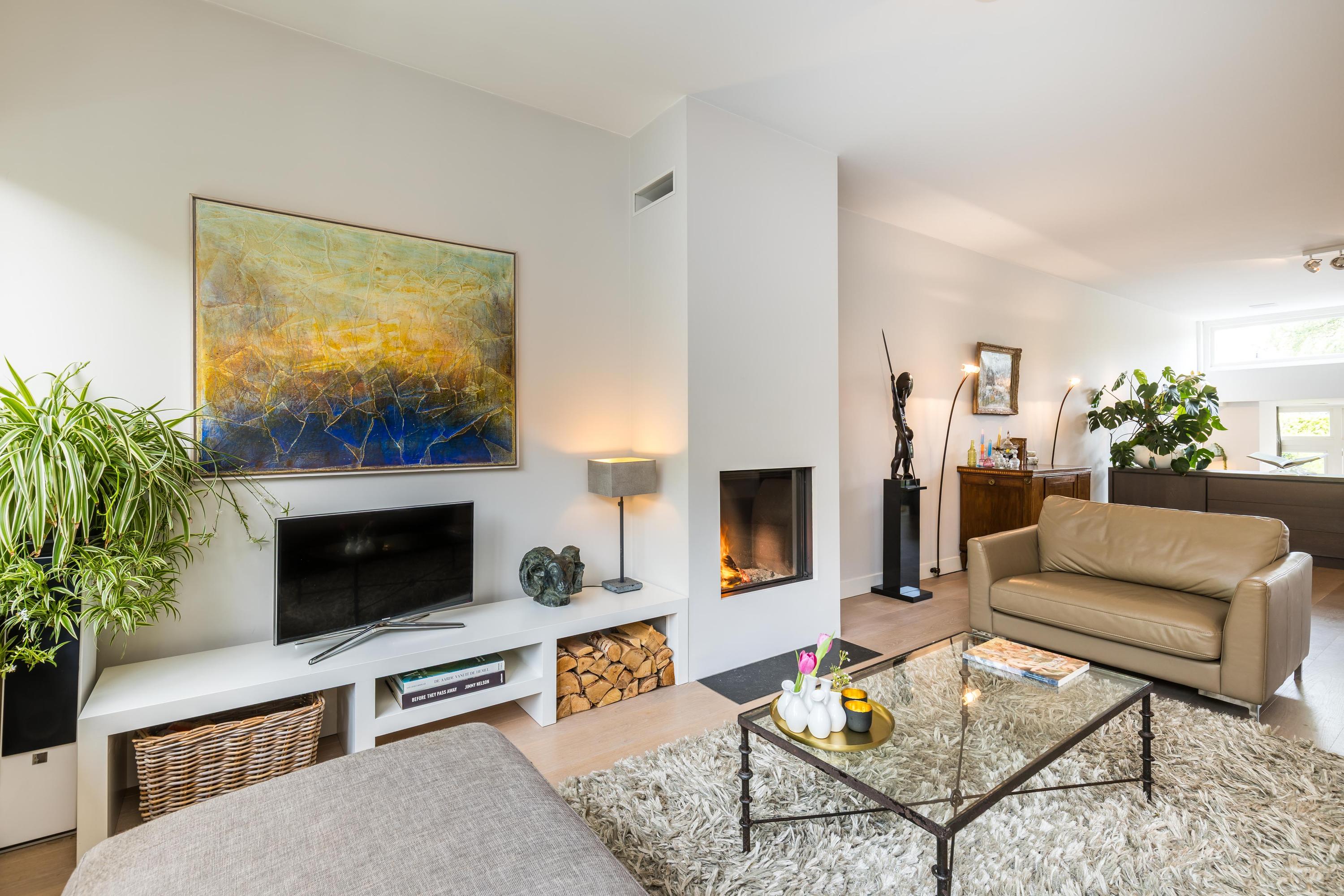 Ground floor: Entrance, light and spacious hall with extra spacious toilet with washbasin, 2 staircase cupboards for coats and shoes, beautiful wide and light living room with an oak parquet floor, the high-efficiency wood-burning fireplace that radiates a wonderful, comfortable warmth. The kitchen-diner is situated in the attractive extension at the rear. This extension has been executed to perfection, so that it feels as if it has always been like this. The gas-fired fireplace at the head of the dining table is the mood maker for many cozy dinners and drinks at home. From the kitchen-diner there is access to the basement with laundry room and to the utility room that is situated in the side extension. At the front is the storage function/shed with access to the street, ideal for putting a nice (cargo) bike or scooter inside and at the rear the utility room function with high storage cupboards, a washbasin unit, which is handy for sports shoes, coats or if you have pets. The utility room also has a door to the back garden, so you can easily go to the back garden with a green bin, for example. In addition, the back garden has a back entrance at the rear, connecting to the back path.