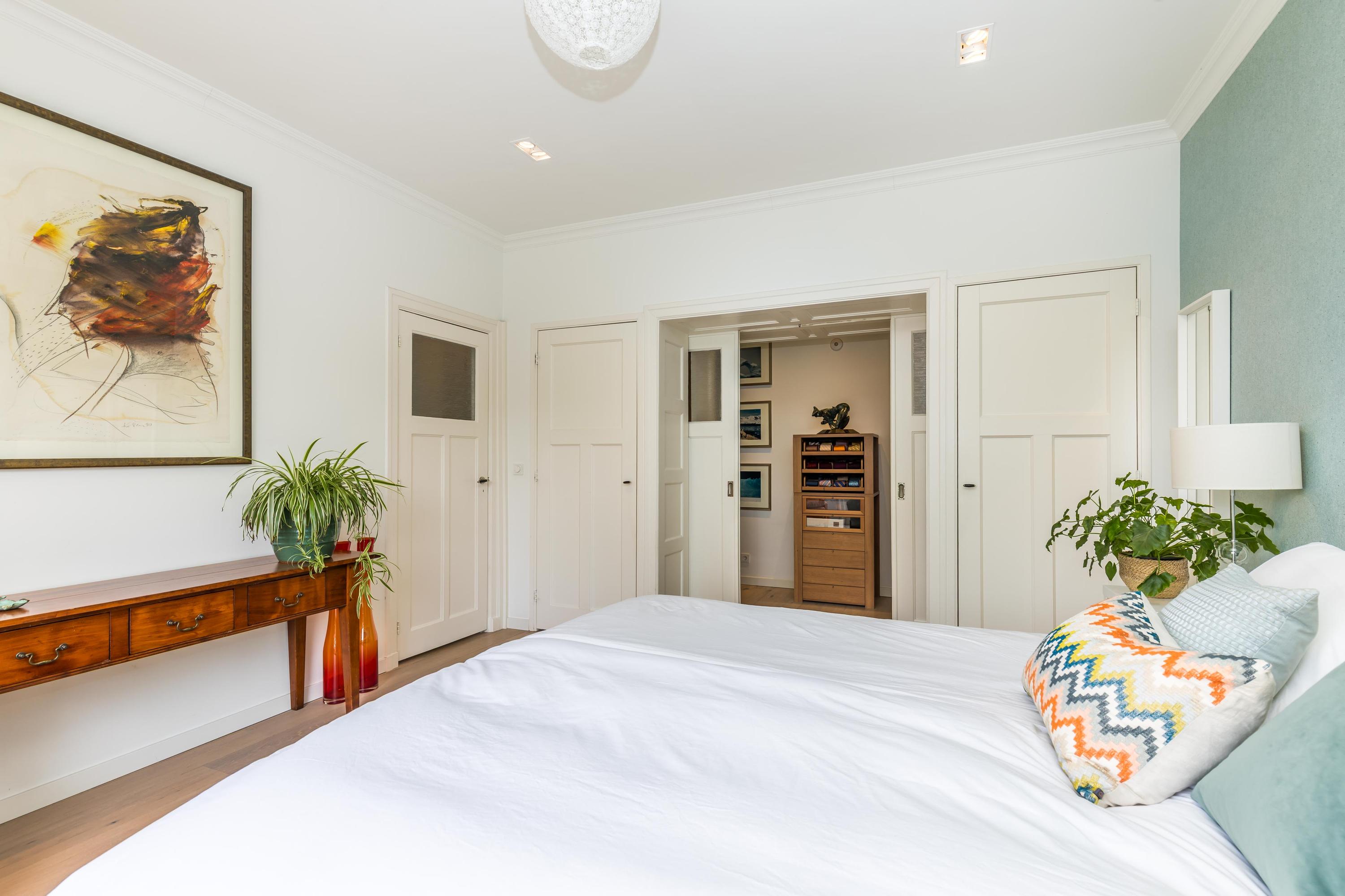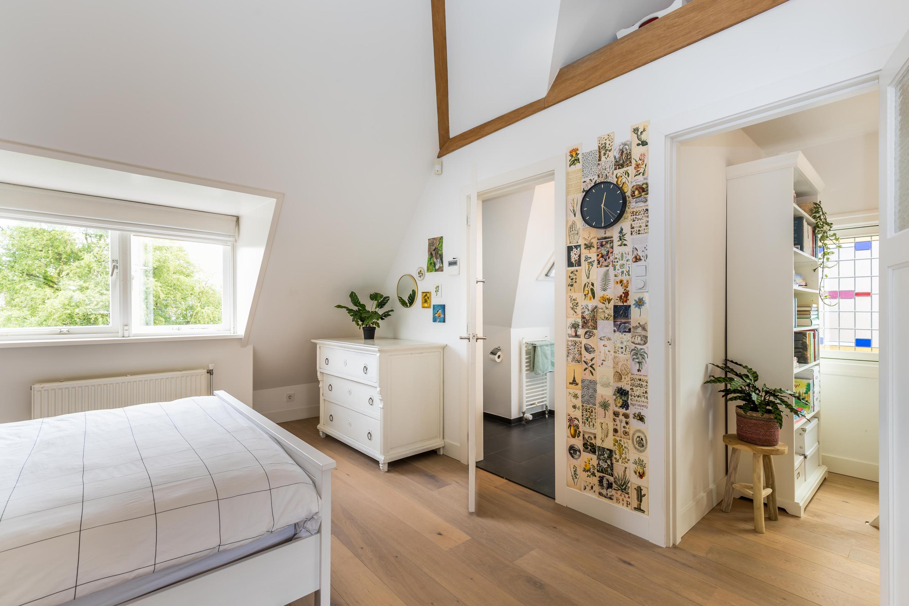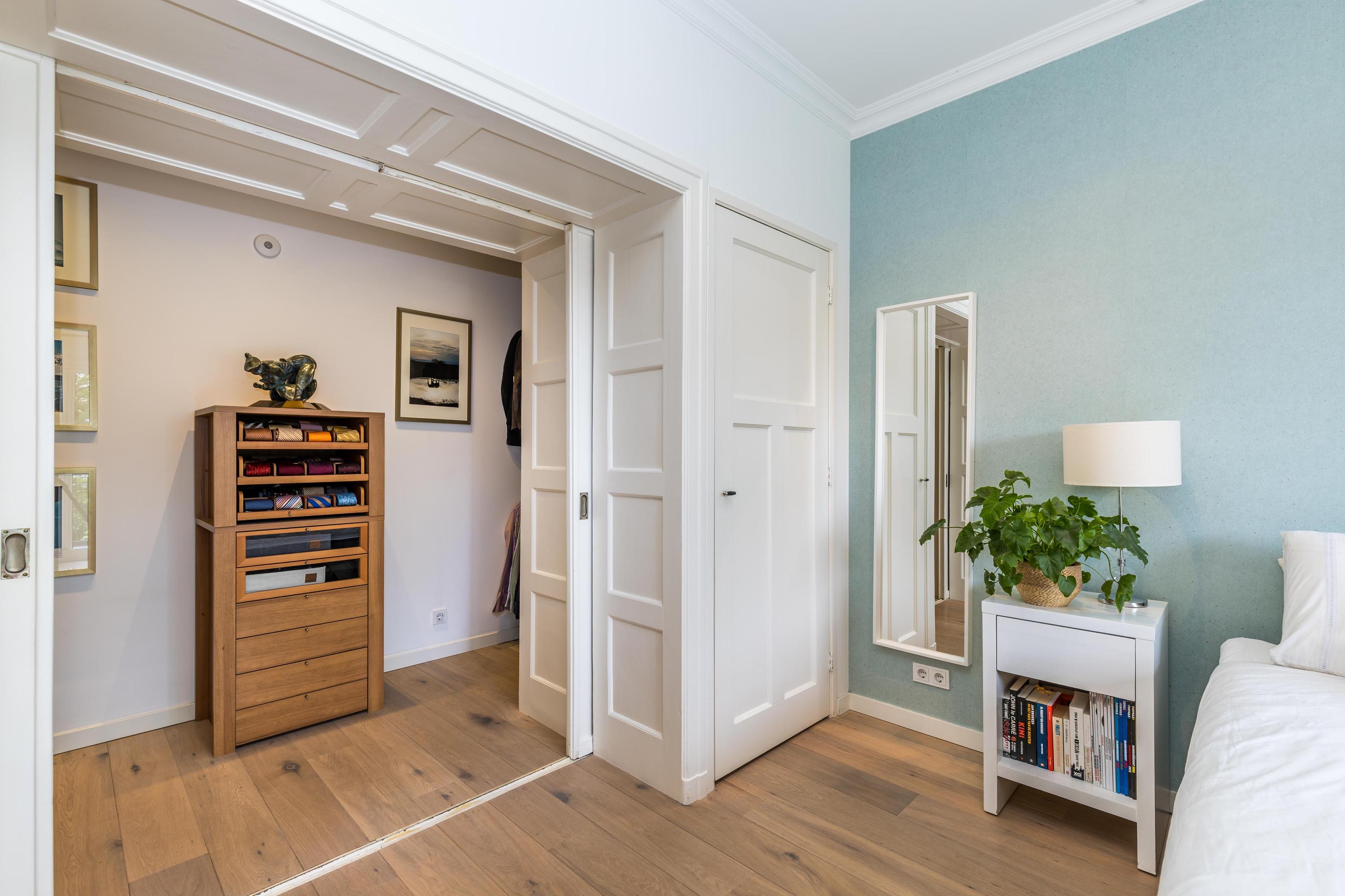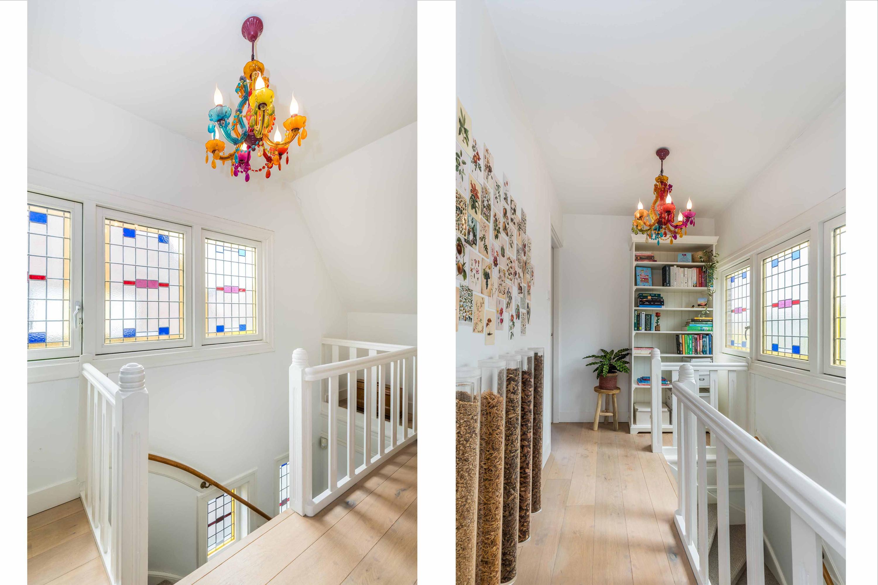 First floor: From the ground floor, the staircase to the first floor has beautiful authentic stained glass windows that are placed in double glazing and provide a pleasant and warm light in the stairwell. The entire floor has a beautiful oak floor. Once upstairs, there is the landing with toilet, the bright bathroom at the rear with walk-in shower, bath, double sink, towel radiator and electric underfloor heating. The master bedroom is light and quiet and has an en suite walk-in closet that can be closed off with original sliding doors, there are also patio doors to the spacious balcony across the entire width of the building. From this bedroom and the balcony the view of the beautiful backyard is breathtakingly beautiful. At the front is the 2nd spacious bedroom (formerly 2 bedrooms), currently used as a study with a super charming balcony and a view of the beautiful crown of the magnolia. Staircase to the 2nd floor also equipped with original stained glass windows in double glazing.