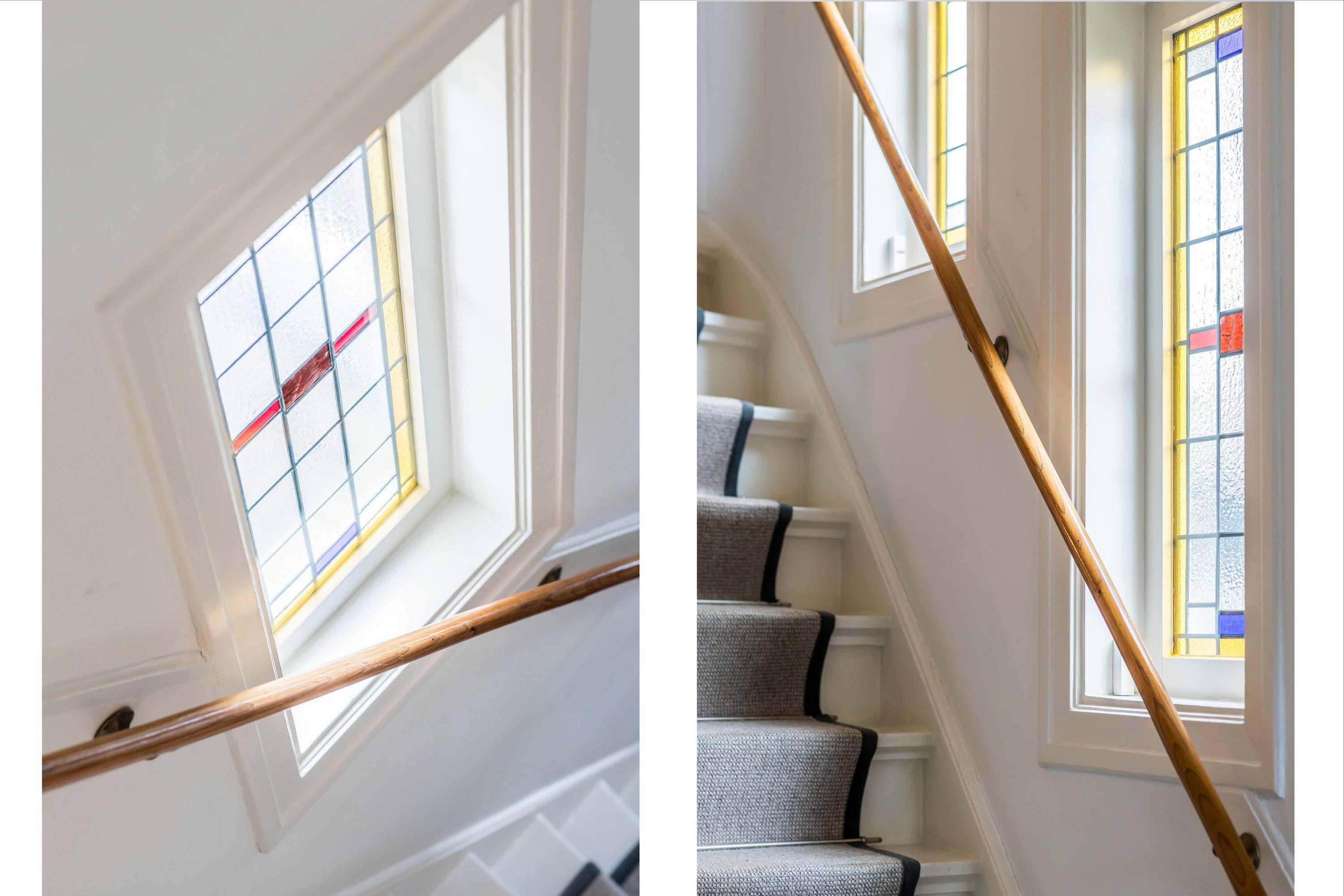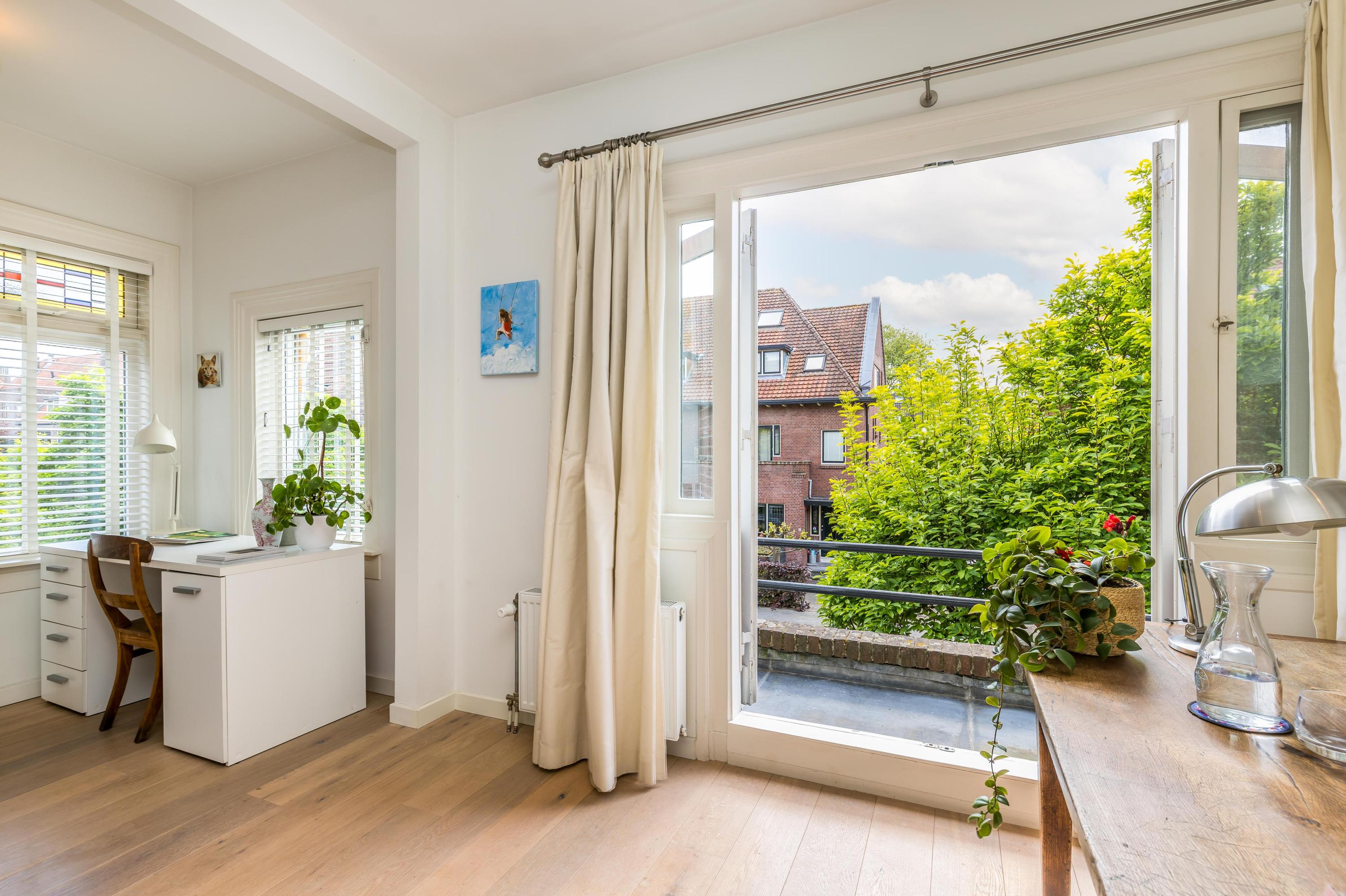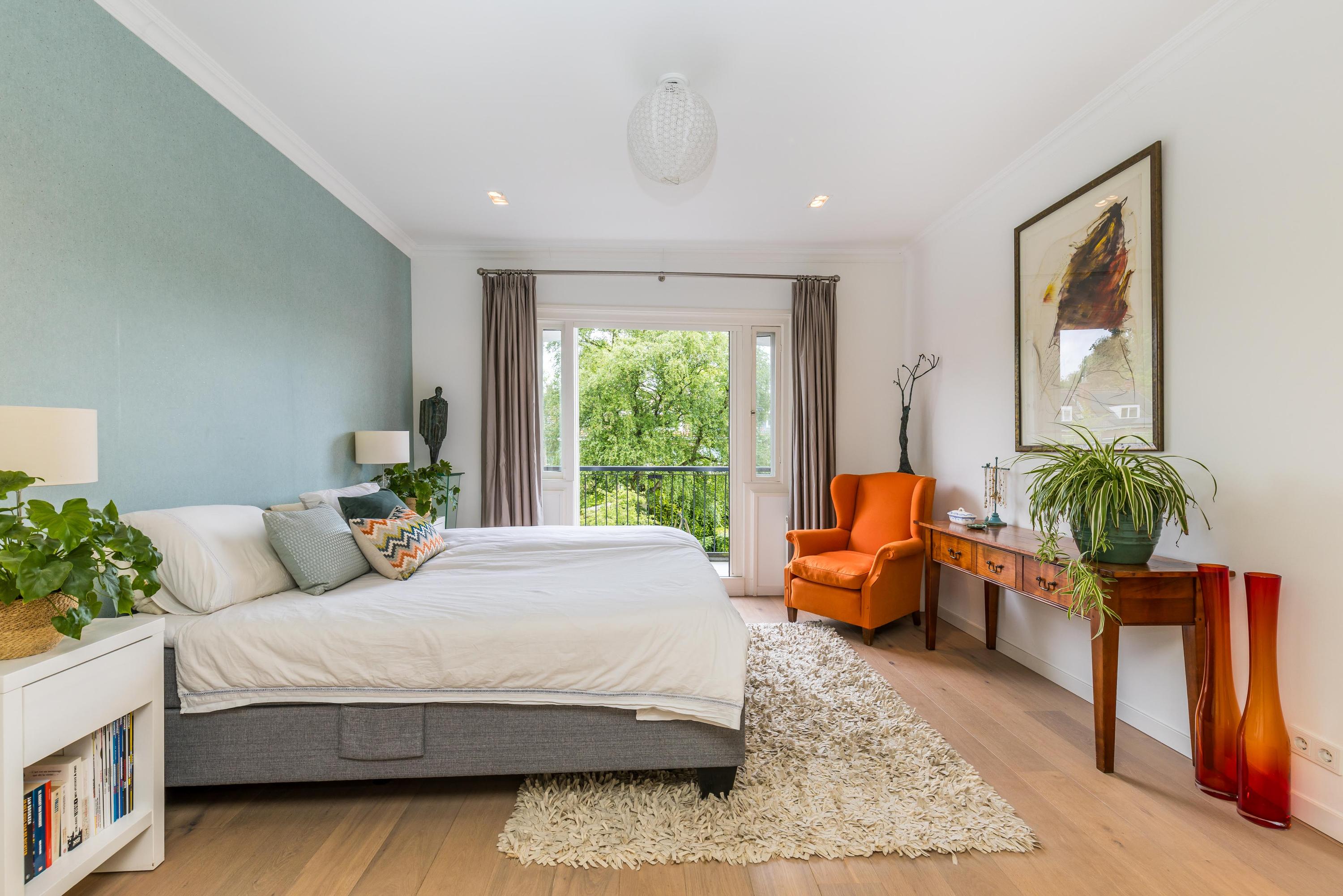 First floor: From the ground floor, the staircase to the first floor has beautiful authentic stained glass windows that are placed in double glazing and provide a pleasant and warm light in the stairwell. The entire floor has a beautiful oak floor. Once upstairs, there is the landing with toilet, the bright bathroom at the rear with walk-in shower, bath, double sink, towel radiator and electric underfloor heating. The master bedroom is light and quiet and has an en suite walk-in closet that can be closed off with original sliding doors, there are also patio doors to the spacious balcony across the entire width of the building. From this bedroom and the balcony the view of the beautiful backyard is breathtakingly beautiful. At the front is the 2nd spacious bedroom (formerly 2 bedrooms), currently used as a study with a super charming balcony and a view of the beautiful crown of the magnolia. Staircase to the 2nd floor also equipped with original stained glass windows in double glazing.
