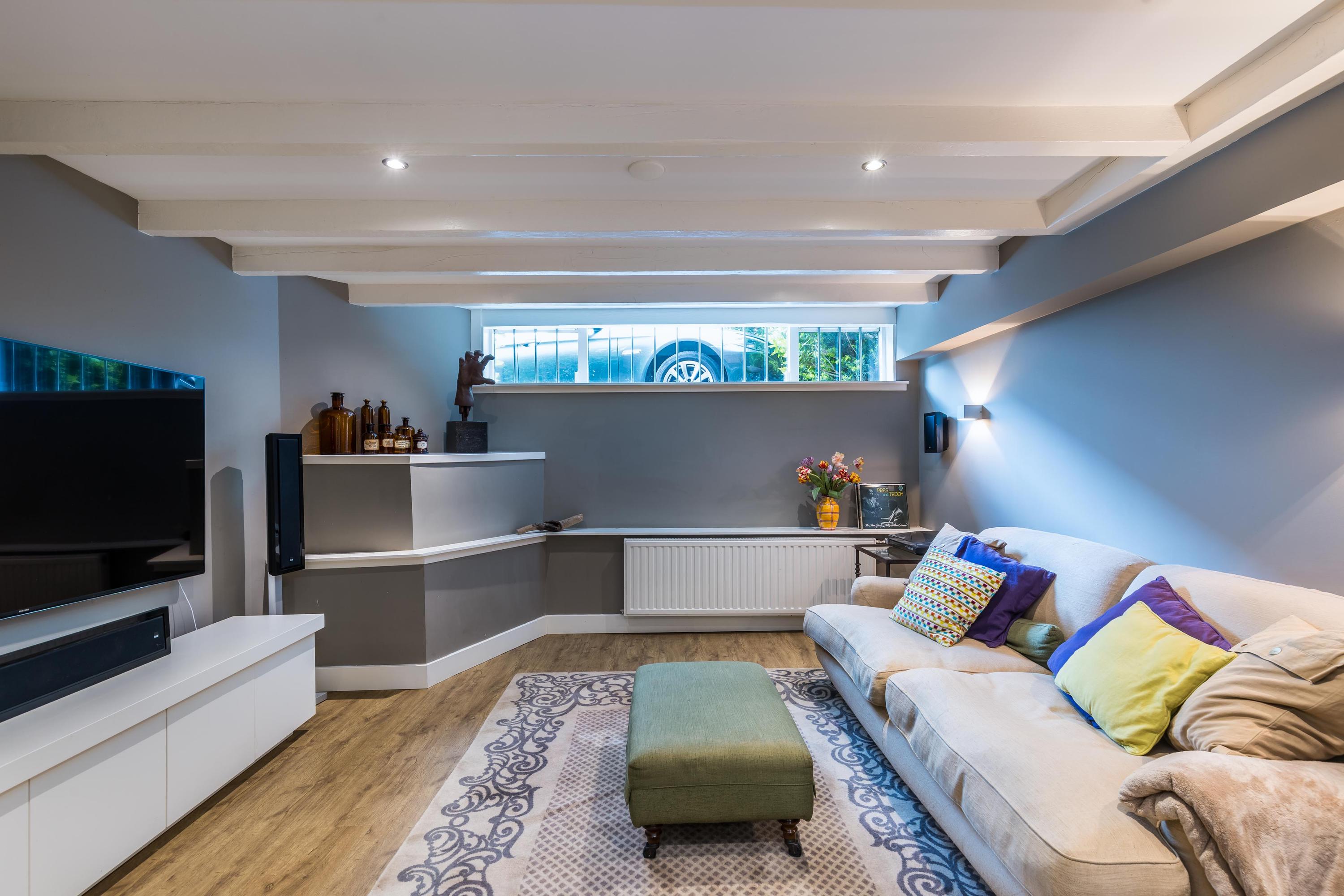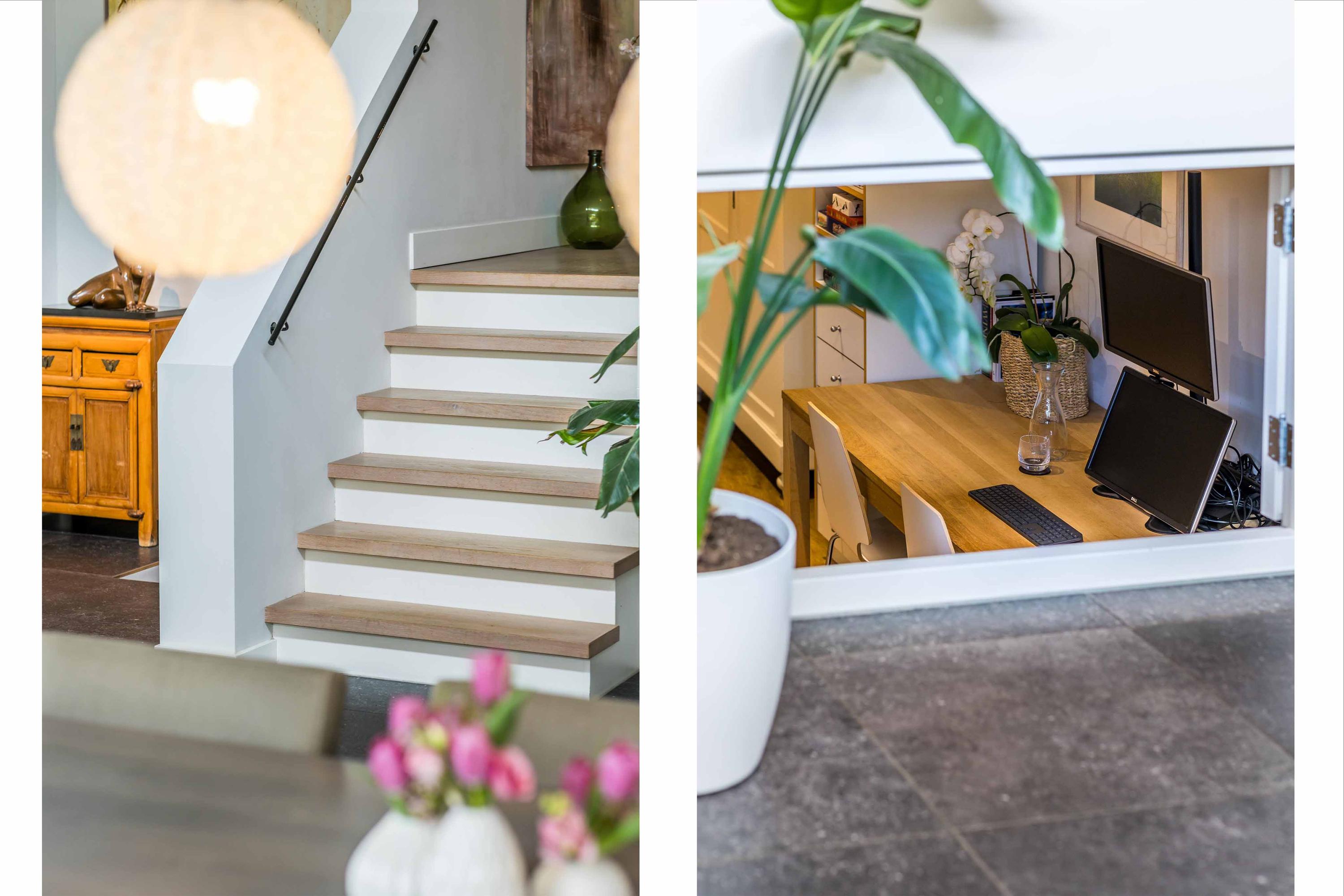 Basement: Height approx. 210 cm under the beams (between the beams it is even higher) and daylight from 2 sides (direct and indirect) and spacious crawl space for storage. This floor is extremely suitable for realizing dreams such as a home cinema/chill room/fitness room/playroom/home office and is already furnished with a lockable TV/chill room, home office, separate laundry room and storage space. The spacious view through to the kitchen, where the windows can be opened, is a brilliant idea to maintain contact between the rooms, but also to be able to close them off.