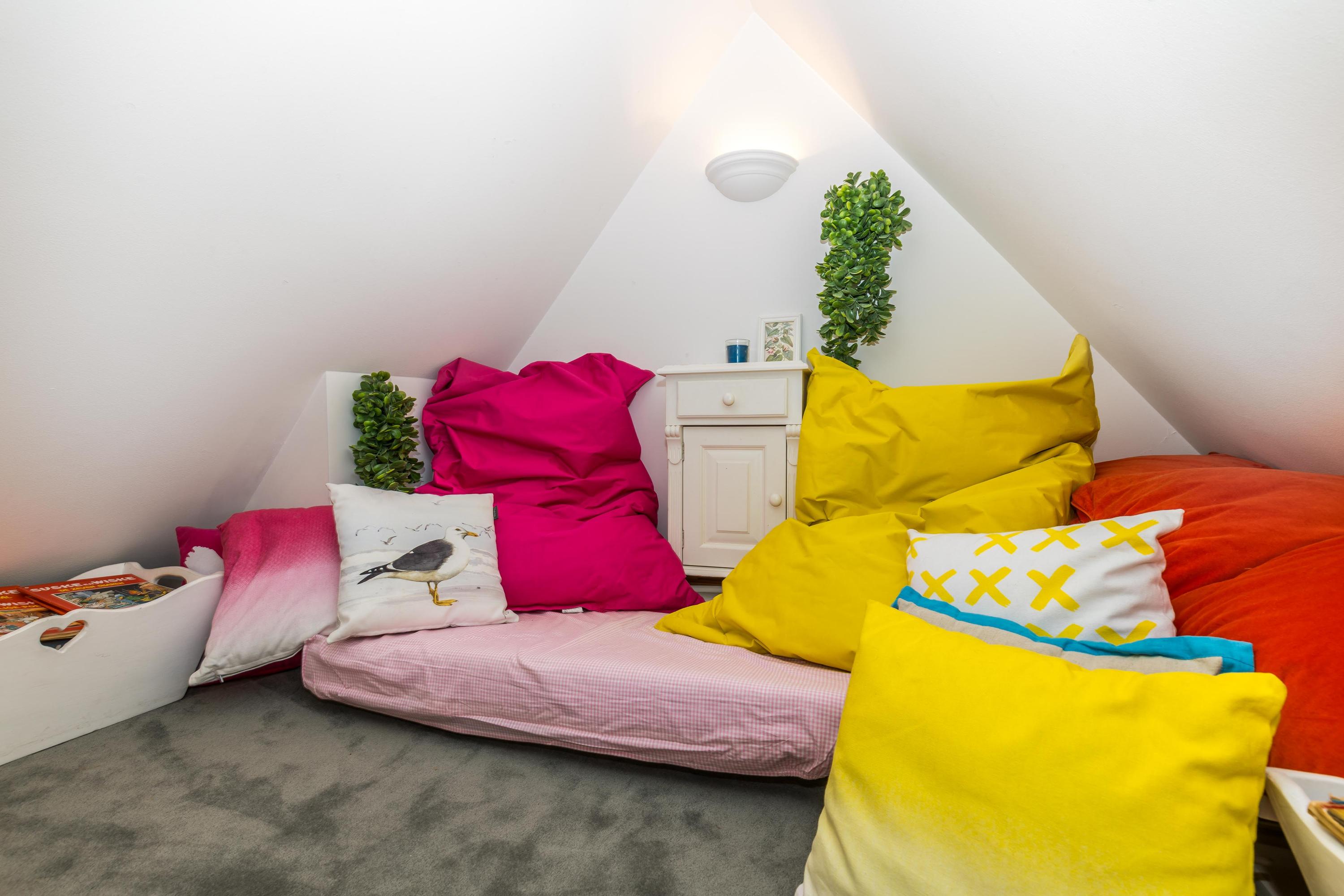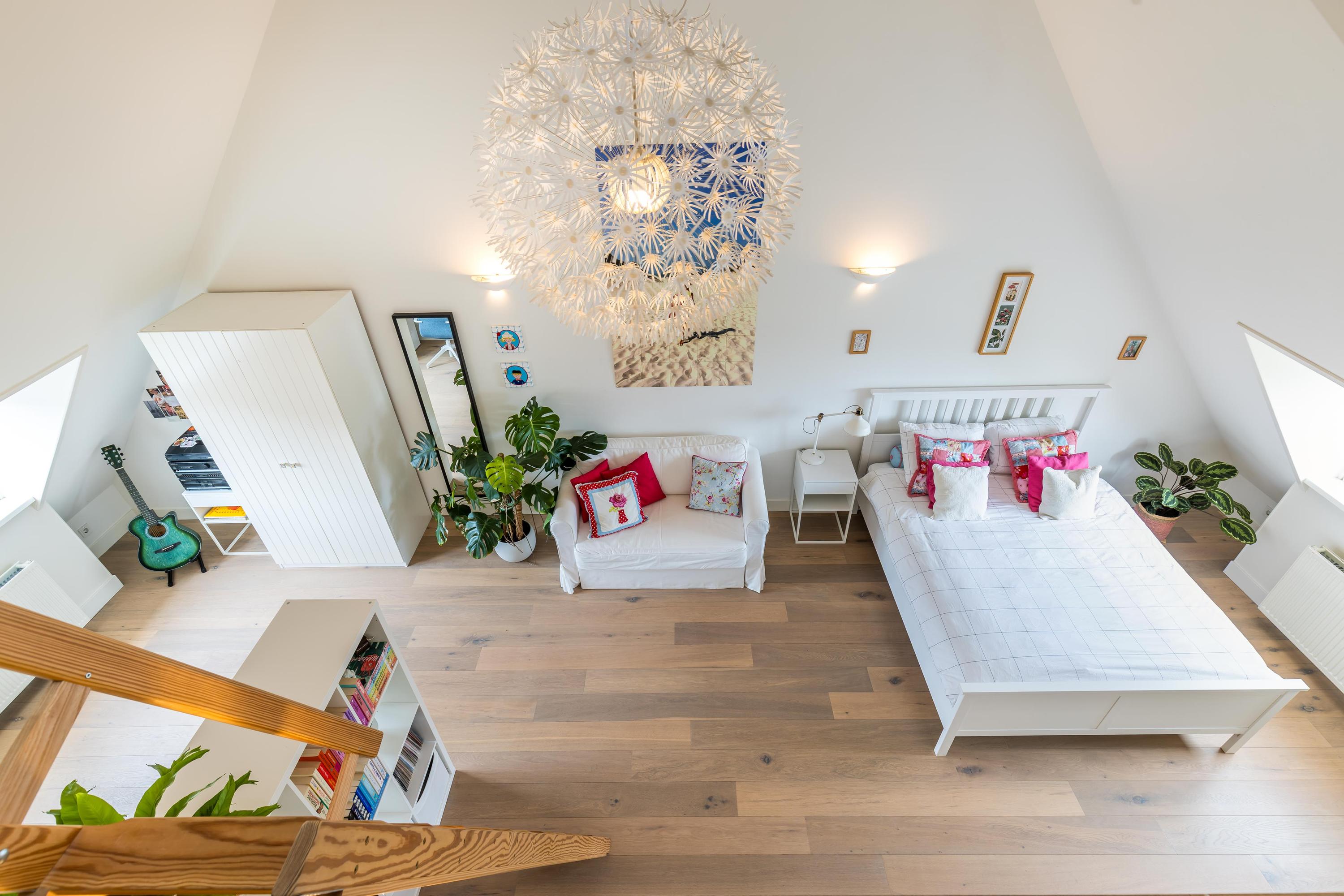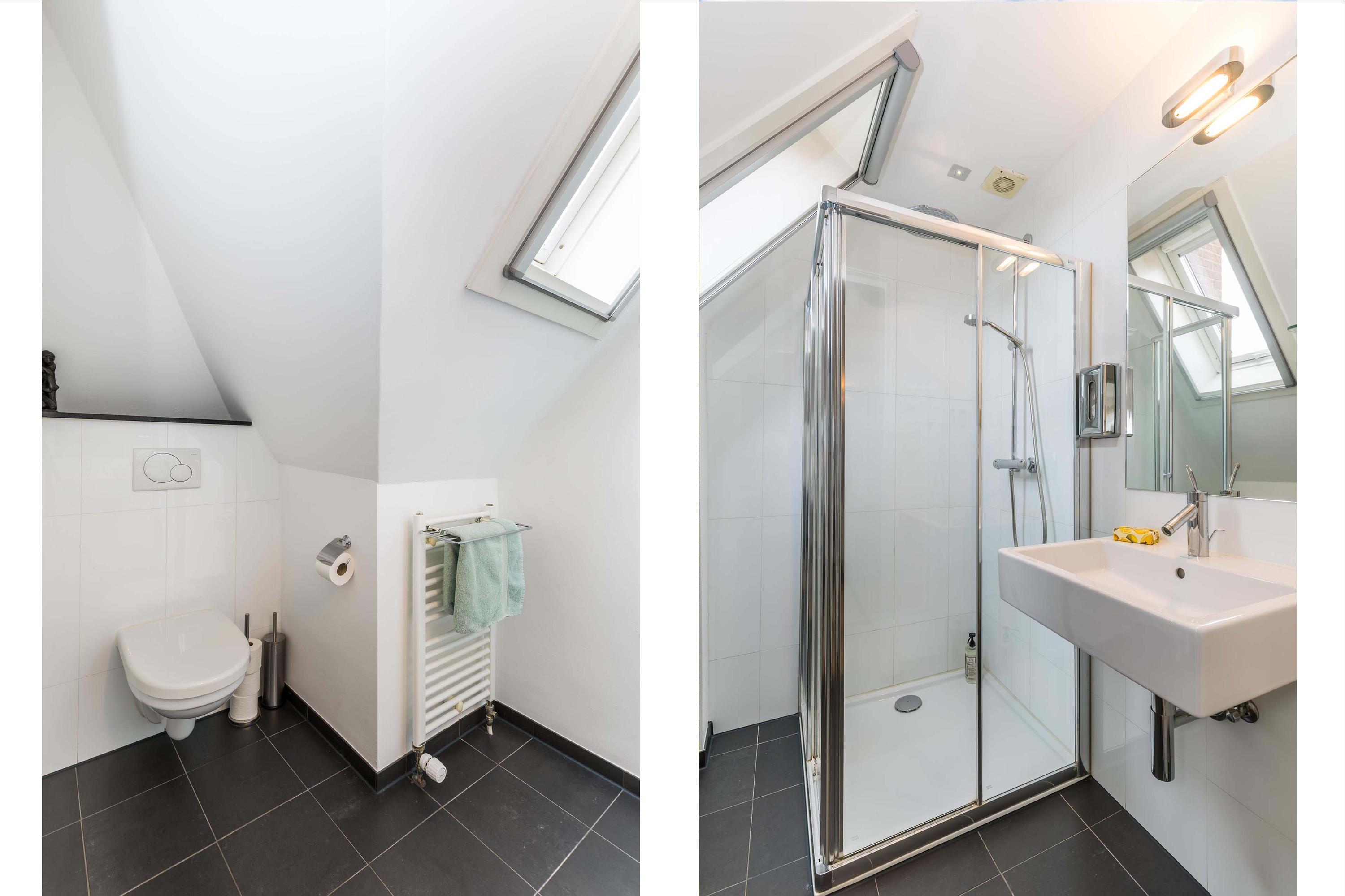Second floor: This floor also has the beautiful oak floor, light and spacious landing with storage cupboard, enormous bedroom (which can be divided into 2-3 rooms relatively easily) with en suite (second) bathroom equipped with Velux skylight with mosquito net and blinds, shower, toilet, sink and towel radiator. This fantastic room has a spectacular height up to the ridge and a vide accessible by fixed staircase. There are examples of similar houses in the street where an additional floor has been created at the vide level and in that space 1-2 extra rooms have been created.