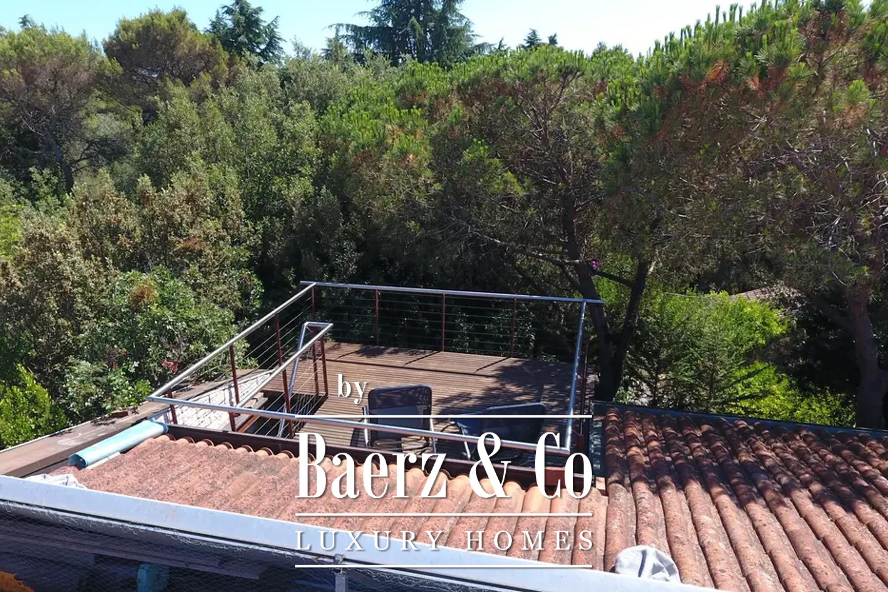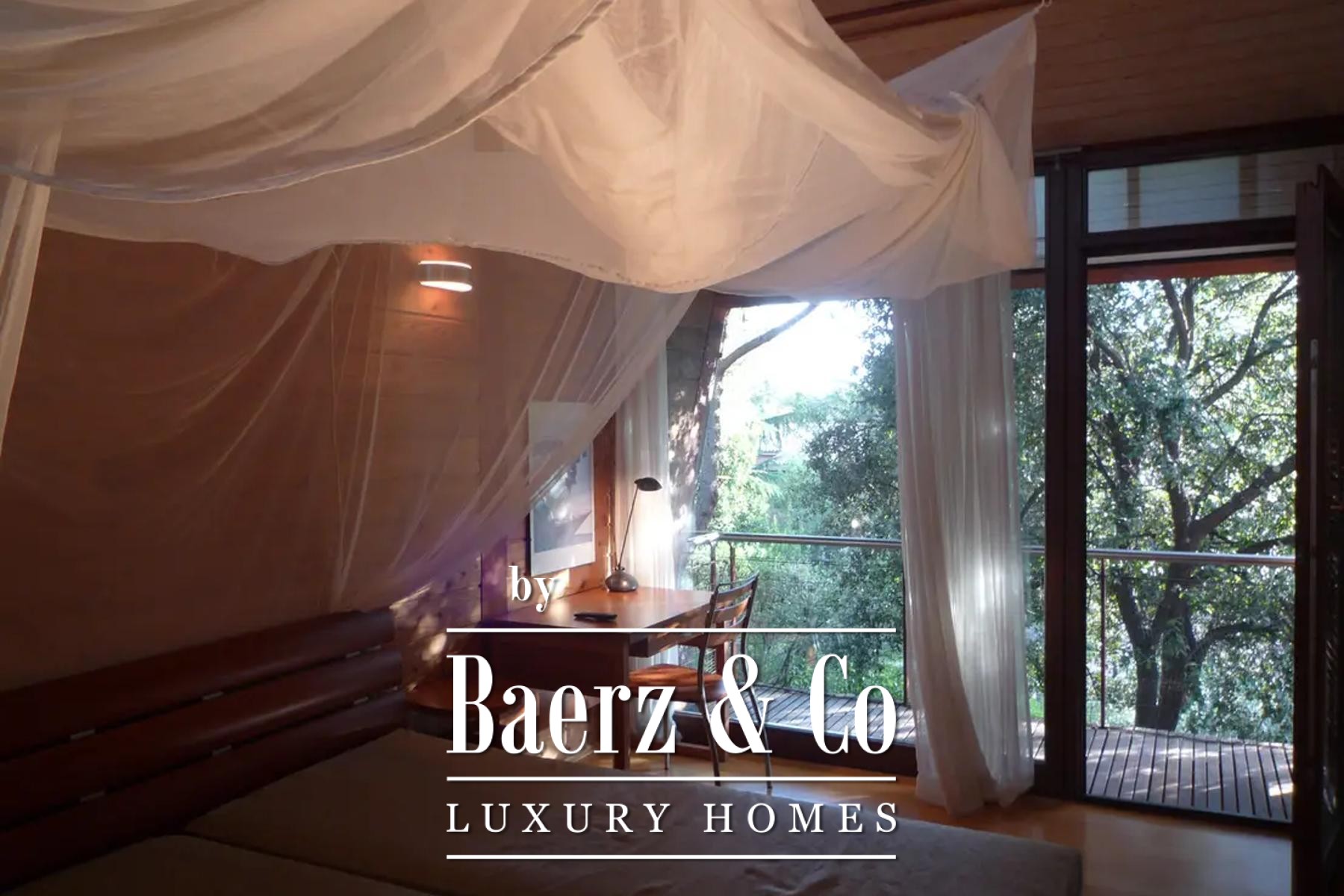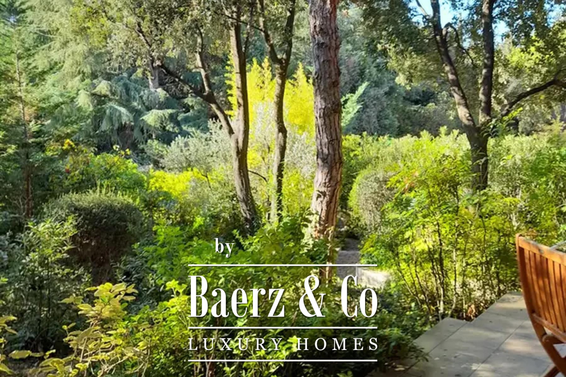 Upstairs, four tranquil bedrooms open onto balconies, with a gallery and shaded terrace connecting to a rooftop enclave for contemplative moments above the garden. The lower level hosts a summer kitchen framed in glass, and a wellness area with sauna, pools, and a landscaped terrace, while a cellar provides storage, central systems, and laundry.
