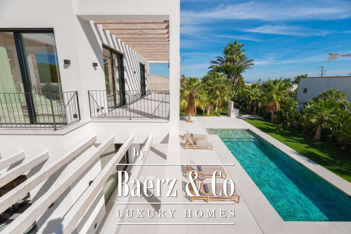 The surroundingsThis stylish villa is located in Sa Carroca, a popular location in the south of Ibiza. The area is known for its excellent accessibility and quiet, authentic atmosphere. From the villa you are within a six to eight minute drive of the beautiful beaches of Playa d'en Bossa or Ses Salines, where the crystal-clear waters and contemporary beach clubs can provide relaxation. The same number of car minutes also puts you at Ibiza's airport. The lively center of Ibiza Town, full of boutiques, restaurants and cultural hotspots, is just fifteen minutes away. Sa Carroca itself offers a charming selection of local eateries, supermarkets and a weekly market, so you never have to drive far for your daily needs. The villa's location also offers spectacular views of both the shimmering sea and the stunning hills, putting all the best Ibiza has to offer at your fingertips.The villaThis modern yet charming villa has a constructed area of 284m2 on a generous 1080m2 plot and has 4 bedrooms, 3 bathrooms and 1 guest toilet. The house combines contemporary style with rustic Ibiza elements, creating a harmonious balance between luxury and a comfortable atmosphere. The interior is bright and open, with extensive use of high-quality materials such as light woods and white stucco, giving the villa a serene feel. Upon entering, you are greeted by an impressive open living room with a beautiful view of the garden, with the pool as its centerpiece. The fully equipped kitchen, featuring a large cooking island, is perfect for culinary enthusiasts. All built-in appliances are of the highest quality, and the kitchen is outfitted with all the desirable conveniences. This room flows seamlessly into the grand dining area and adjoining living room. The living room features a spacious TV corner, ideal for relaxing with family and friends. This home is fully equipped as a smart home: all essential functions, such as lighting, air conditioning,