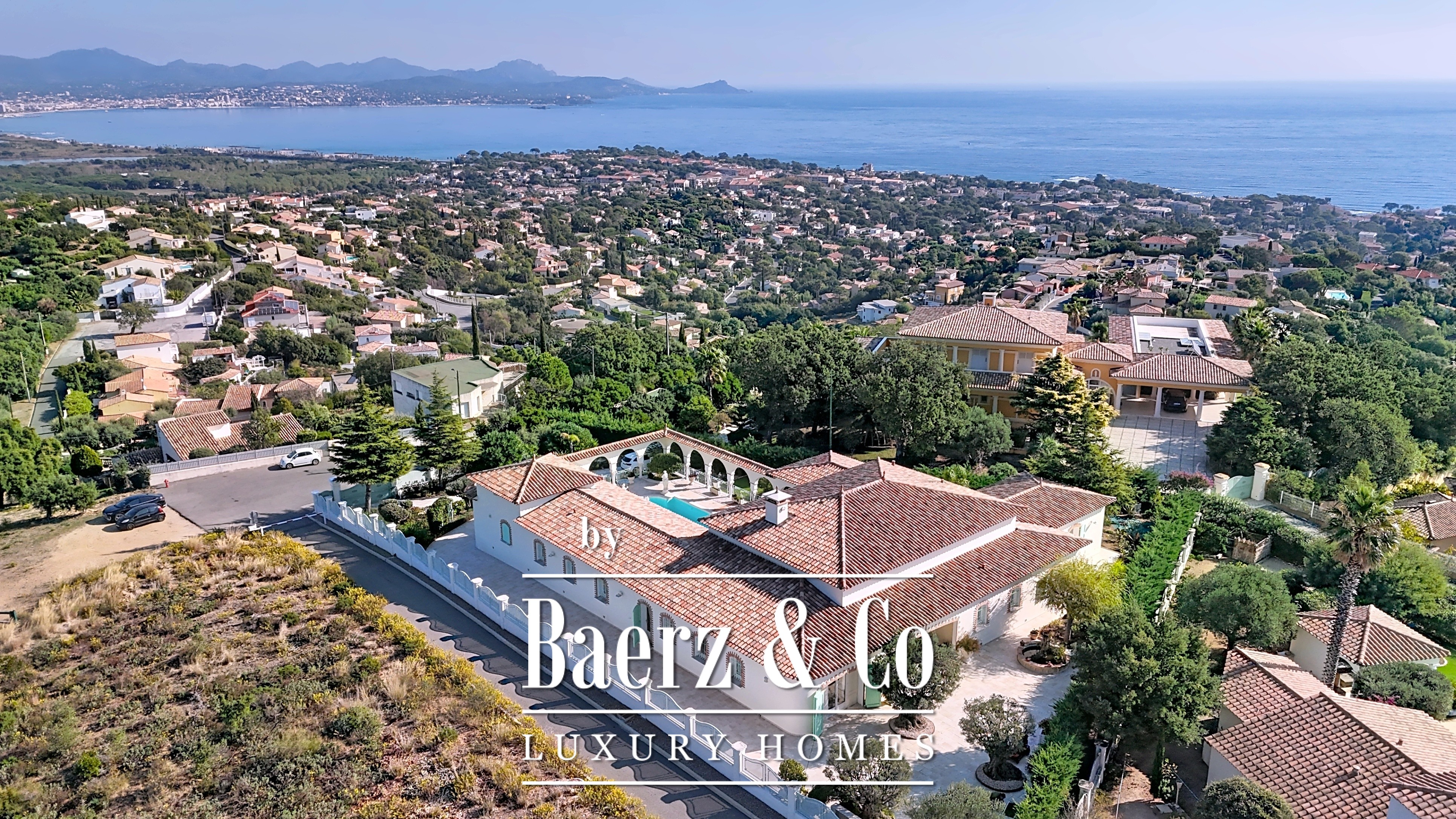 Villa Saint-Raphael with panoramic sea view offers a rare combination of timeless architecture and Mediterranean light. This hacienda-style residence unfolds across 400 m² of living space, set within more than 2,000 m² of curated gardens, presiding over vistas of the Mediterranean, the Estérel hills, and the Gulf of Saint-Tropez.