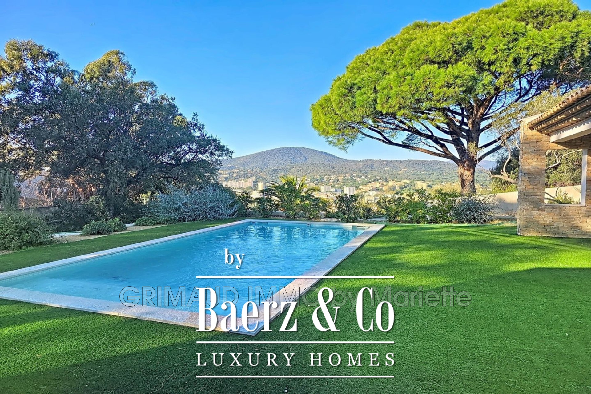 Outdoors, the landscaped garden is curated with Mediterranean plantings, automated irrigation, and night lighting, creating an inviting sanctuary for quiet afternoons or evening gatherings. The 810 m² plot offers two terraces, a central patio, and a sunlit 5 by 10 metre swimming pool. A 28 m² garage and two parking spaces provide convenience within the property’s boundaries. In this luxury villa for sale in Sainte-Maxime, comfort and discreet sophistication are the defining notes.