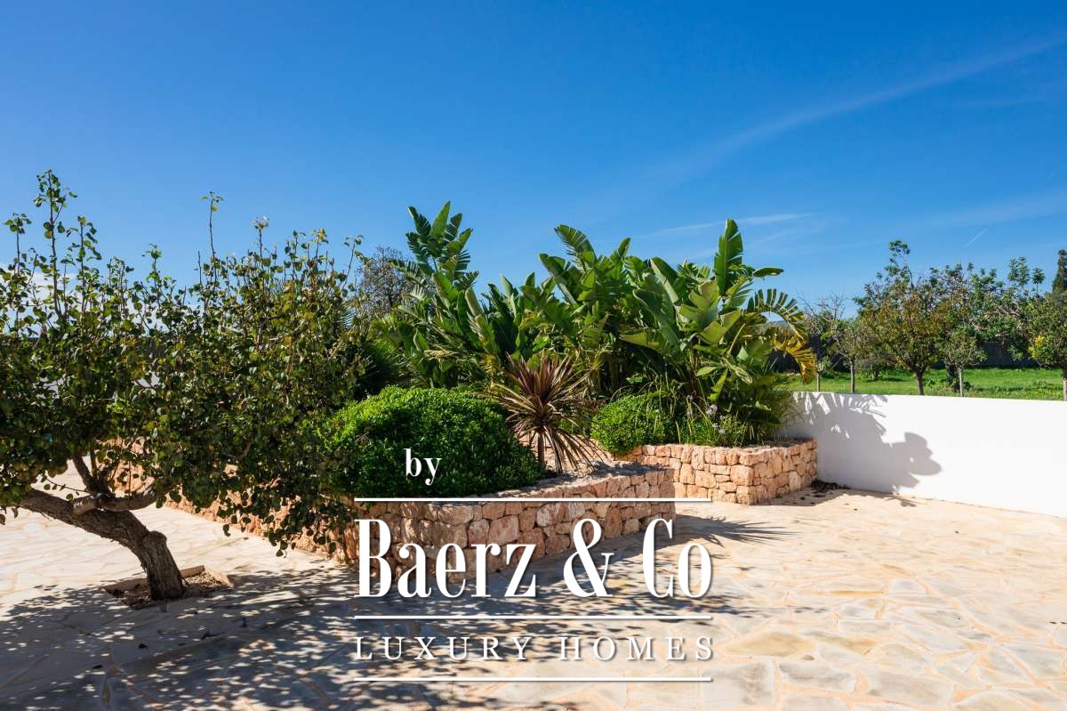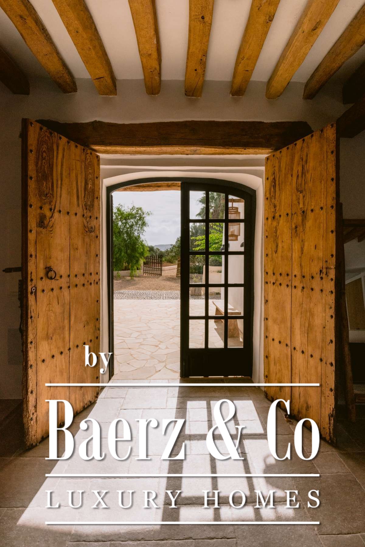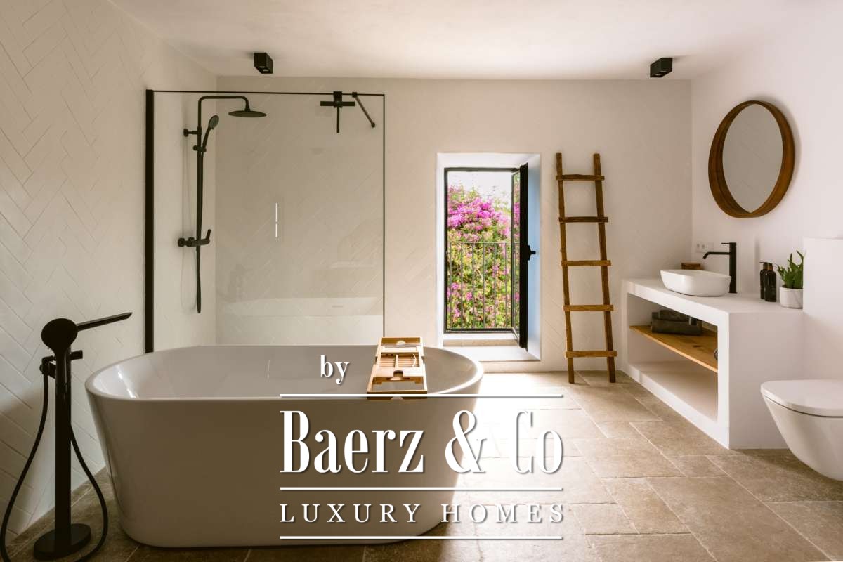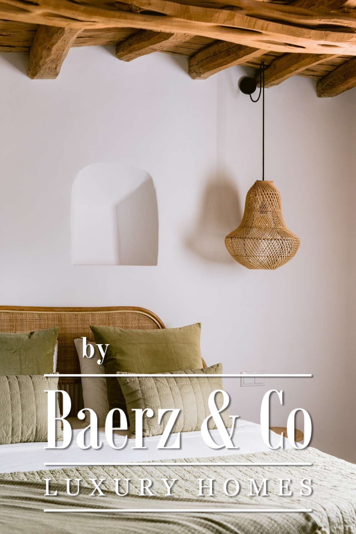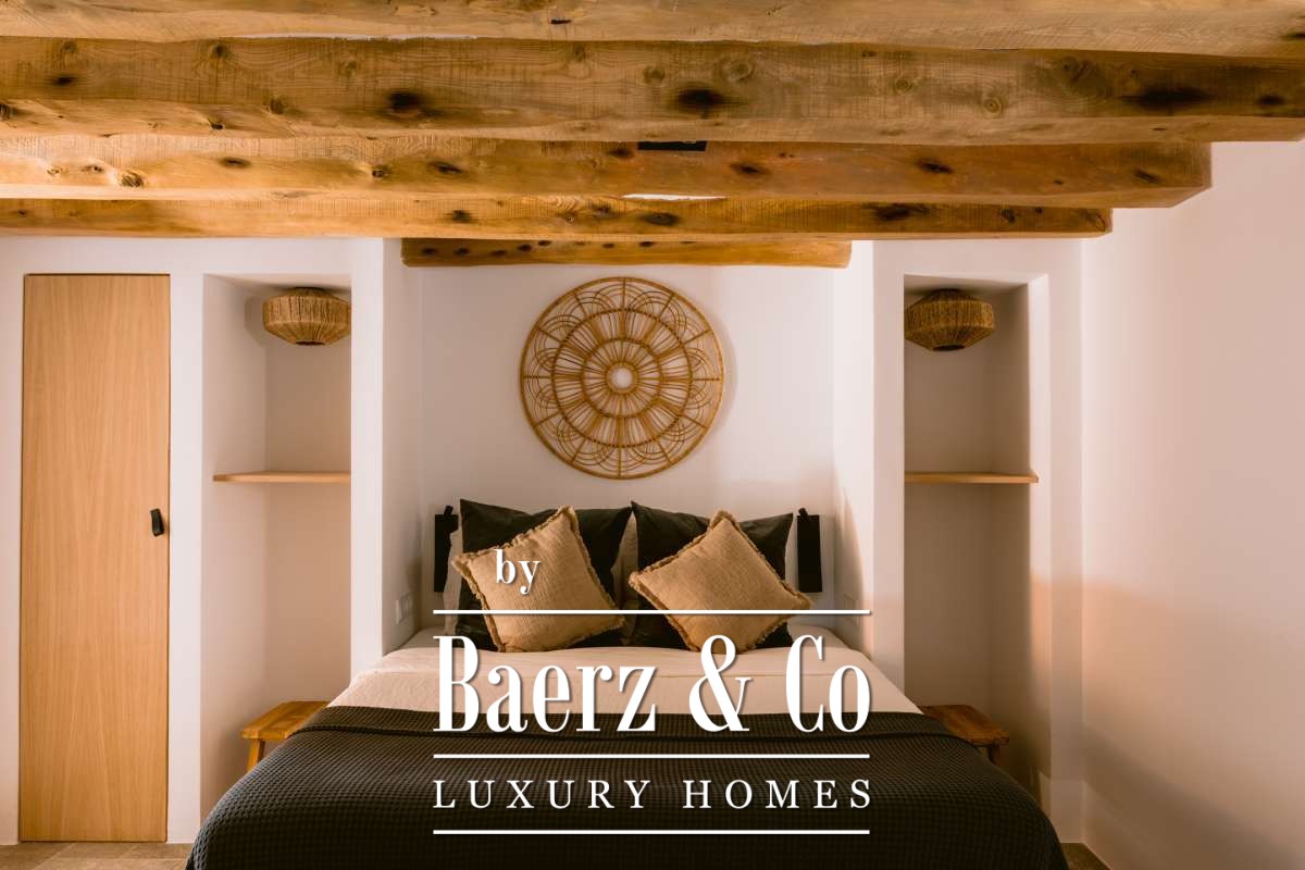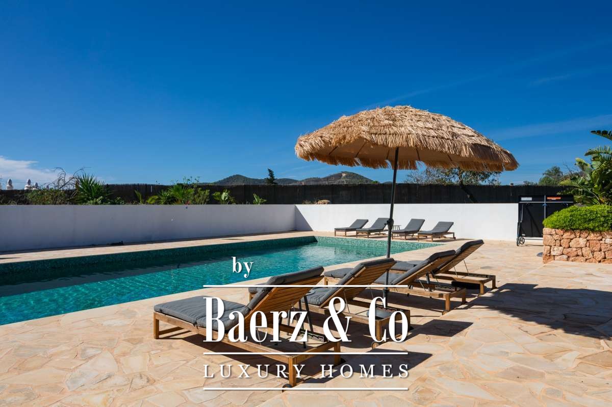 Fully renovated in 2023, the main residence unfolds across 440 m² with a refined bohemian chic aesthetic. Enter into an open-plan living and dining space arranged on varied levels, balancing modern design with authentic Ibicencan character. The designer kitchen is equipped with contemporary appliances, while each of the five bedrooms is ensuite and the master features its own bathtub. The separate guest house, positioned 50 meters from the main home for maximum privacy, presents two further bedrooms, a shared bathroom, and a luminous open-plan living area, adaptable for guests or extended stays.