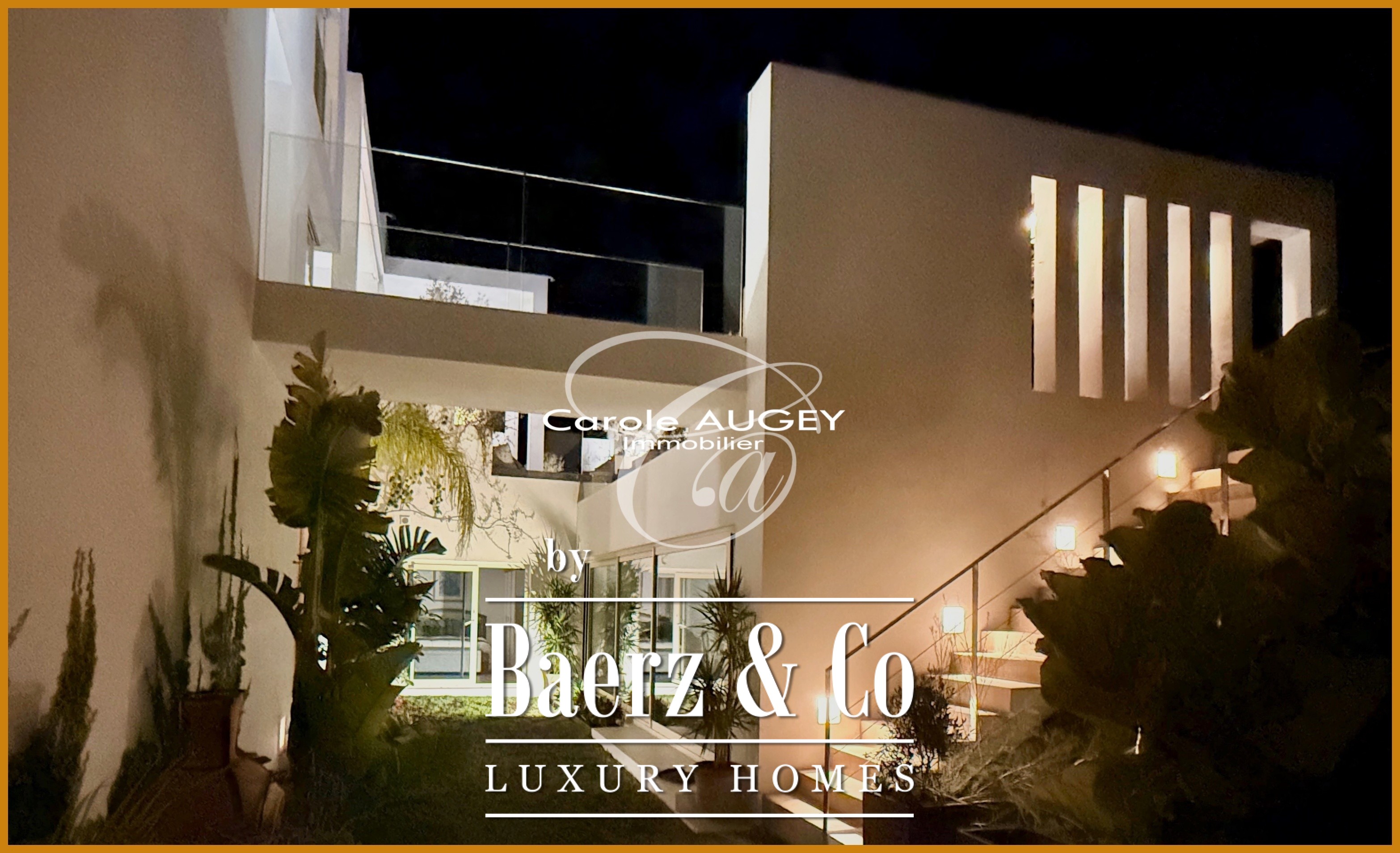 Fully rebuilt and completed in 2023, the villa reveals refined, contemporary design across its 345 m² of living area, with a total built space of over 400 m² on a 1,398 m² plot. Five suites, including a studio with separate access, provide privacy and effortless circulation. Floor-to-ceiling windows, generous terraces, and a striking XXL double-sided fireplace anchor the main living space, while the fully equipped kitchen opens seamlessly onto outdoor living areas.