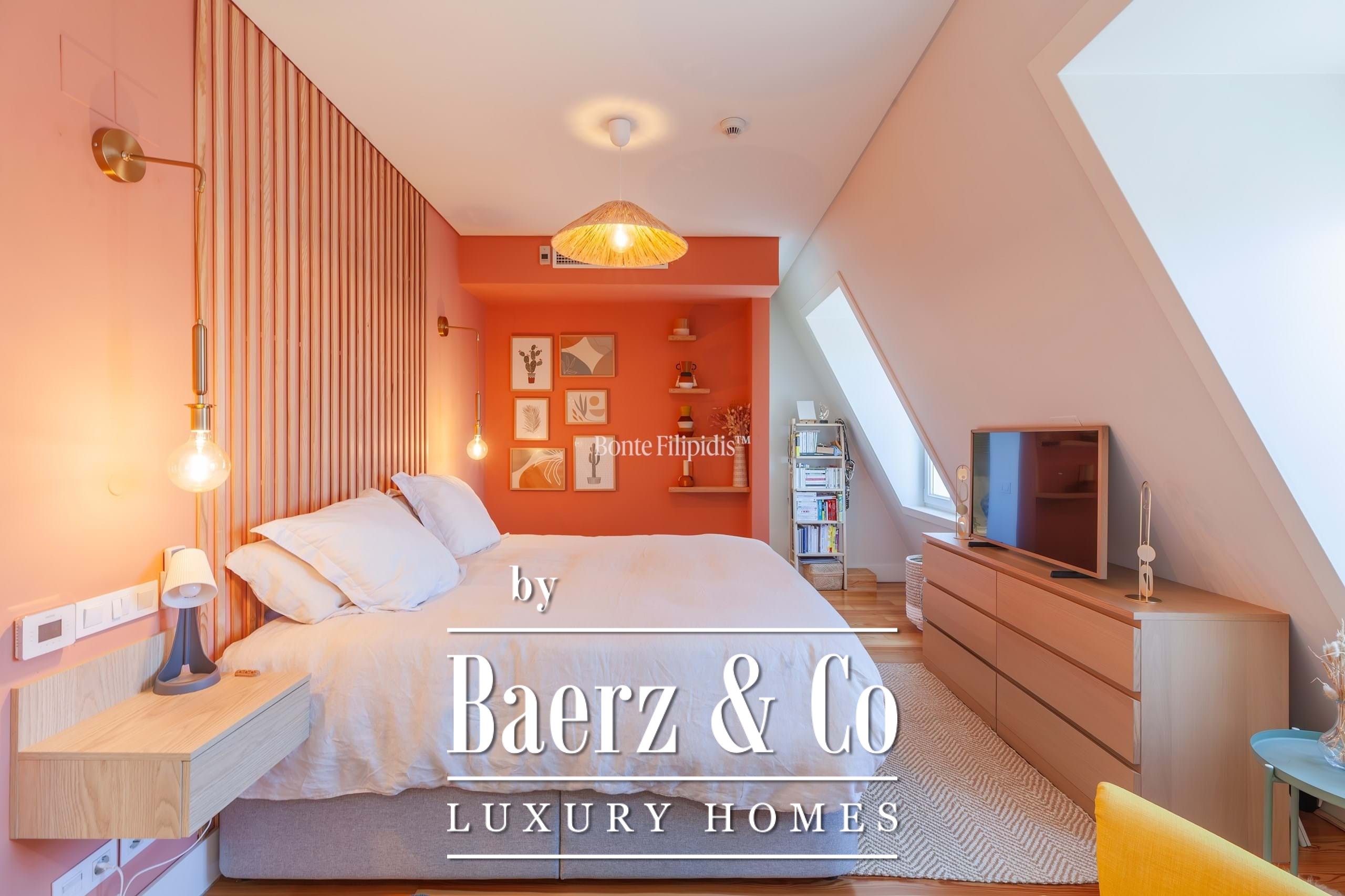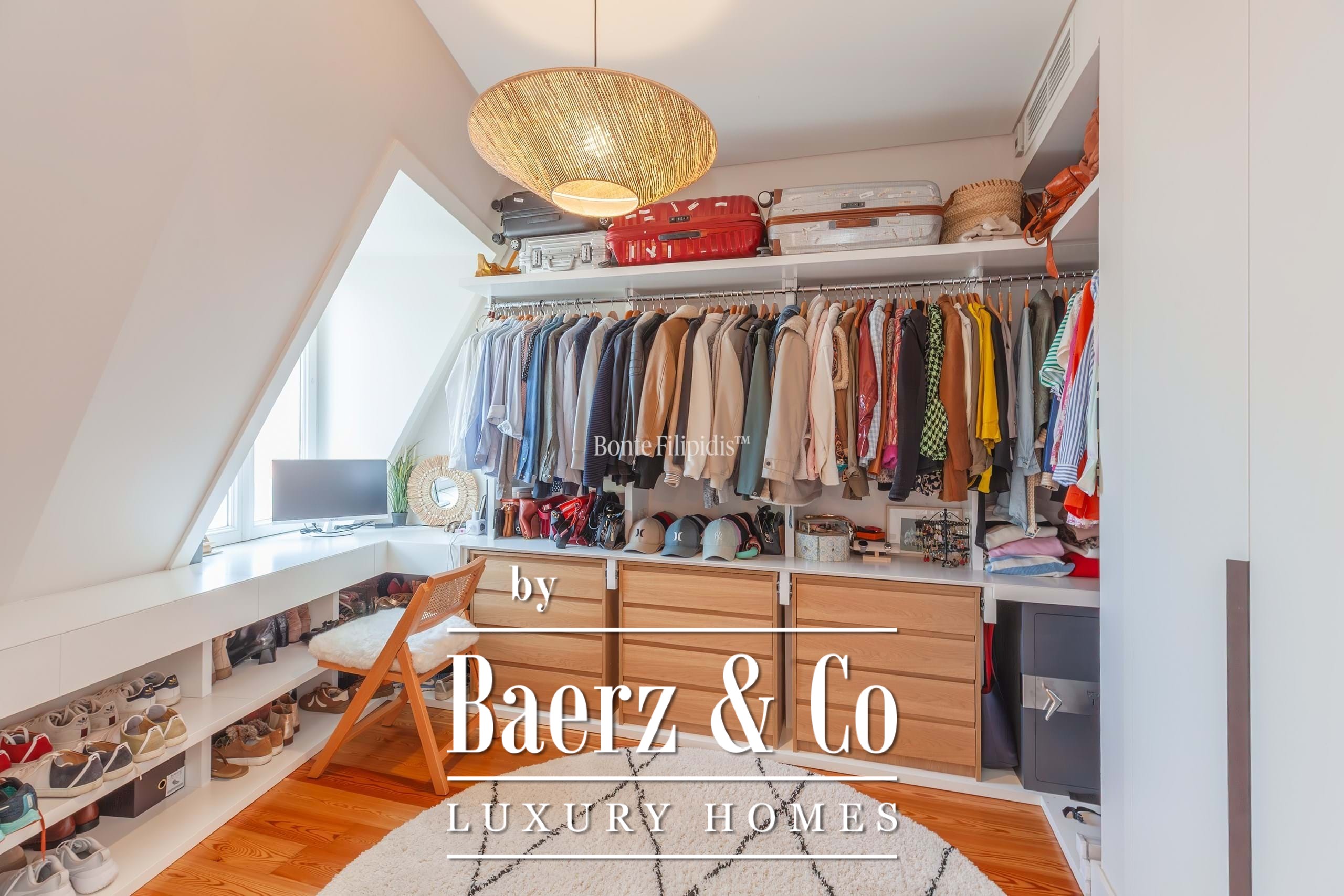 Originally a four-bedroom penthouse, one of the bedrooms has been transformed into a spacious walk-in closet adjoining the master suite. Spanning 197 sqm of interior space, the lower level houses the bedrooms, four bathrooms, and a balcony, all bathed in natural light from large windows that frame breathtaking views of Lisbons castle.