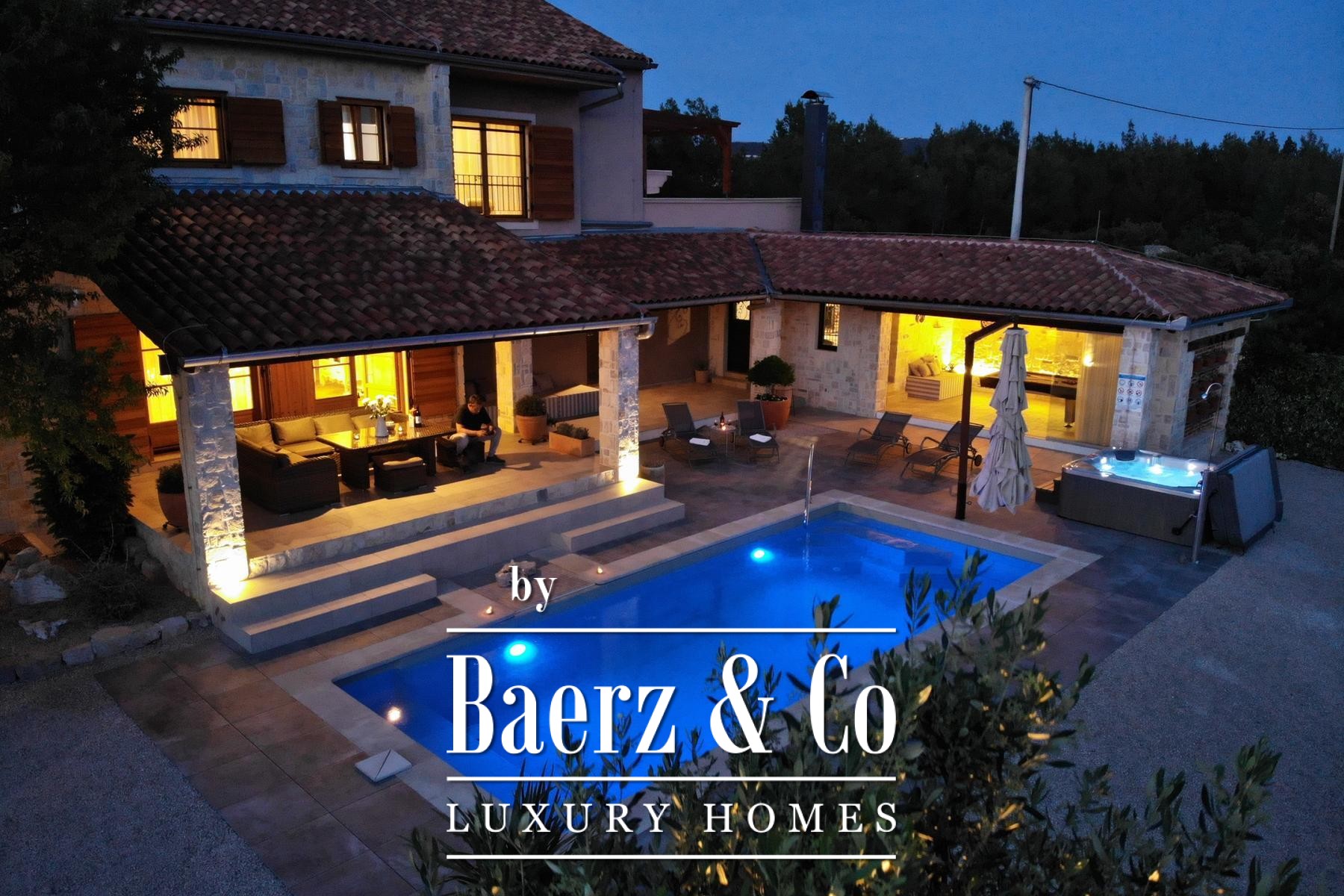 Šibenik, Martinska, beautiful stone villa with a swimming pool, garden and playground renovated in 2015. The size of the villa is 315.62 m². It is secluded in a protected area, which guarantees privacy now and in the future.It is built on 2 floors on a plot of 3680 m². It consists of a ground floor with a living room with a dining room, a kitchen, a toilet, a laundry room and a bedroom with a private bathroom. The living room opens onto large covered terraces by the pool, sundeck and jacuzzi. Internal stairs lead to the first floor where there are 3 bedrooms, each with a private bathroom, a sauna and two terraces covered with a pergola. Next to the house there is also a machine room, a tavern with a fireplace and a room with billiards
