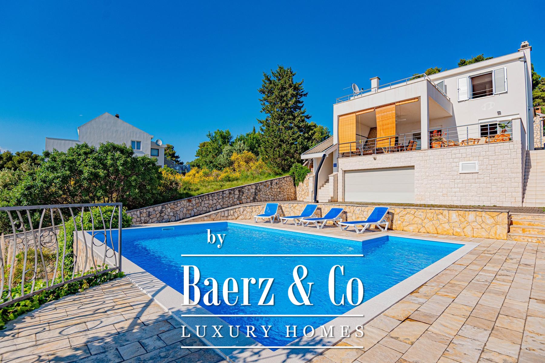 Šibenik, Žaborić, beautiful house with a swimming pool and panoramic sea views, total area 438 m² built in 2004. It is being sold fully furnished and equipped, and ideal for a vacation or tourist rental.Built on a plot of 1215 m², it consists of a basement with a garage for two cars, a machine room, a tavern, and two storage rooms. On the ground floor there is a spacious living room with a kitchen and a dining room, a storage room, laundry room and a toilet. The living room opens onto