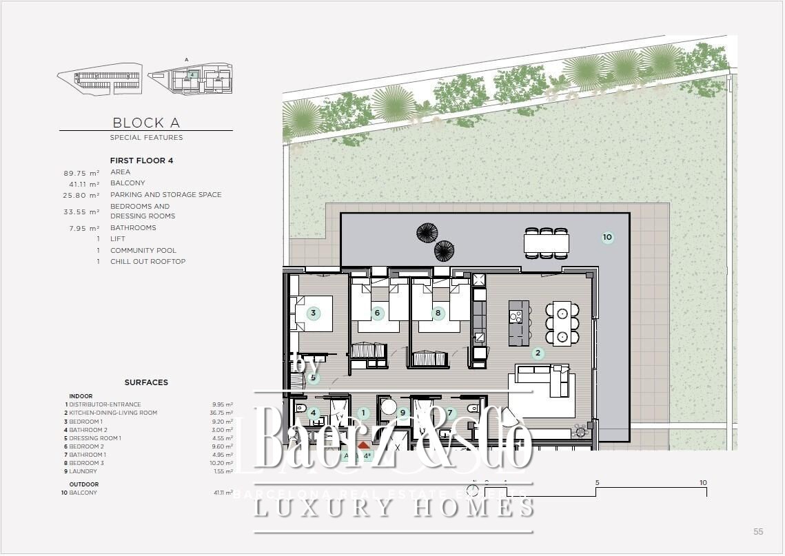 Inside, neutral palettes, custom-built wardrobes, and integrated kitchen appliances create measured sophistication. Kitchens feature sleek Dektongroup countertops in whites and eucalyptus tones, while bathrooms offer walk-in showers, suspended fixtures, and muted lighting that inspires quiet retreat.