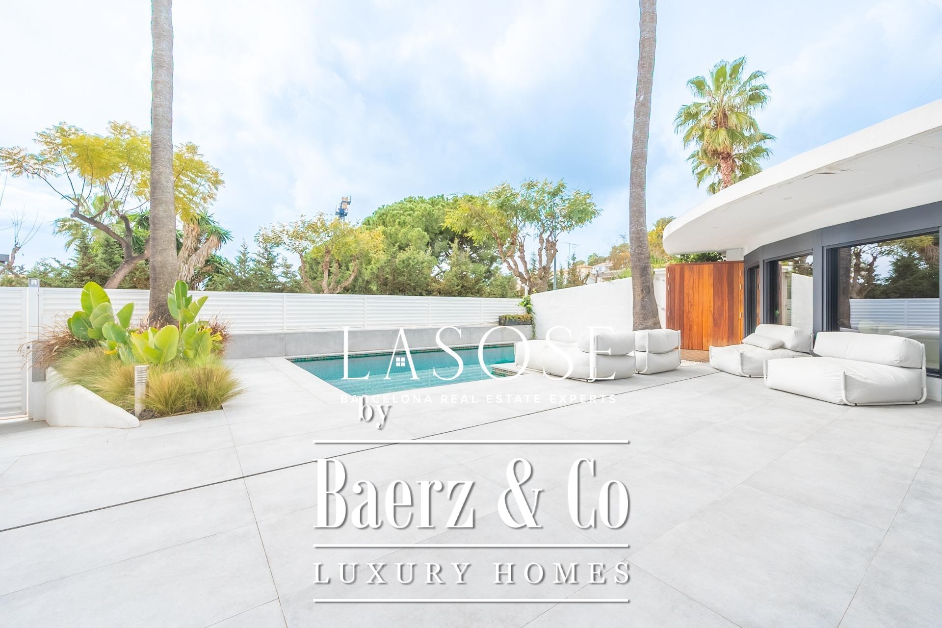 Villa Sitges Vallpineda introduces elevated Mediterranean living in a discreet residential setting. This 100 m² single-storey villa has been fully renovated to precise contemporary standards, offering two bedrooms and two bathrooms that flow seamlessly into generous living spaces. The property stands on a 278 m² plot, framed by stately palm trees and enhanced by open views, where tranquil indoor and outdoor environments merge. Floor-to-ceiling windows illuminate the main living and dining area, integrating naturally with the terrace and private pool—ideal for family gatherings or quiet reflection.