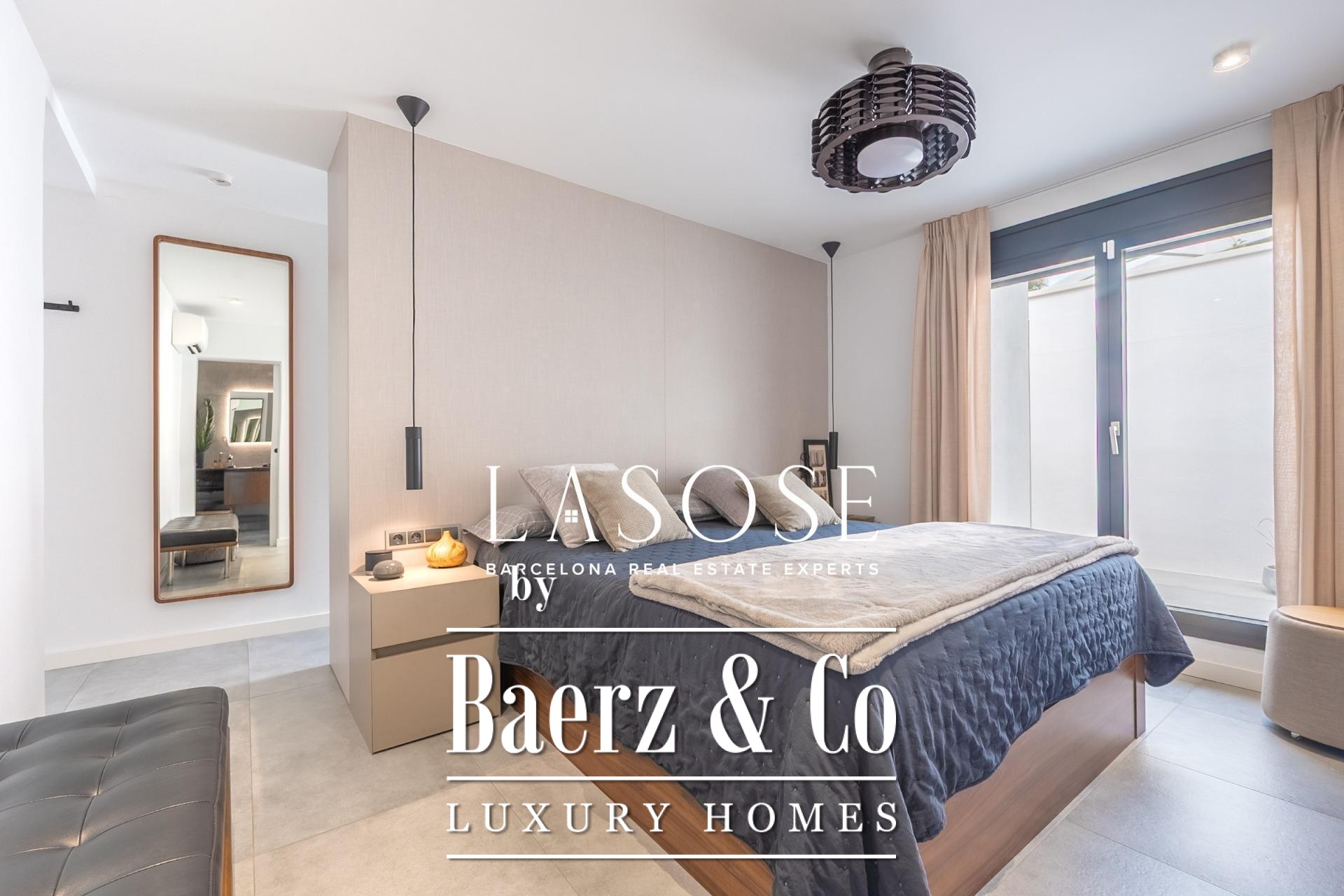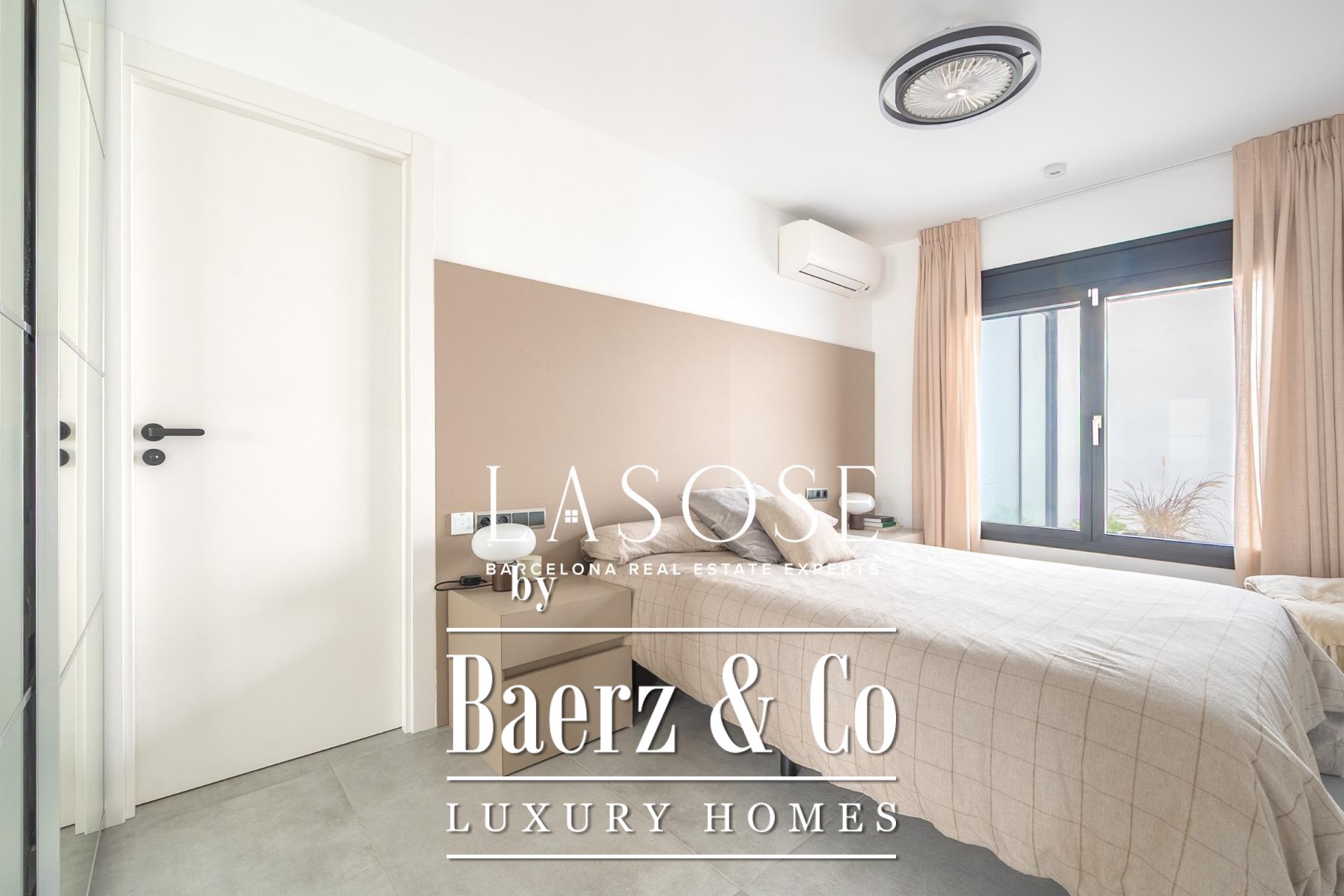 A modern kitchen, finished with premium materials and appliances, connects both to the heart of the home and to an inviting covered dining terrace for effortless alfresco entertaining. The primary suite features a designer bathroom and a spacious dressing area, while the second bedroom offers direct access to a full bath—balancing comfort with elegant privacy. Year-round climate control is ensured by hot and cold air pumps in every room; double-glazed windows and adjustable blinds reinforce thermal and acoustic insulation. Details from lighting to finishes embody timeless restraint.