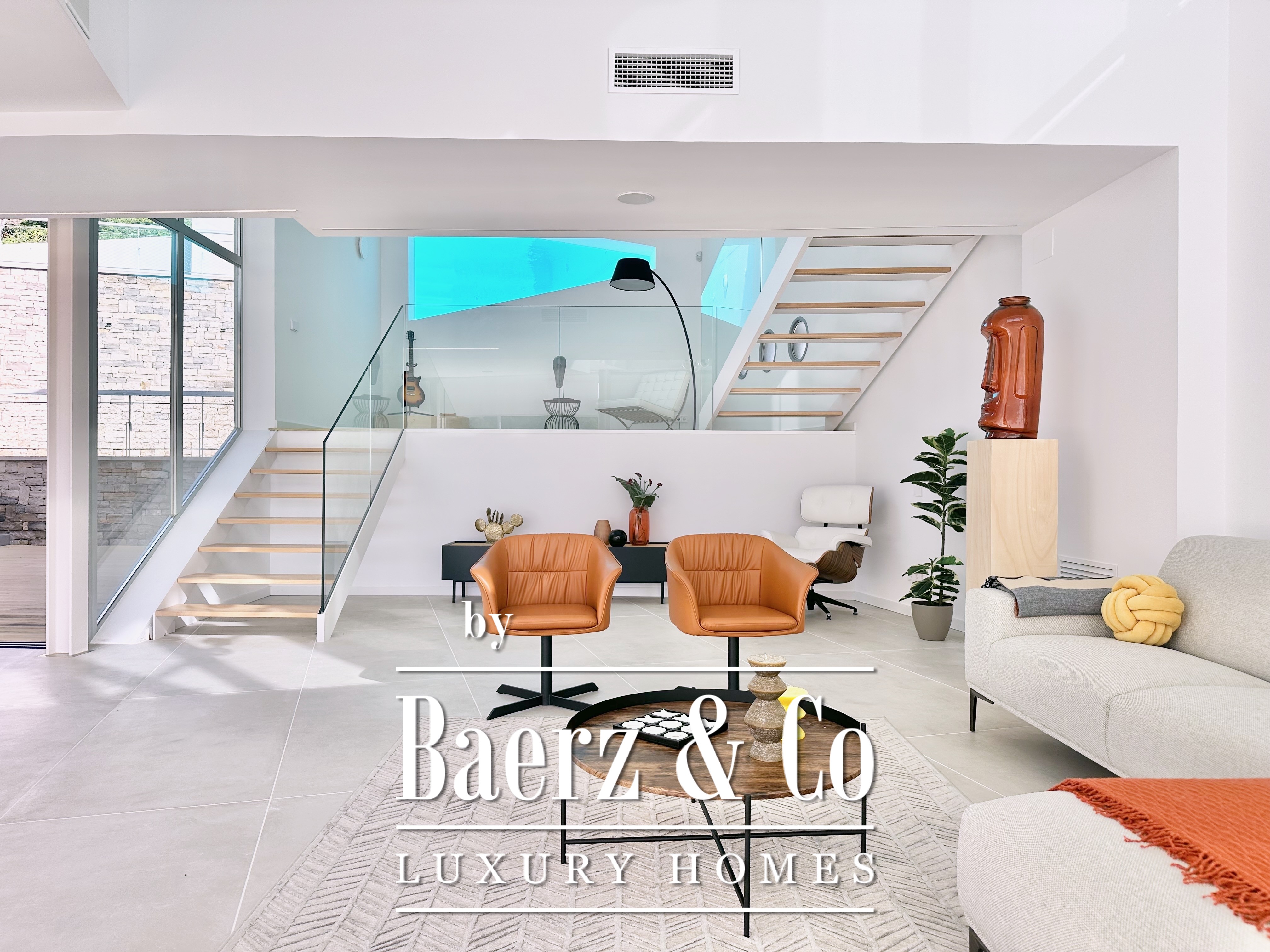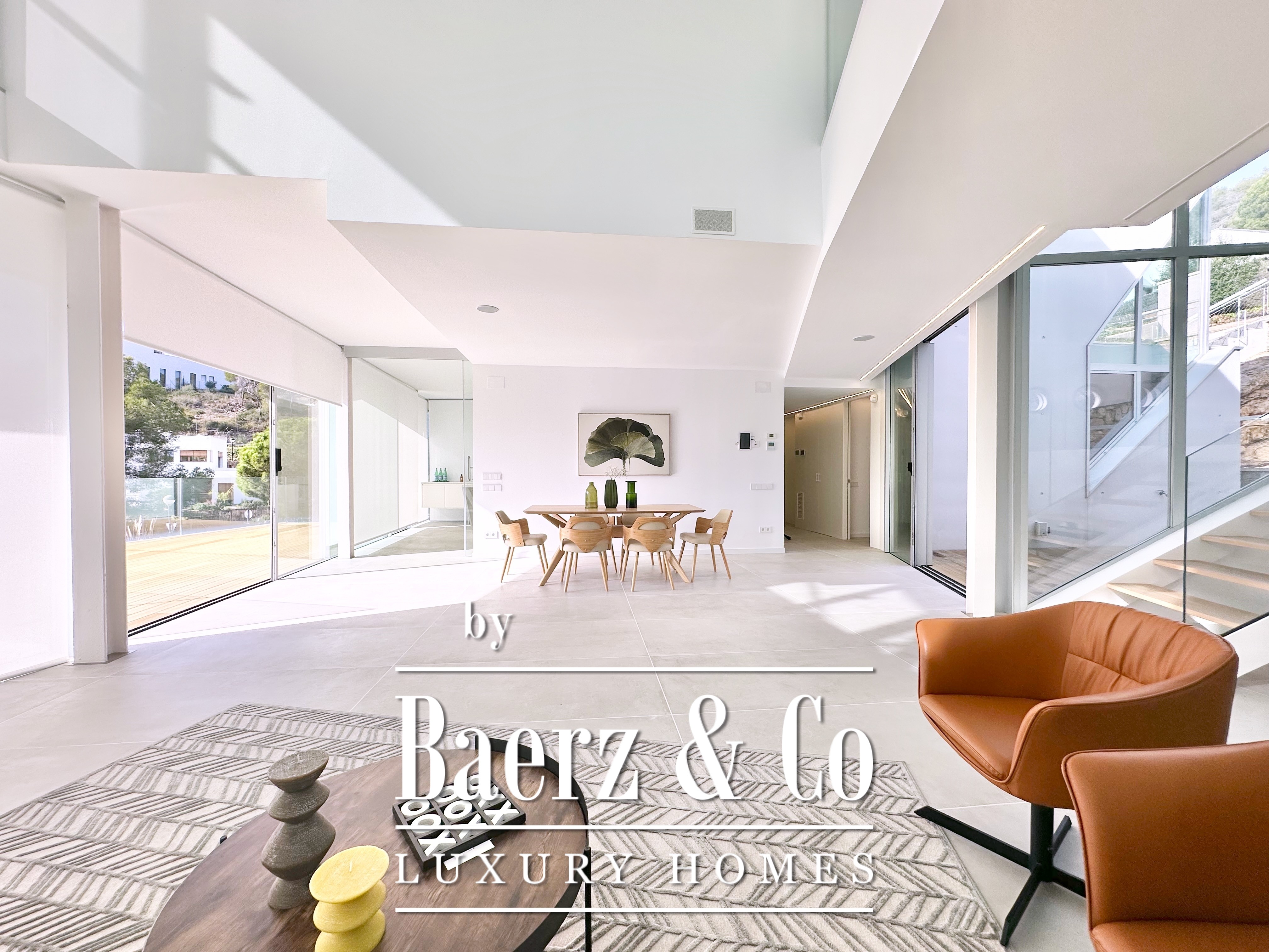 The home spans two principal levels above a versatile basement, connected by a private lift. On the lower ground, a garage accommodates four vehicles, complemented by a wine cellar, storage, laundry, and technical rooms. The main floor, anchored by an 80 m² living-dining area beneath double-height ceilings, is framed by floor-to-ceiling glazing, offering generous natural light and direct access to a covered sea-facing terrace. The kitchen is finished with contemporary white cabinetry, a central island, and integrated Siemens appliances, adaptable via a sliding glass partition. A guest suite with en-suite bathroom and a guest toilet complete this level.