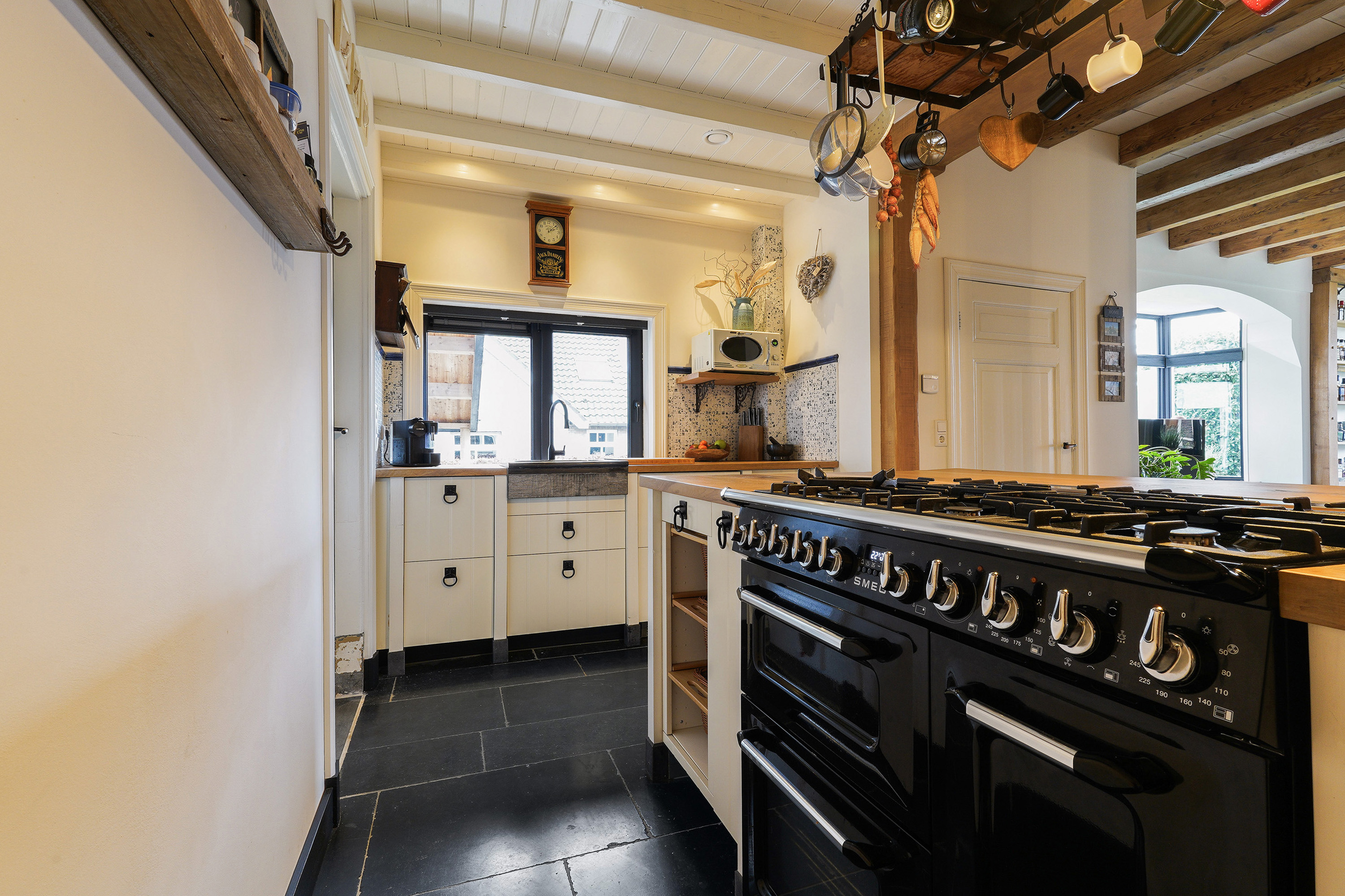 De sfeervolle keuken vormt één geheel met de gezellige woonkamer en is voorzien van een kookeiland met aangrenzend een houten eettafel, veel bergruimte en uiteraard alle luxe inbouwapparatuur. En dan... bereikbaar via de bijkeuken, de garage of de veranda aan de achterzijde… de bar. Compleet uitgevoerd met koelingen, een eigen toiletruimte met toilet en urinoir en een indrukwekkende vide tot in de nok. Zelfs vanaf de zolderverdieping kijk je via die vide weer de bar in. Dit is een ruimte die je moet ervaren.