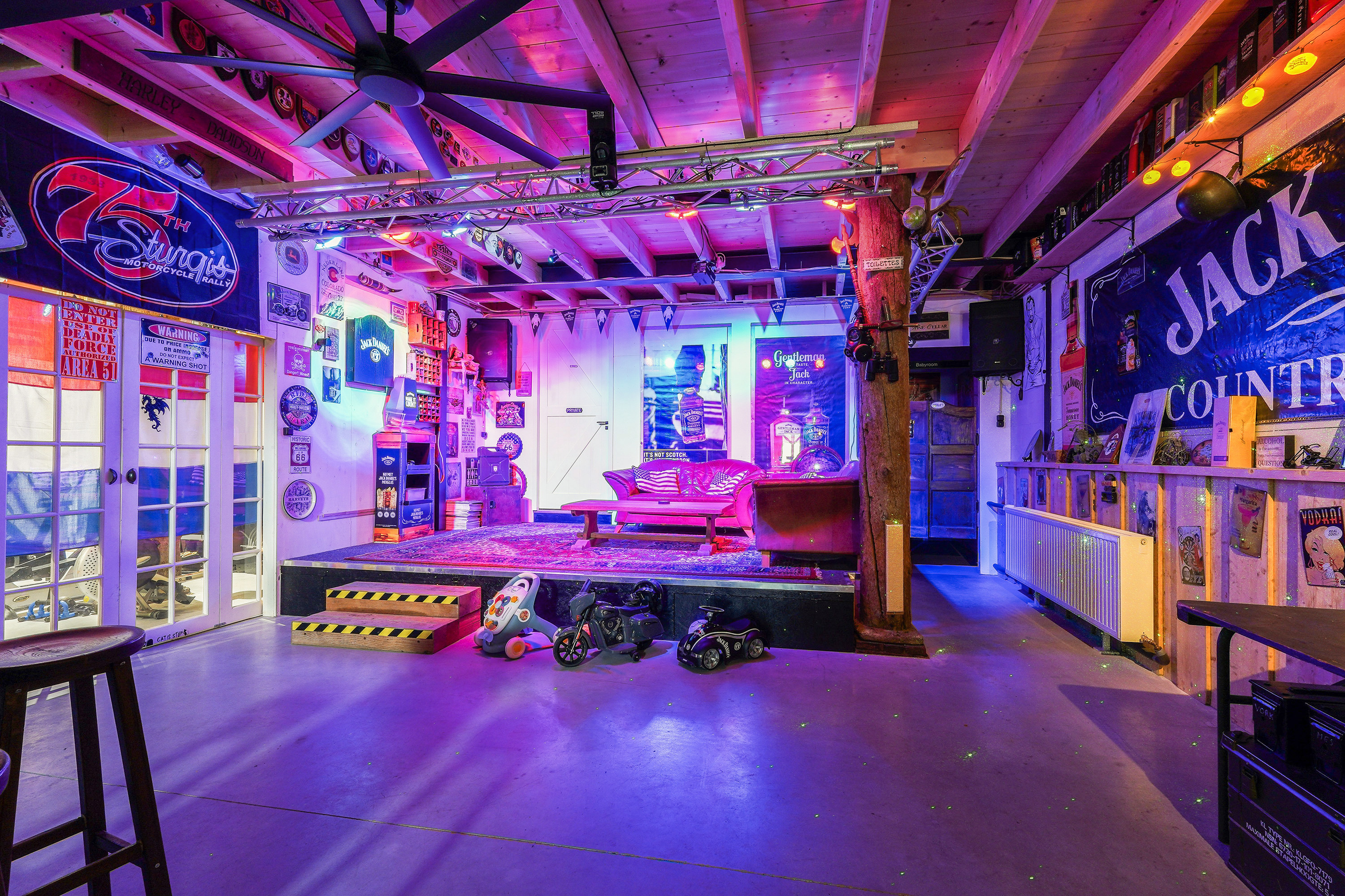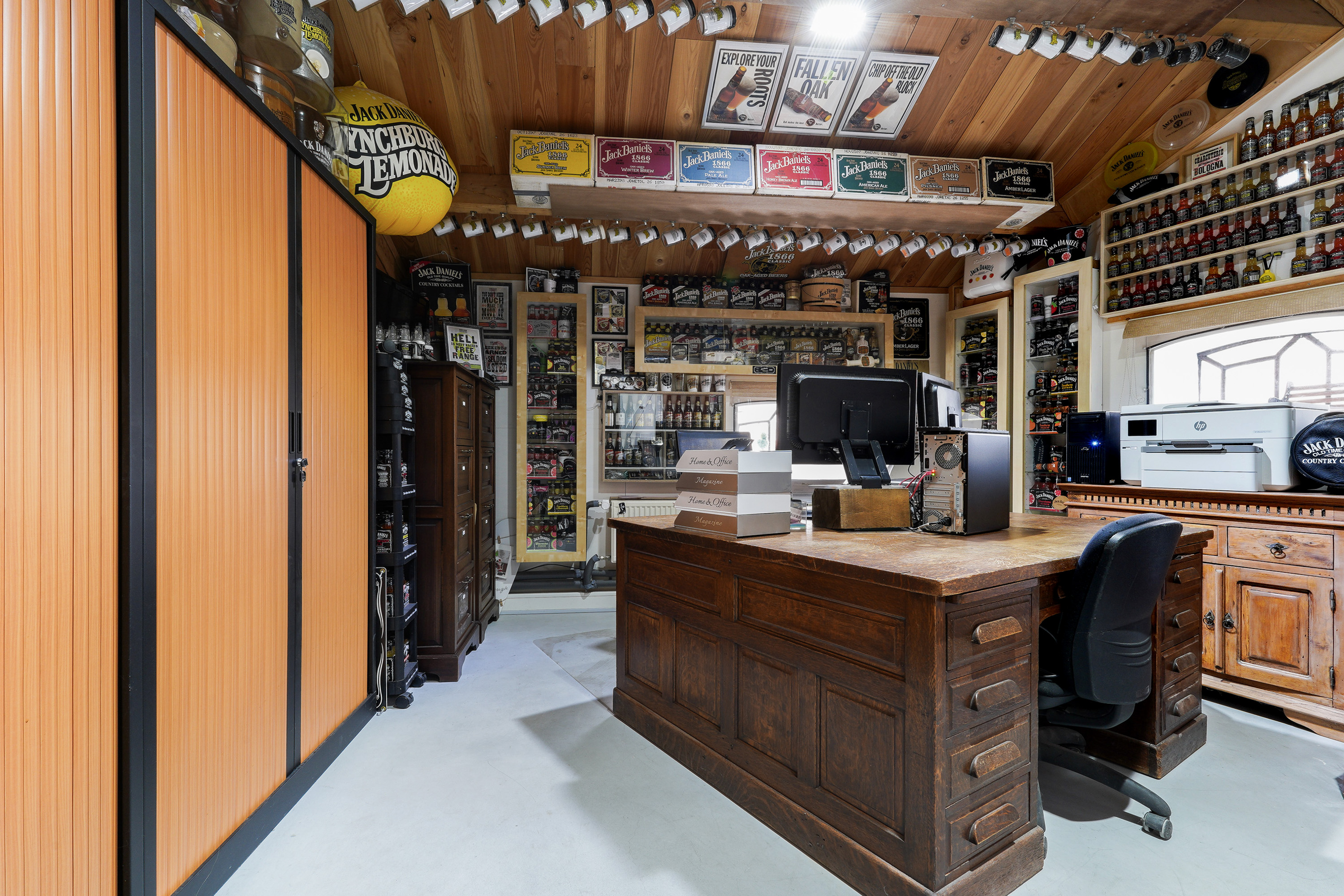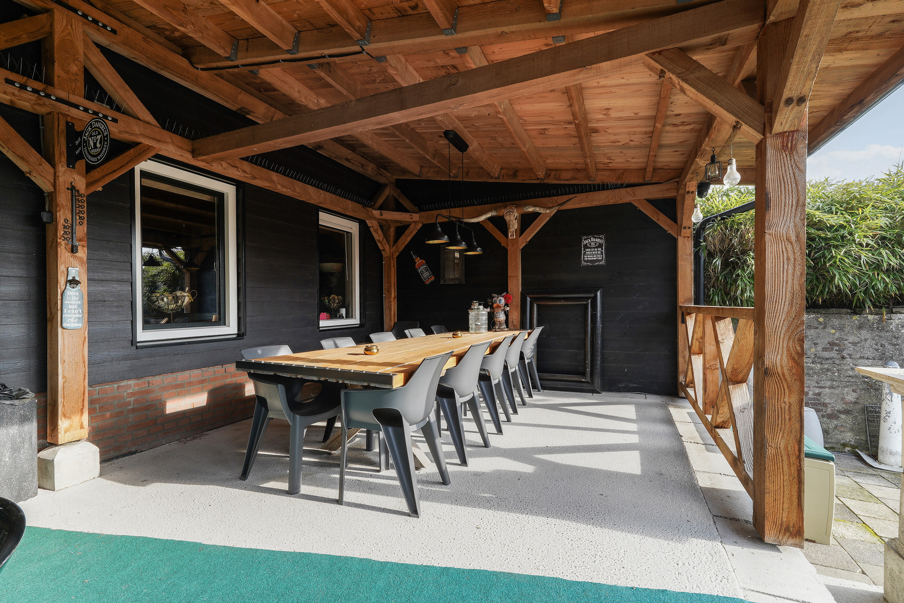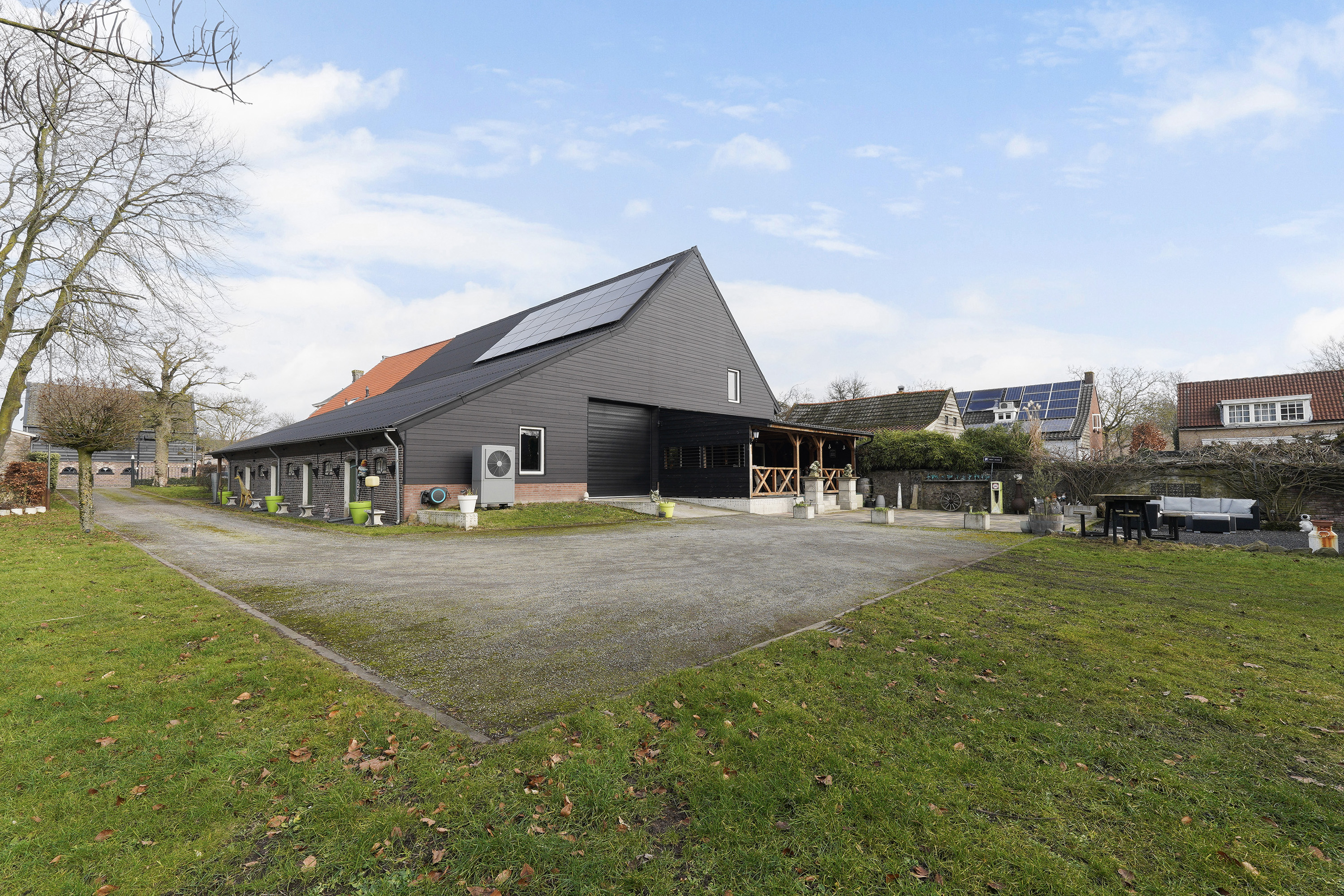 De aangrenzende garage doet zijn naam geen eer aan. Met een oppervlakte van circa 160 m², een grote sectionaaldeur aan de achterzijde van 3,5 meter breed én hoog, een vliering en extra inpandige ruimtes is dit een droom voor liefhebbers van auto’s, stallen van een camper, verzamelaars of hobbyisten. Een grote bus rijdt hier moeiteloos naar binnen. En dan hebben we het nog niet eens over de overige inpandige ruimtes gehad, want met de zolder boven de bar beschikt de woning in het geheel over ruim 300 m² aan extra ruimte naast de woonoppervlakte.