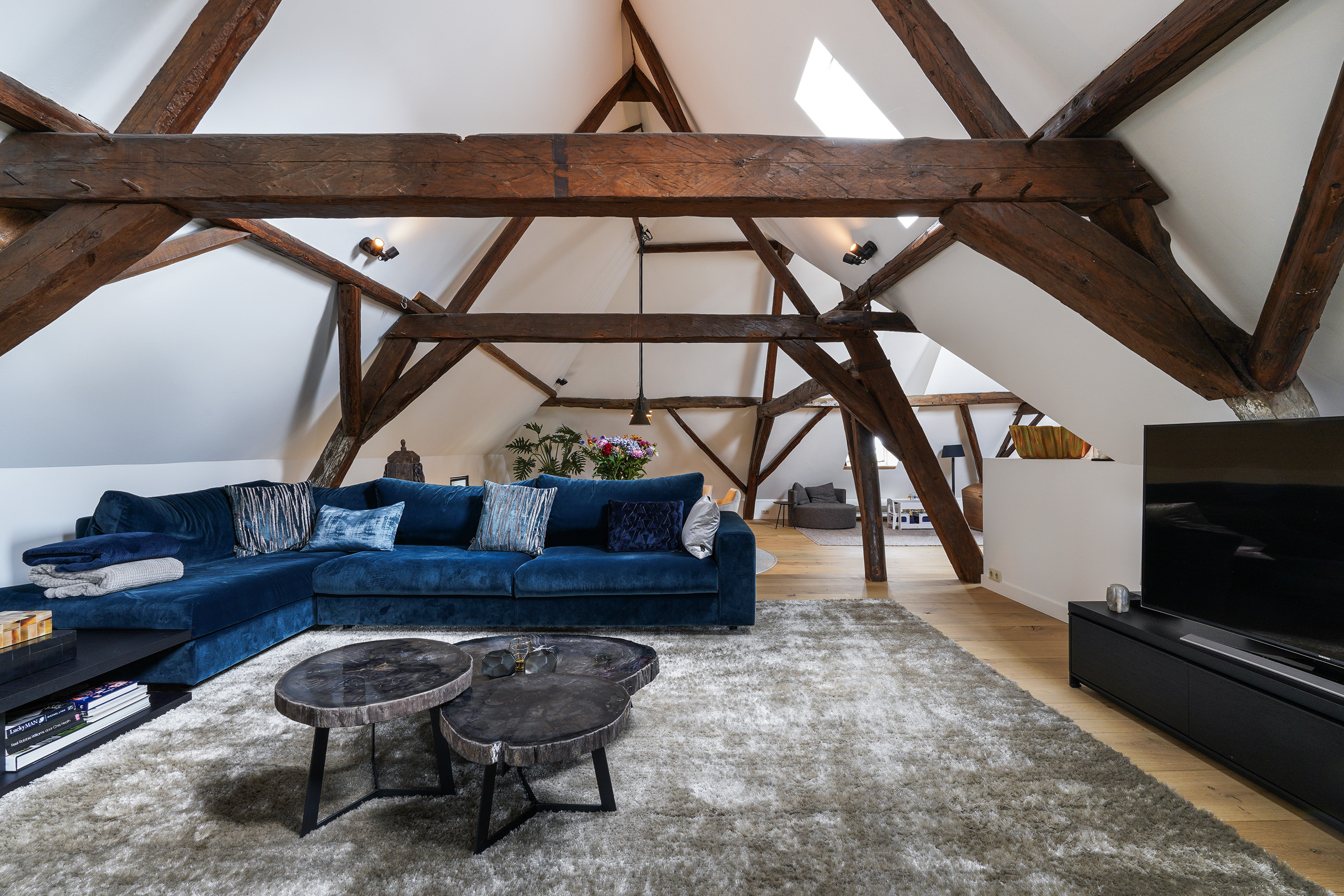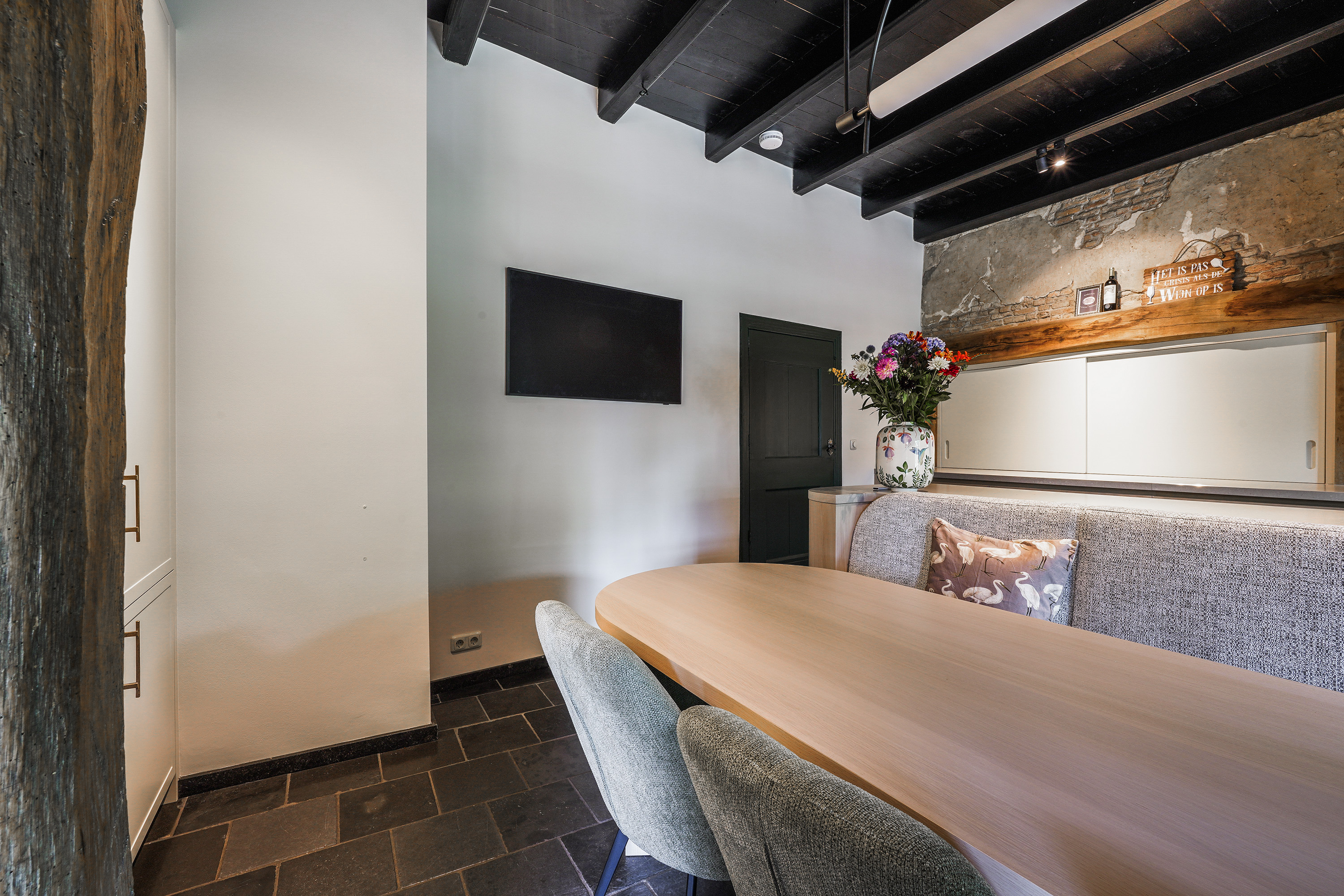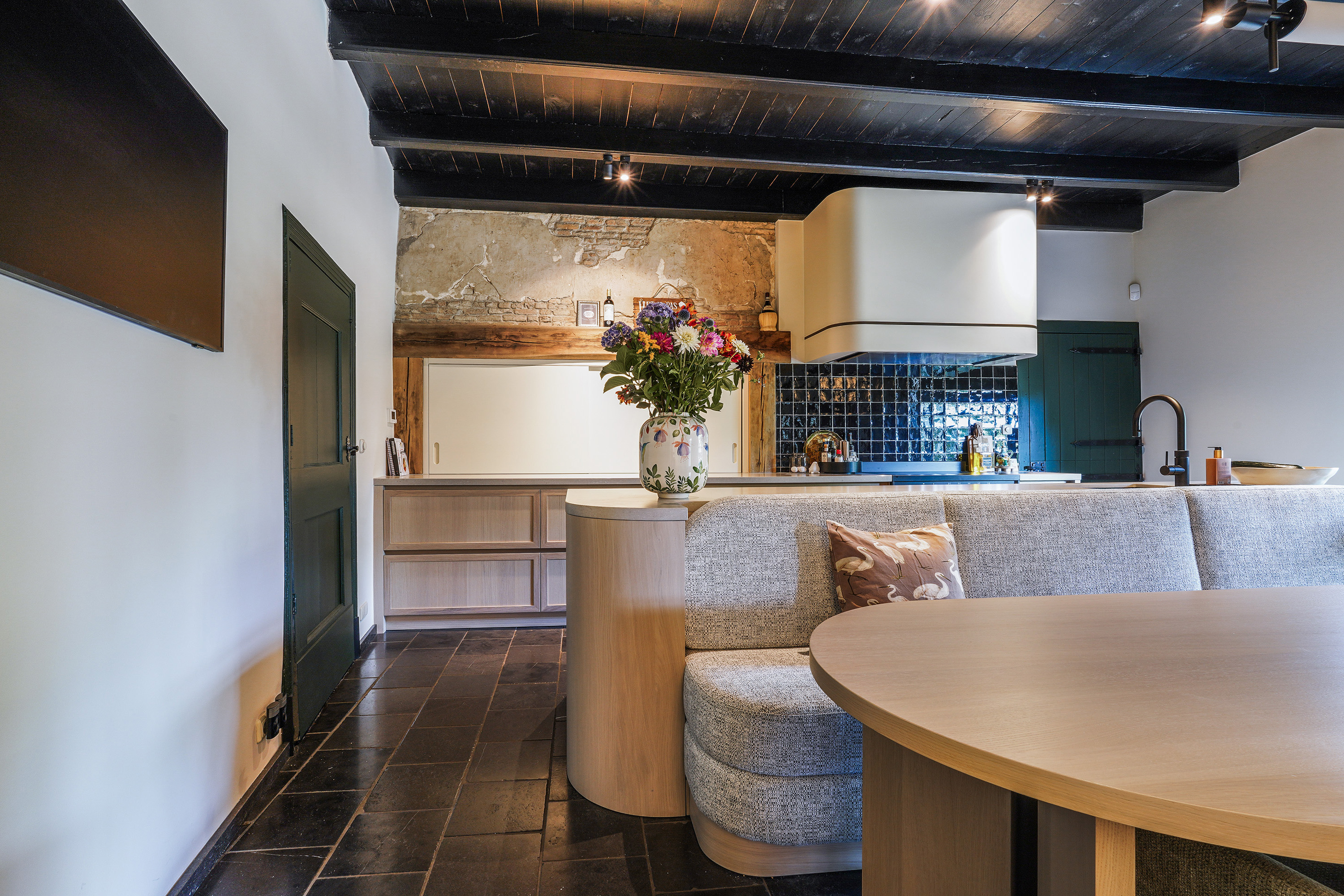 Heritage house Sprang-Capelle embraces history and considered renovation, offering a rare 420 m² living area within a 658 m² plot. This national heritage property is marked by extraordinary provenance, its 17th-century origins woven into exposed wooden beams, vaulted ceilings, and a grand sense of arrival. The main living room of nearly 90 m² is anchored by a pellet stove and illuminated by tall windows, with volumes softened by white plaster and timber floors. The heart of the home is a bespoke kitchen crafted in 2024, featuring custom cabinetry by Ecker Interieurbouw and generous space for dining, gathering, and quiet observation of the garden.