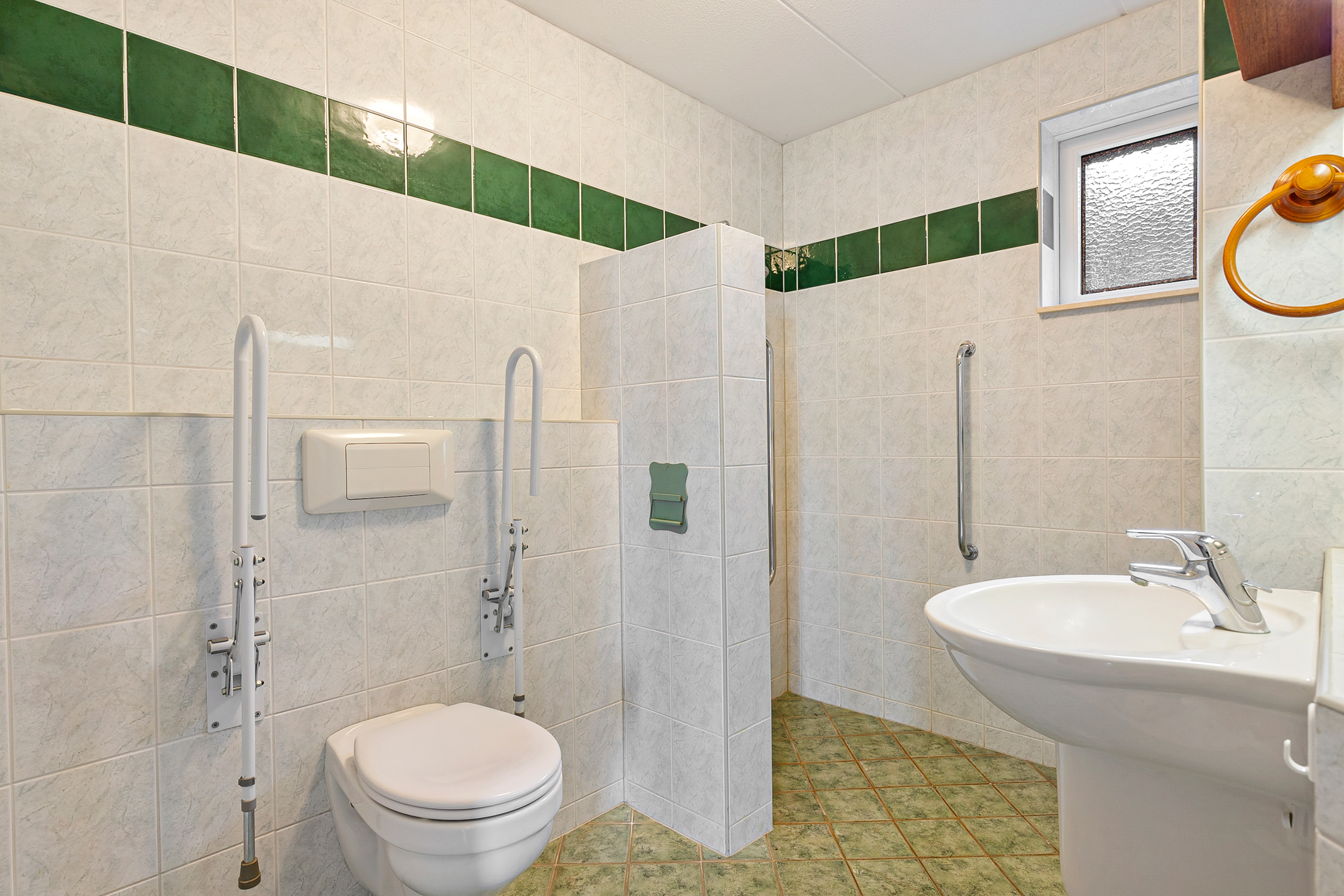 The spacious kitchen-diner is equipped with built-in appliances and features an attractive bay window overlooking the garden and meadows. Also on the ground floor are a utility room, a generous bedroom with garden doors, a bathroom with toilet, washbasin and shower, as well as access to the internal garage.